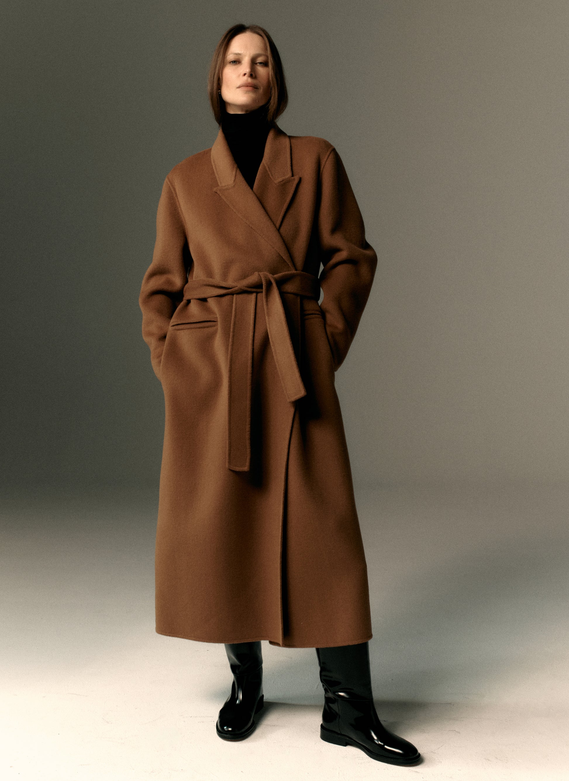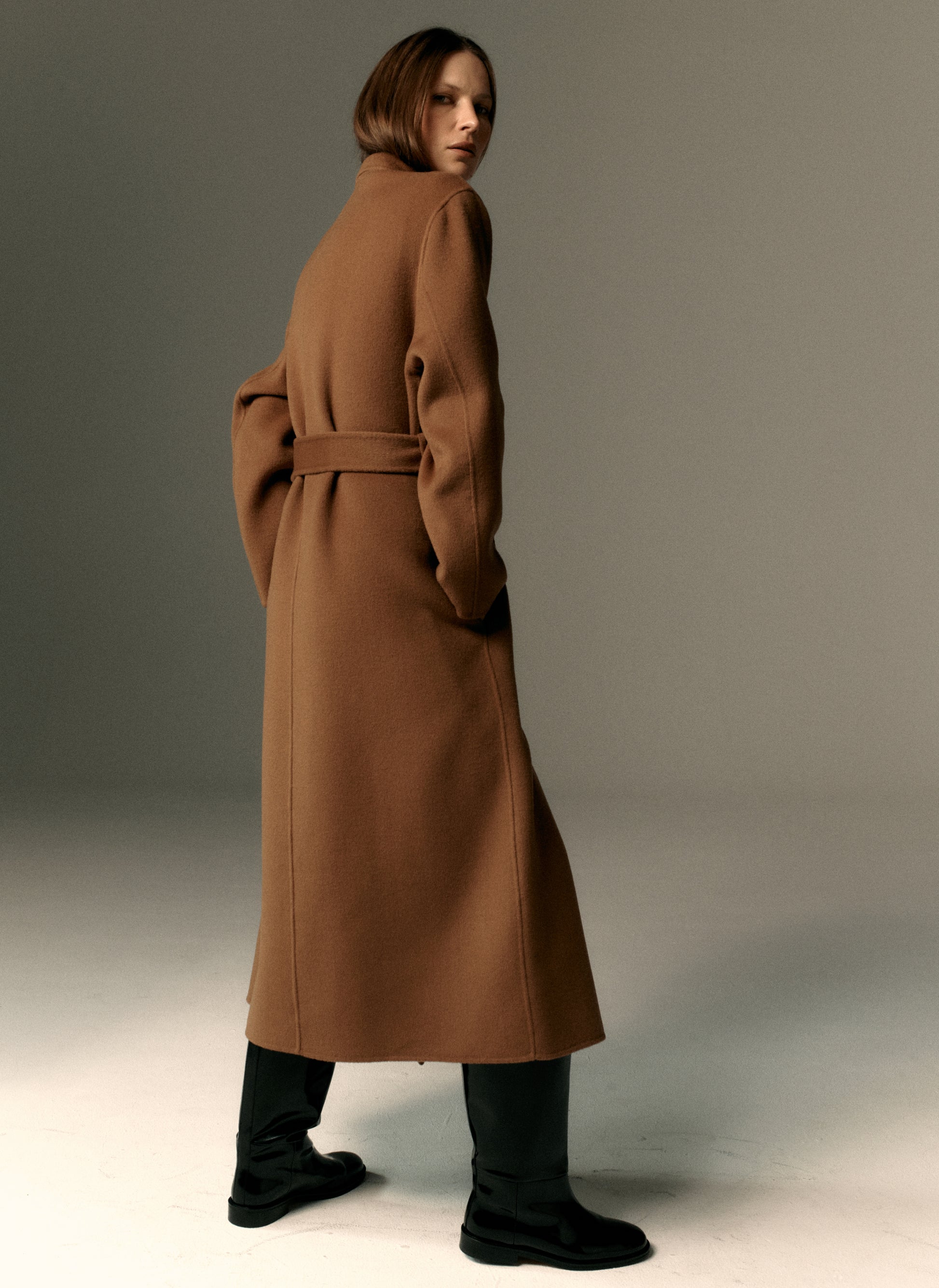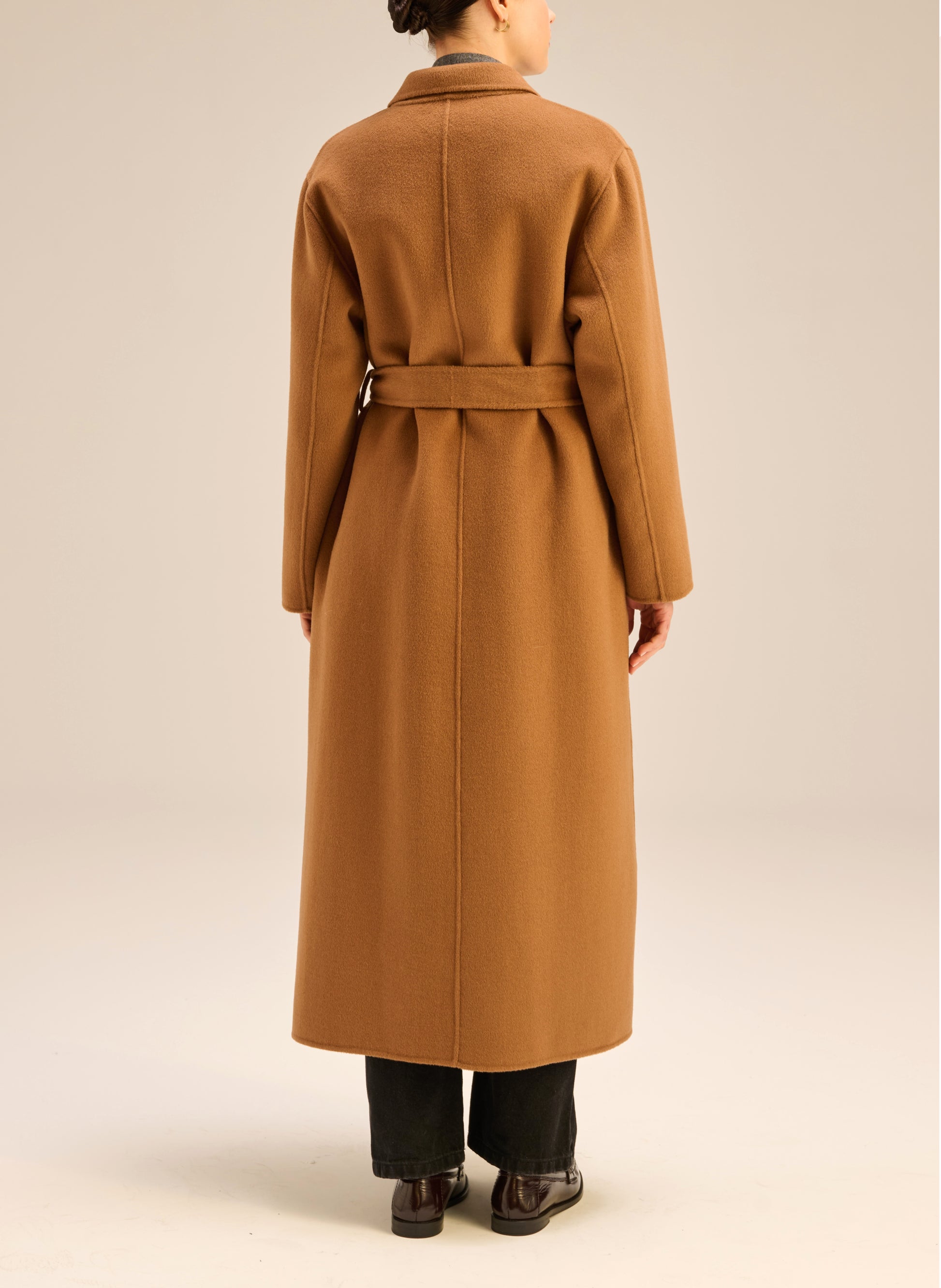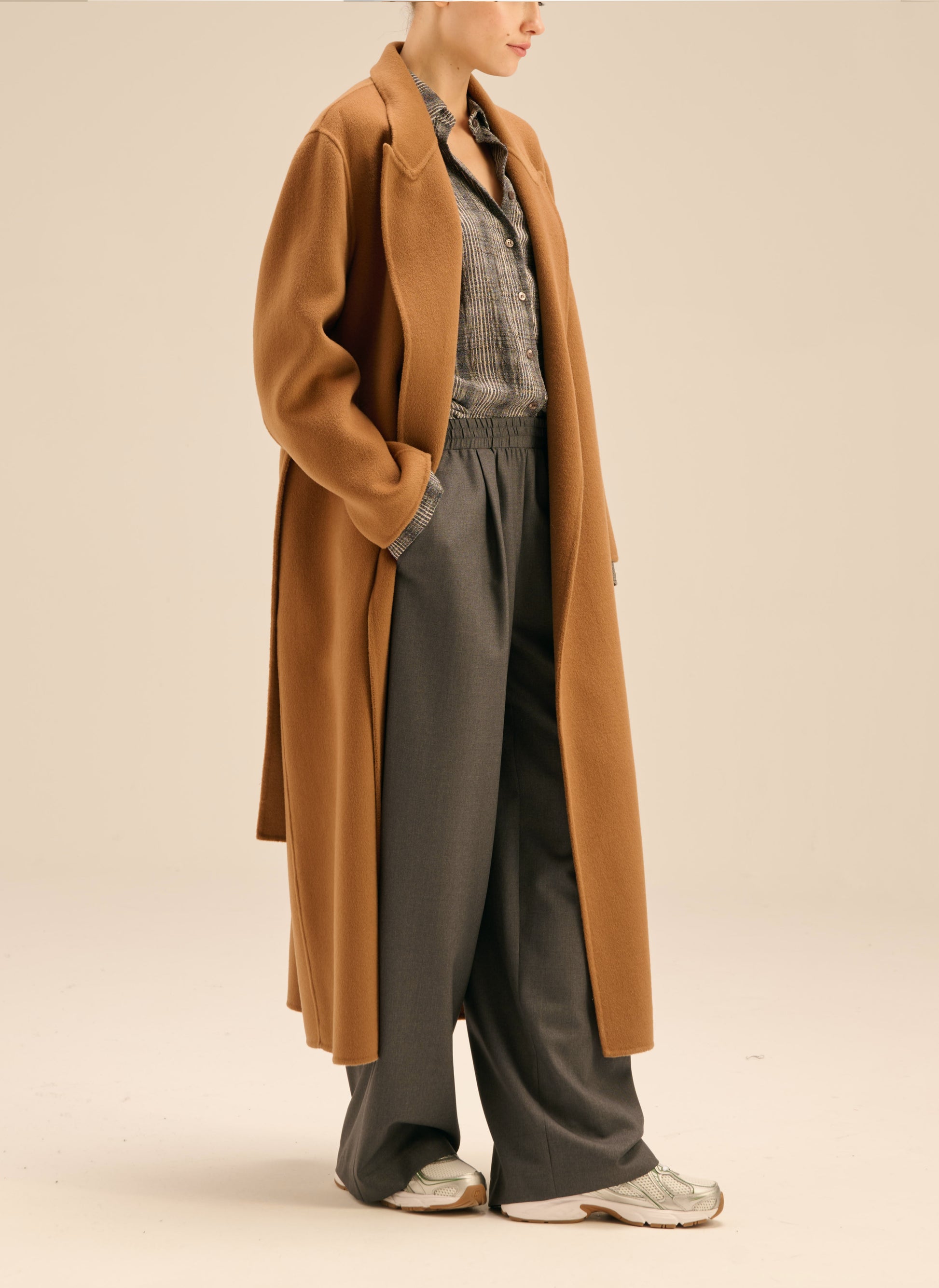 Płaszcz o szlafrokowym kroju i długości maxi w kolorze kamelowym. Model bez podszewki/ double face.
