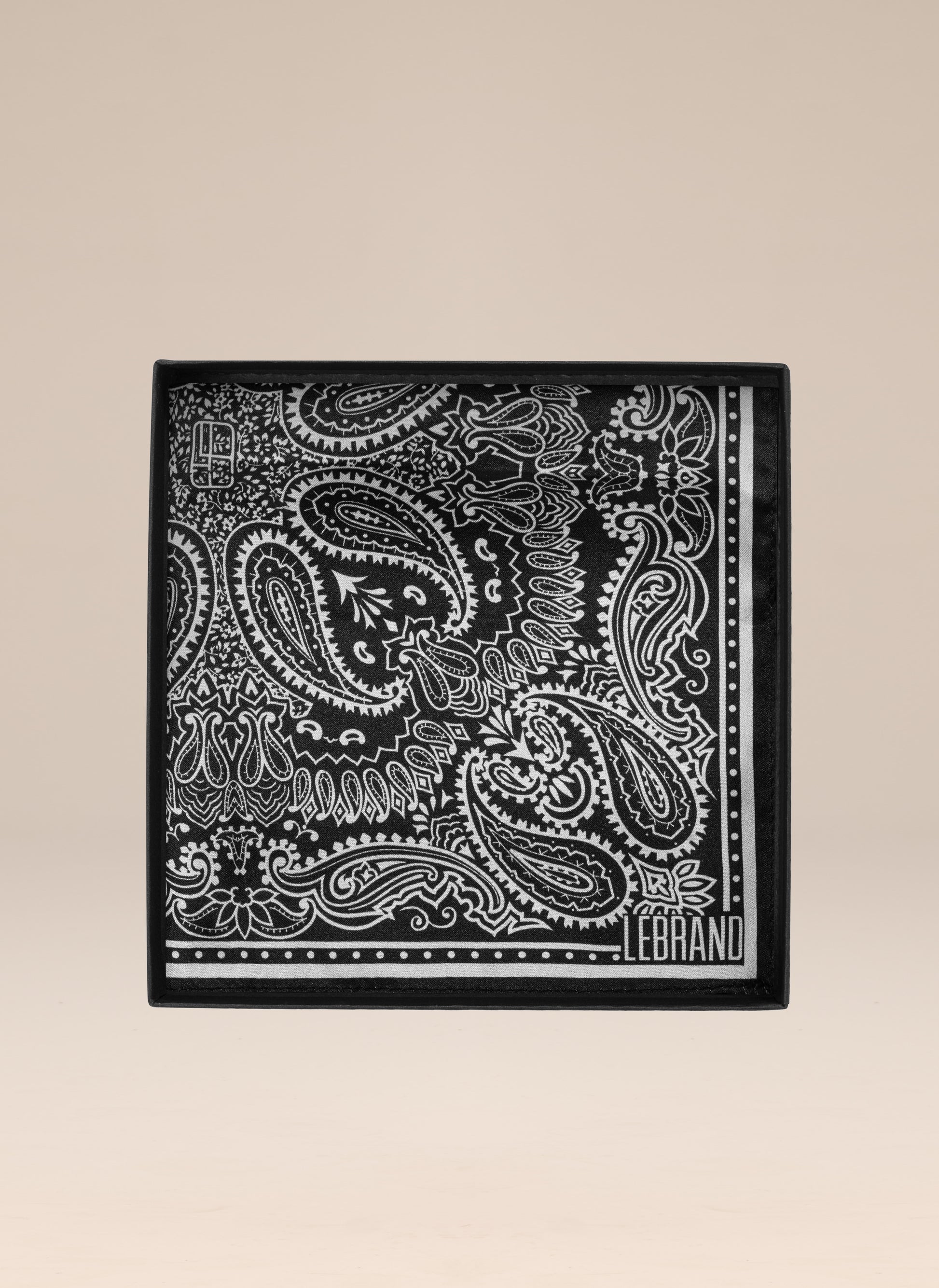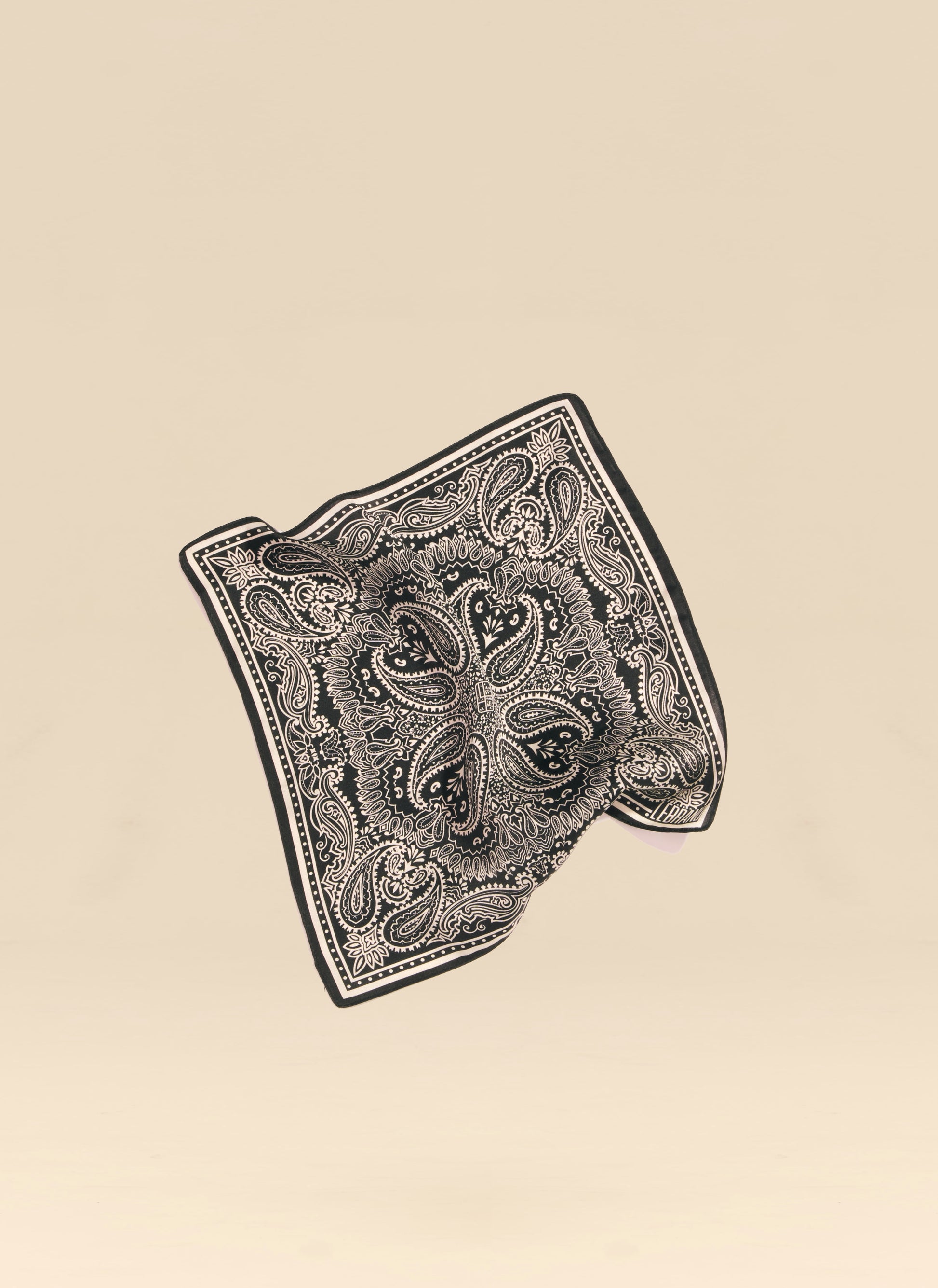 Uniwersalna poszetka jedwabna, ręcznie wykończona z rozpoznawalnym wzorem z bandany.