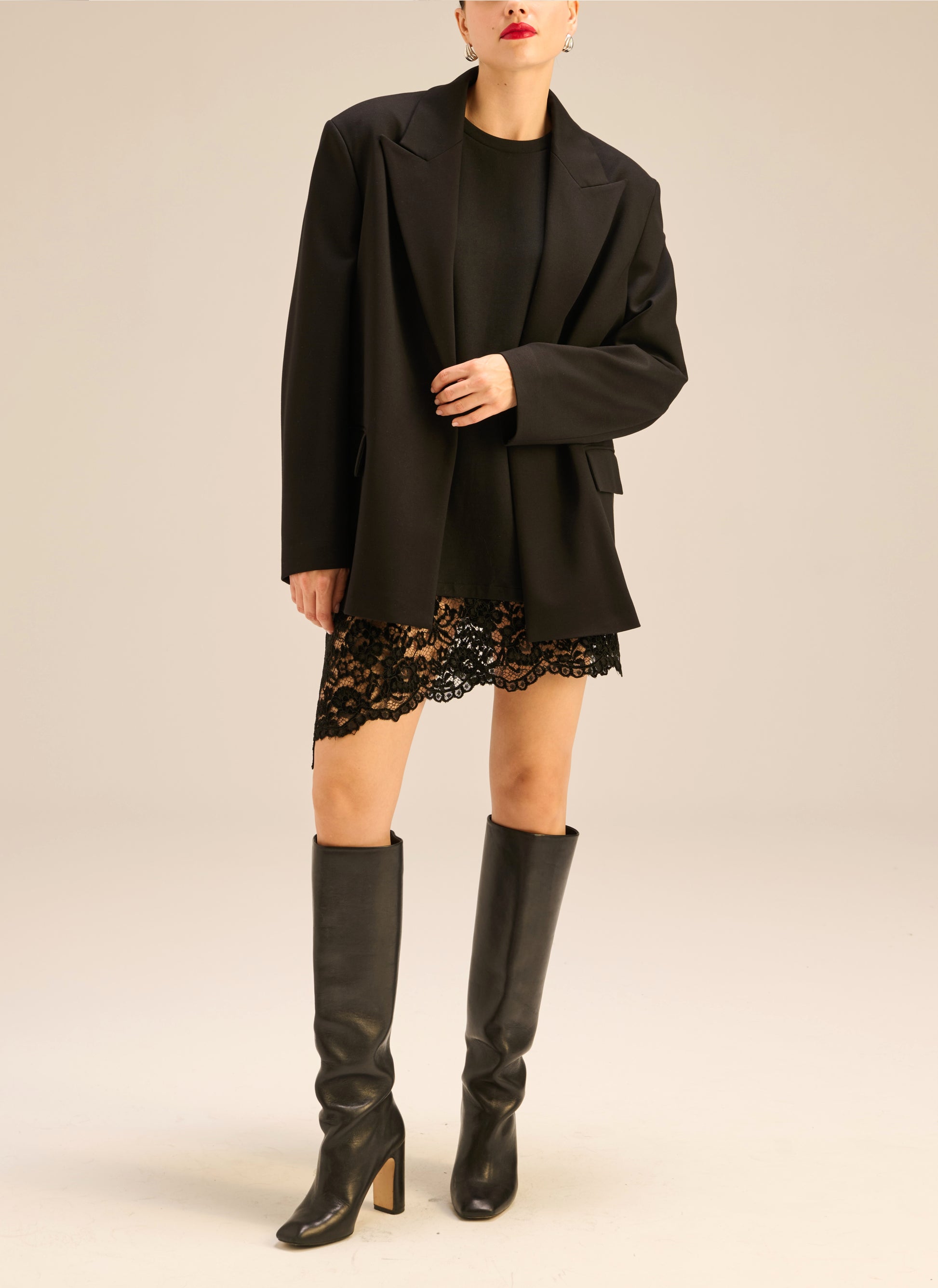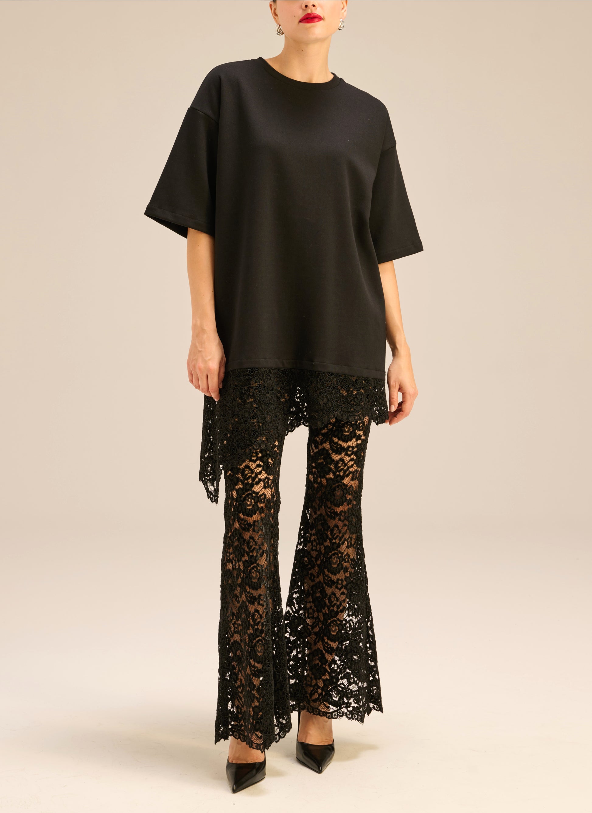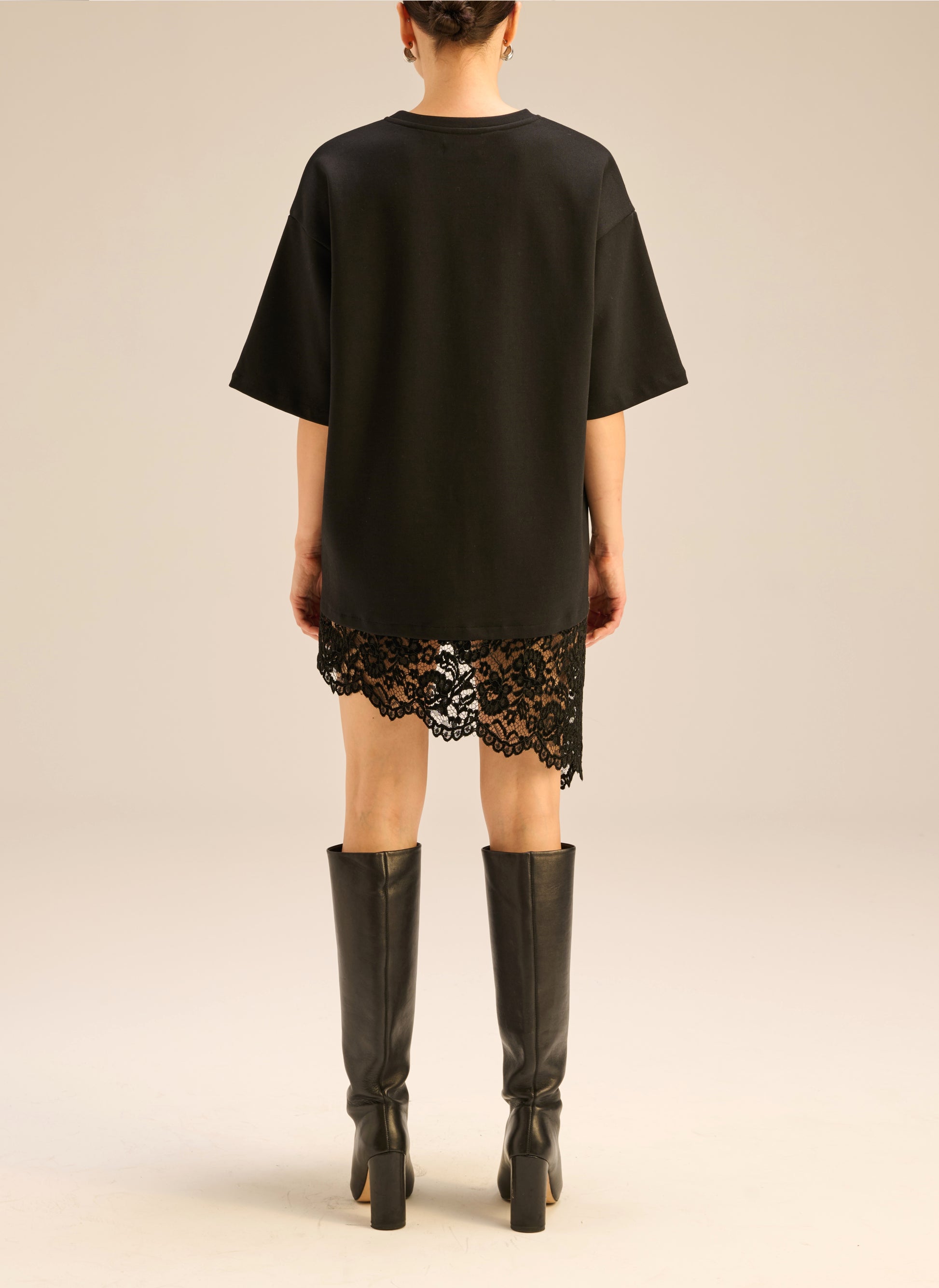 Sukienka o długości mini i kroju oversize, wykonana z miękkiej dzianiny w czarnym kolorze. Posiada okrągły dekolt, na dole jest wykończona asymetrycznym panelem z koronki.
