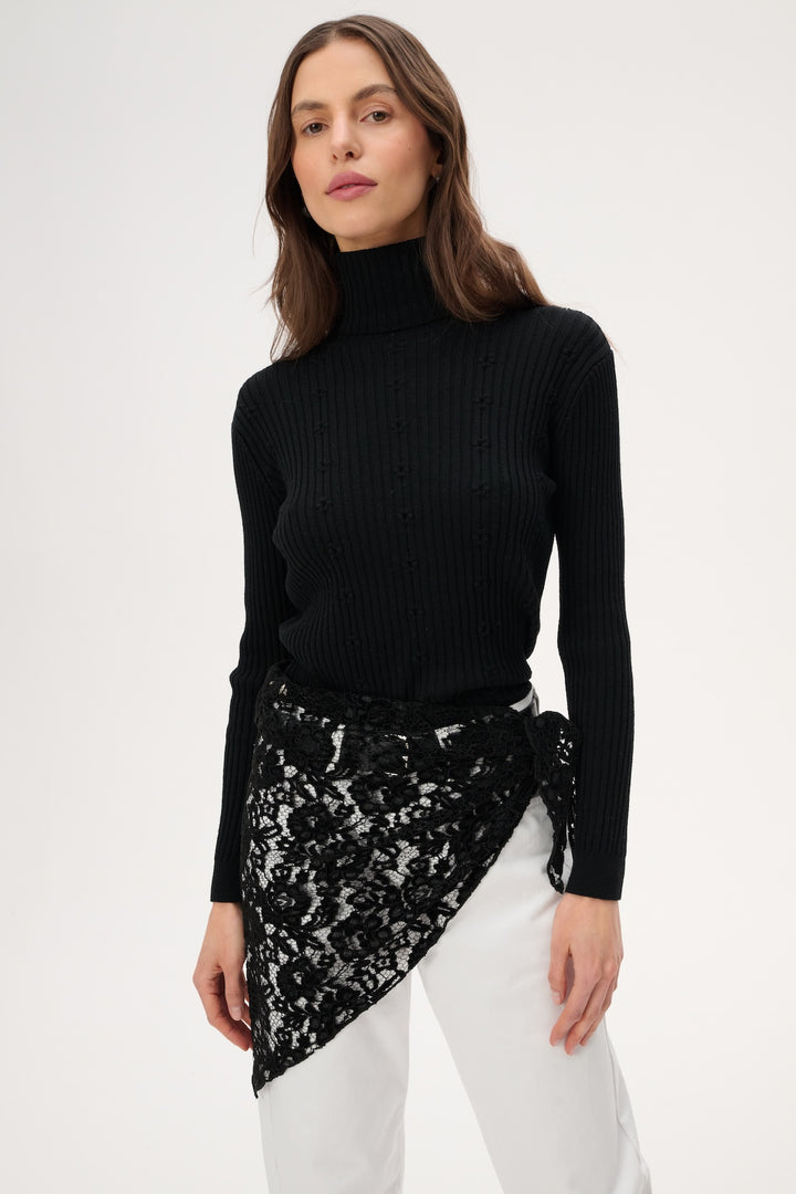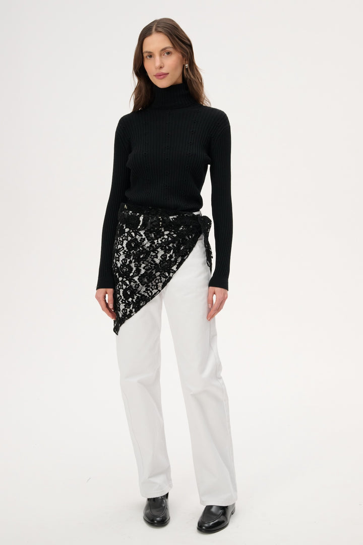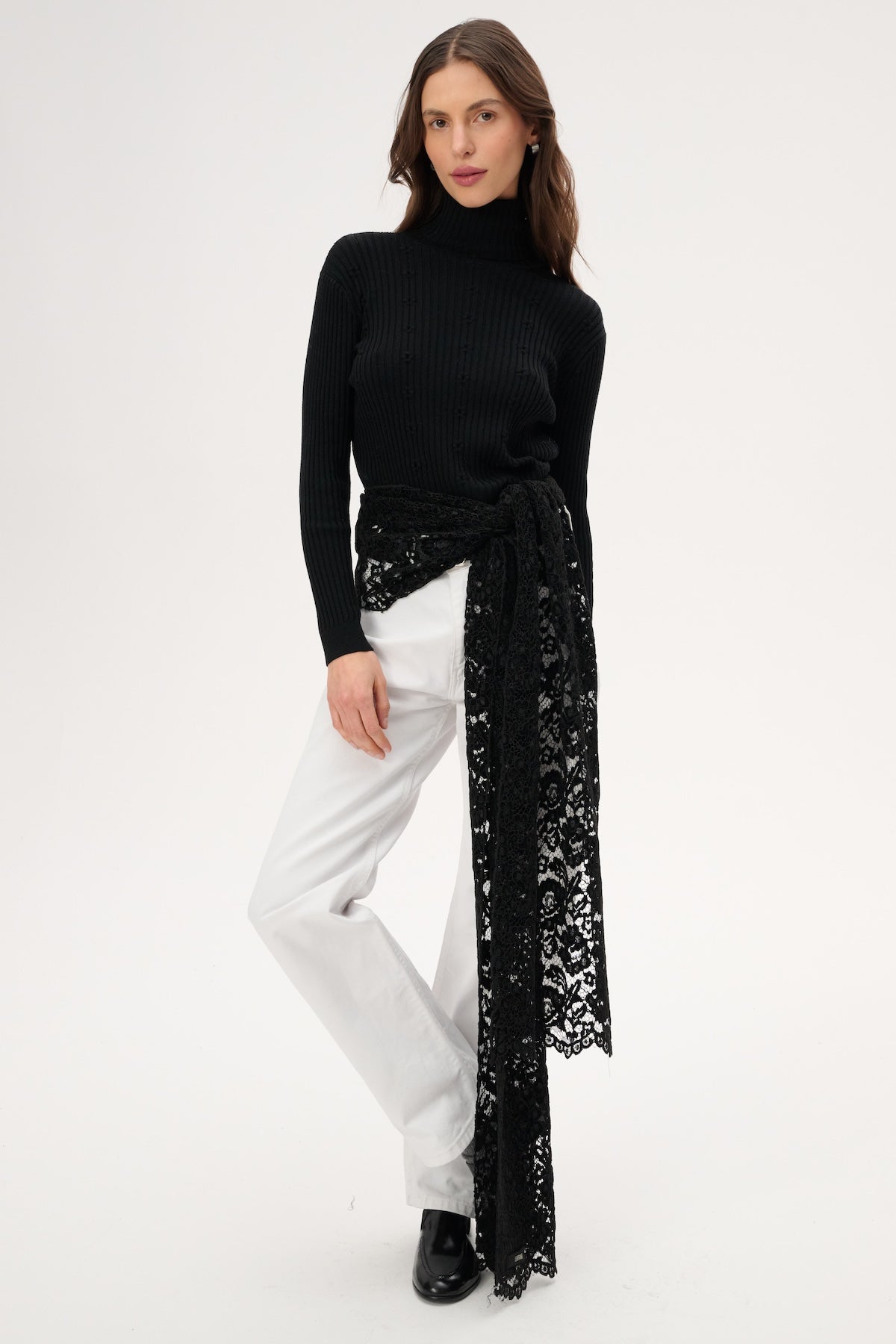 Wąski szal wykonany z koronkowej tkaniny w kolorze czarnym.