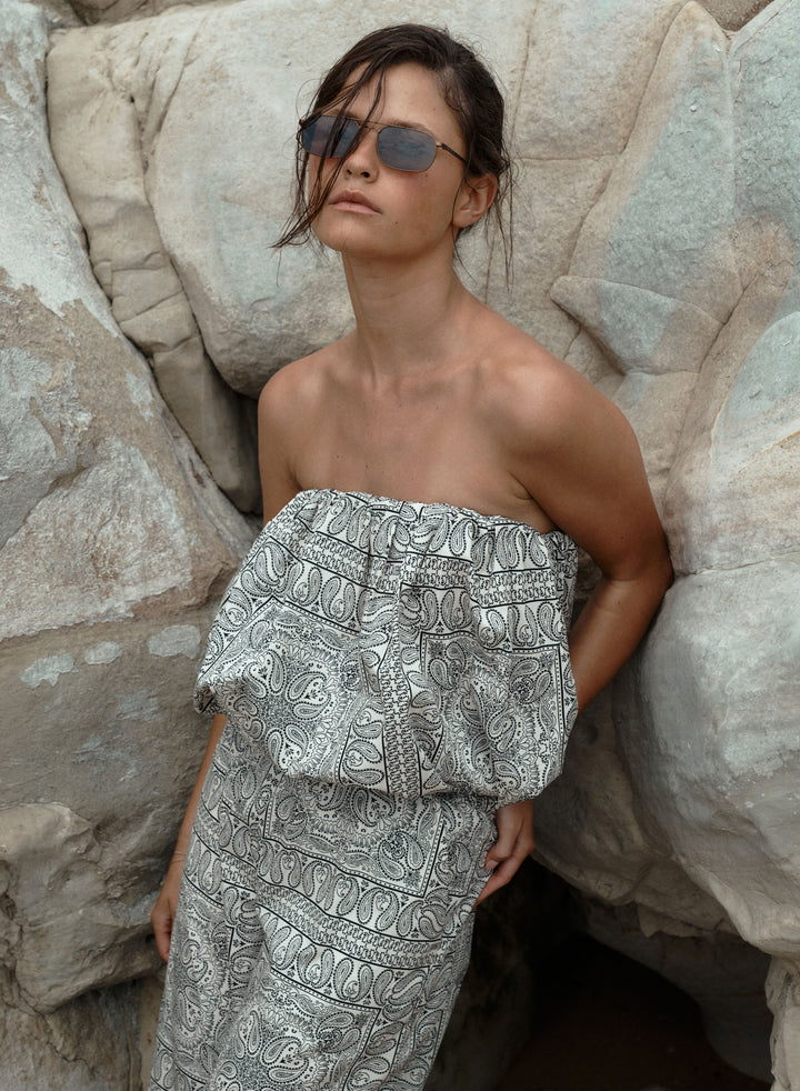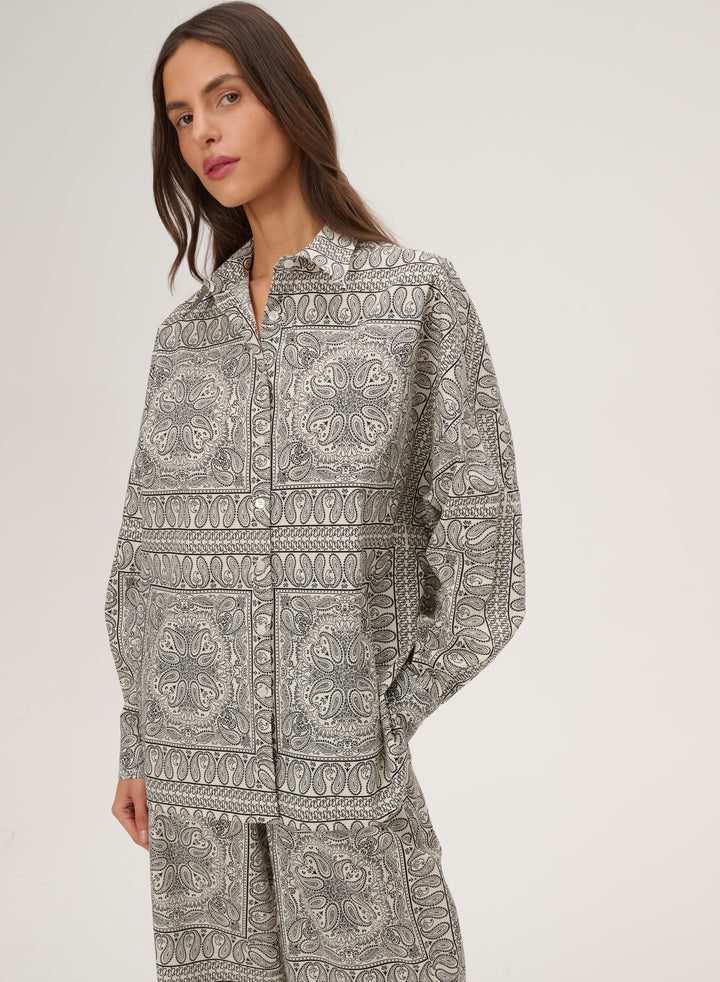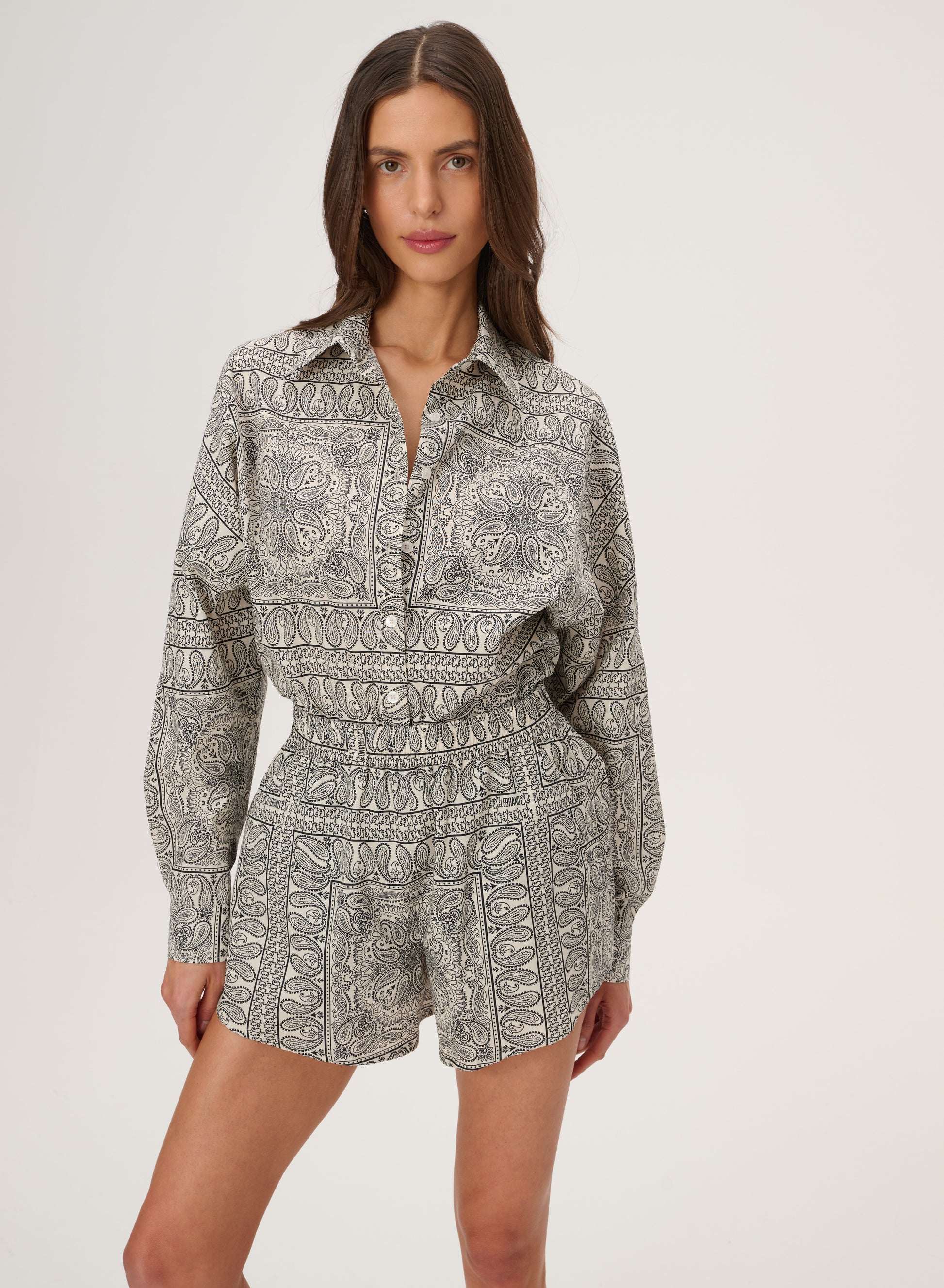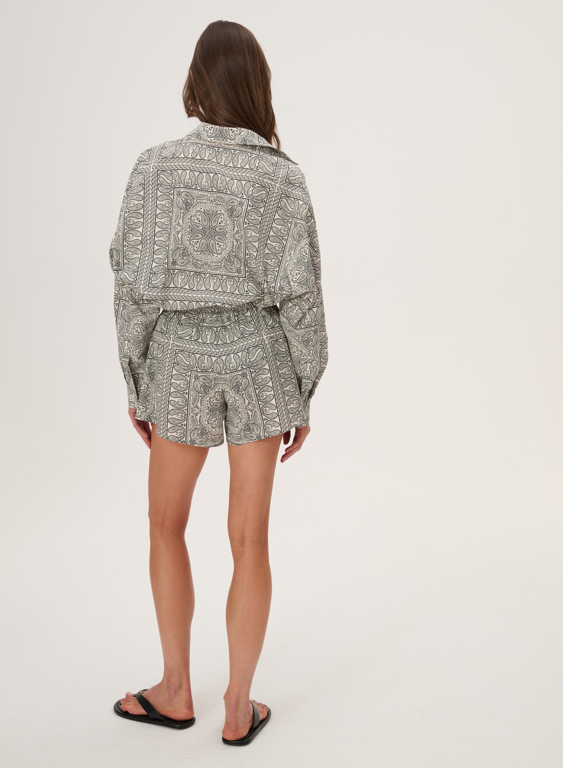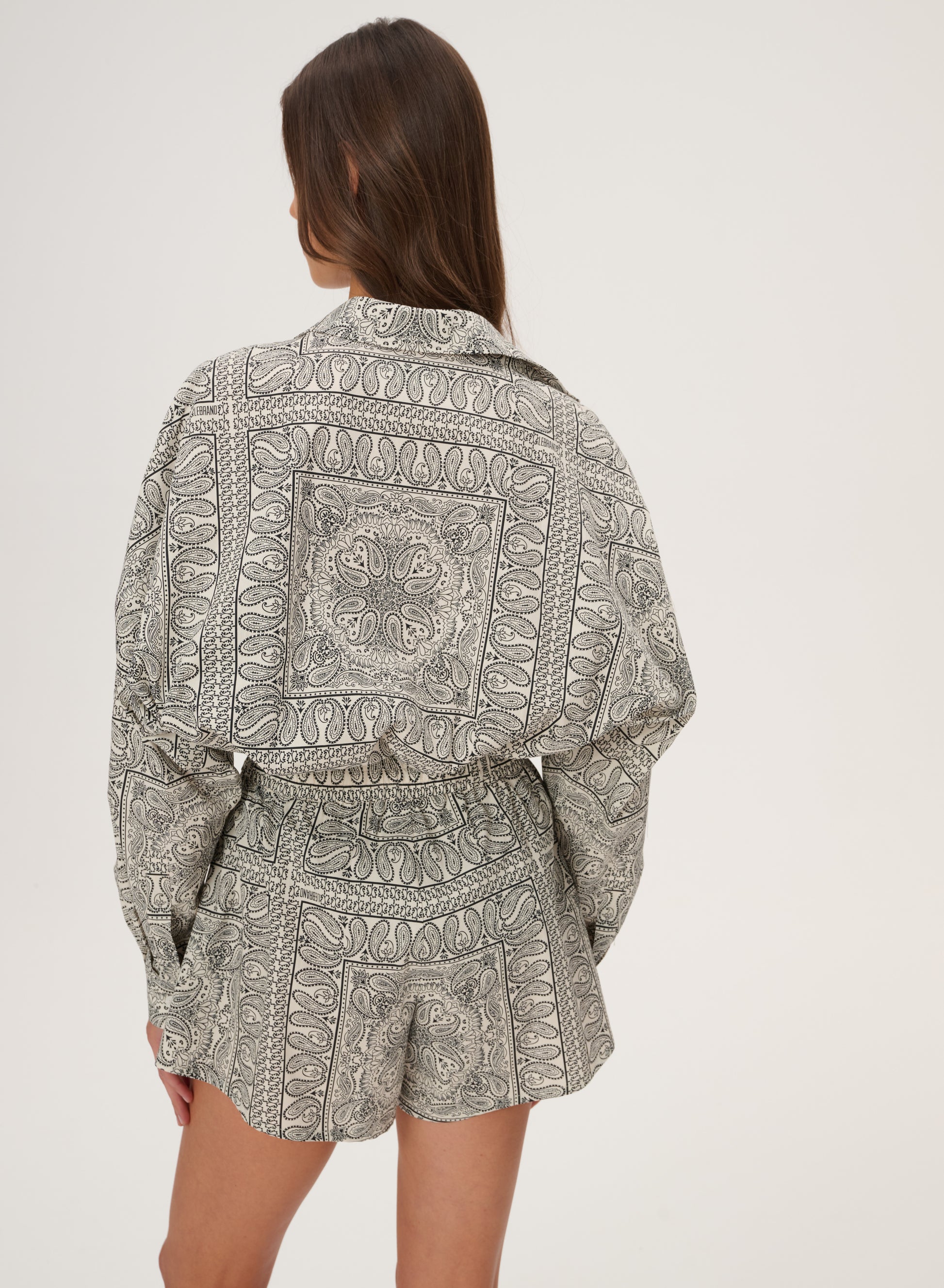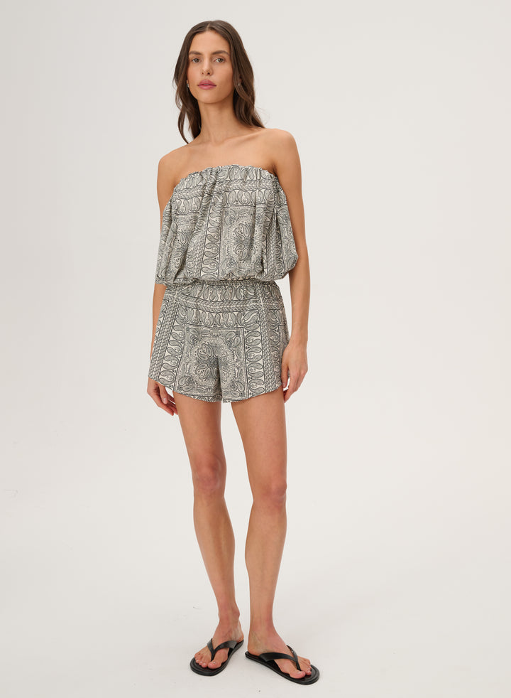 Krótkie szorty z szeroką nogawką wykonane z bawełny drukowanej w rozpoznawalny wzór bandany w kolorze ecru. Posiadają podwyższony stan z elastycznym pasem oraz dwie boczne kieszenie.