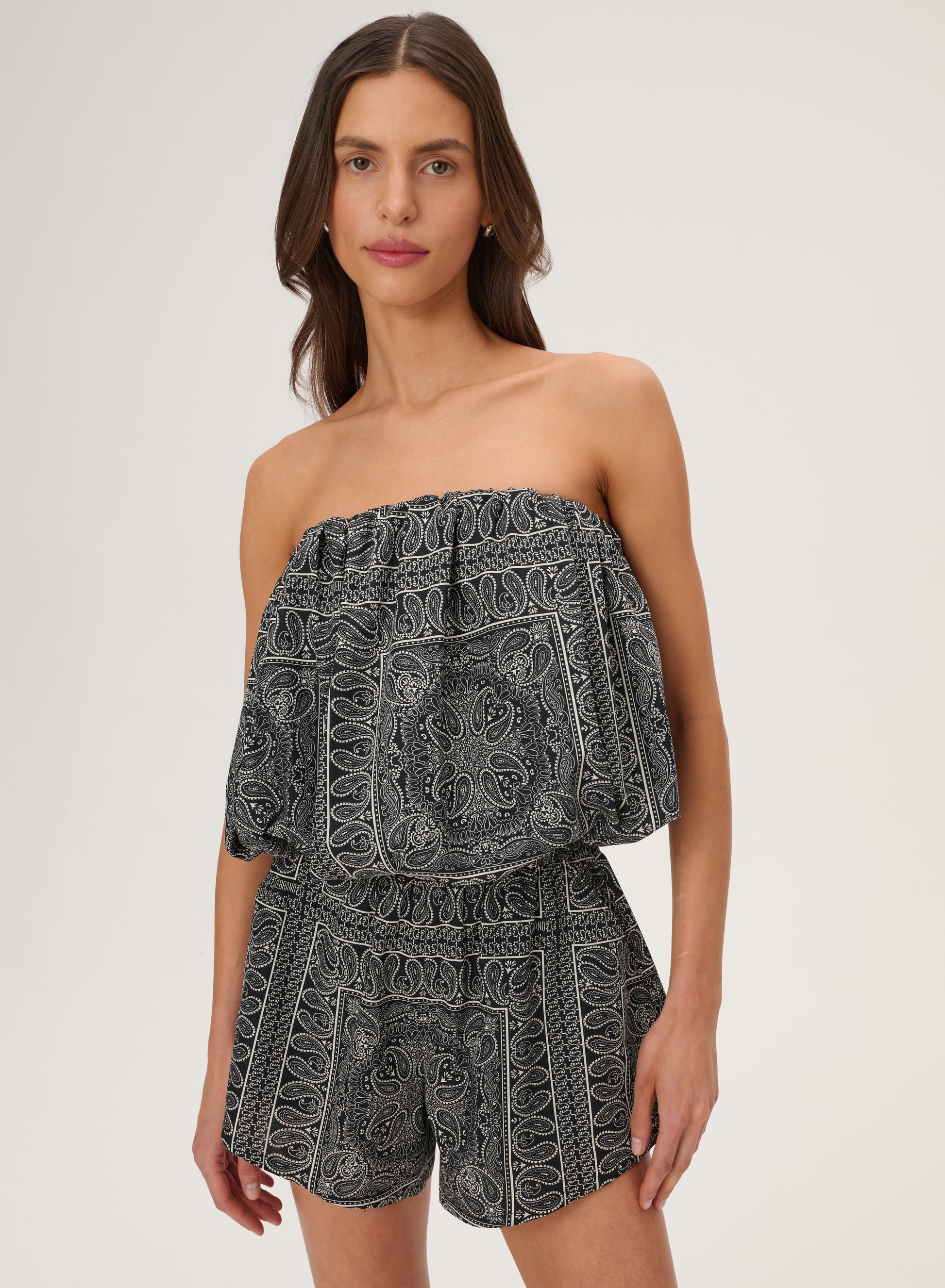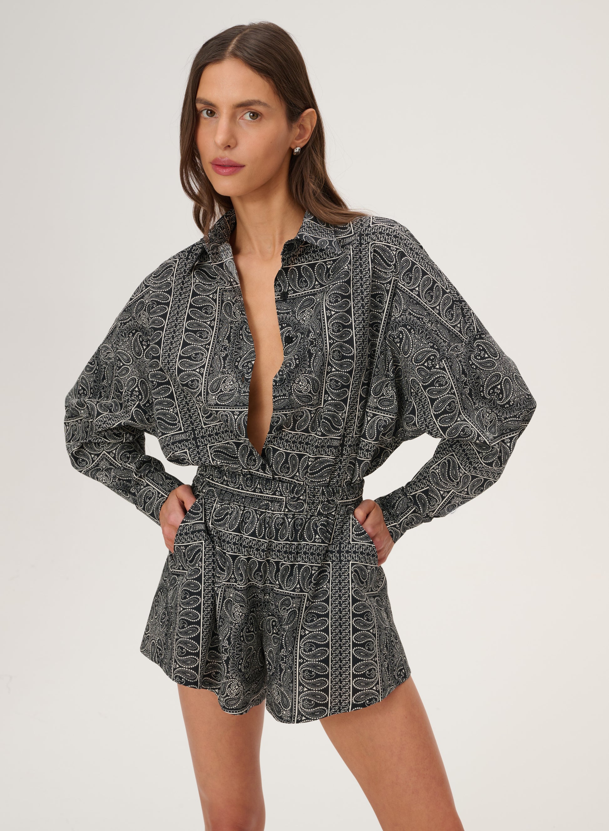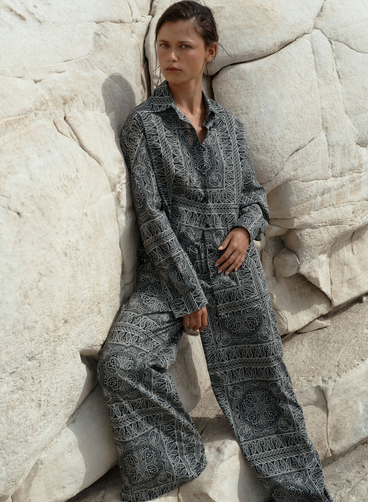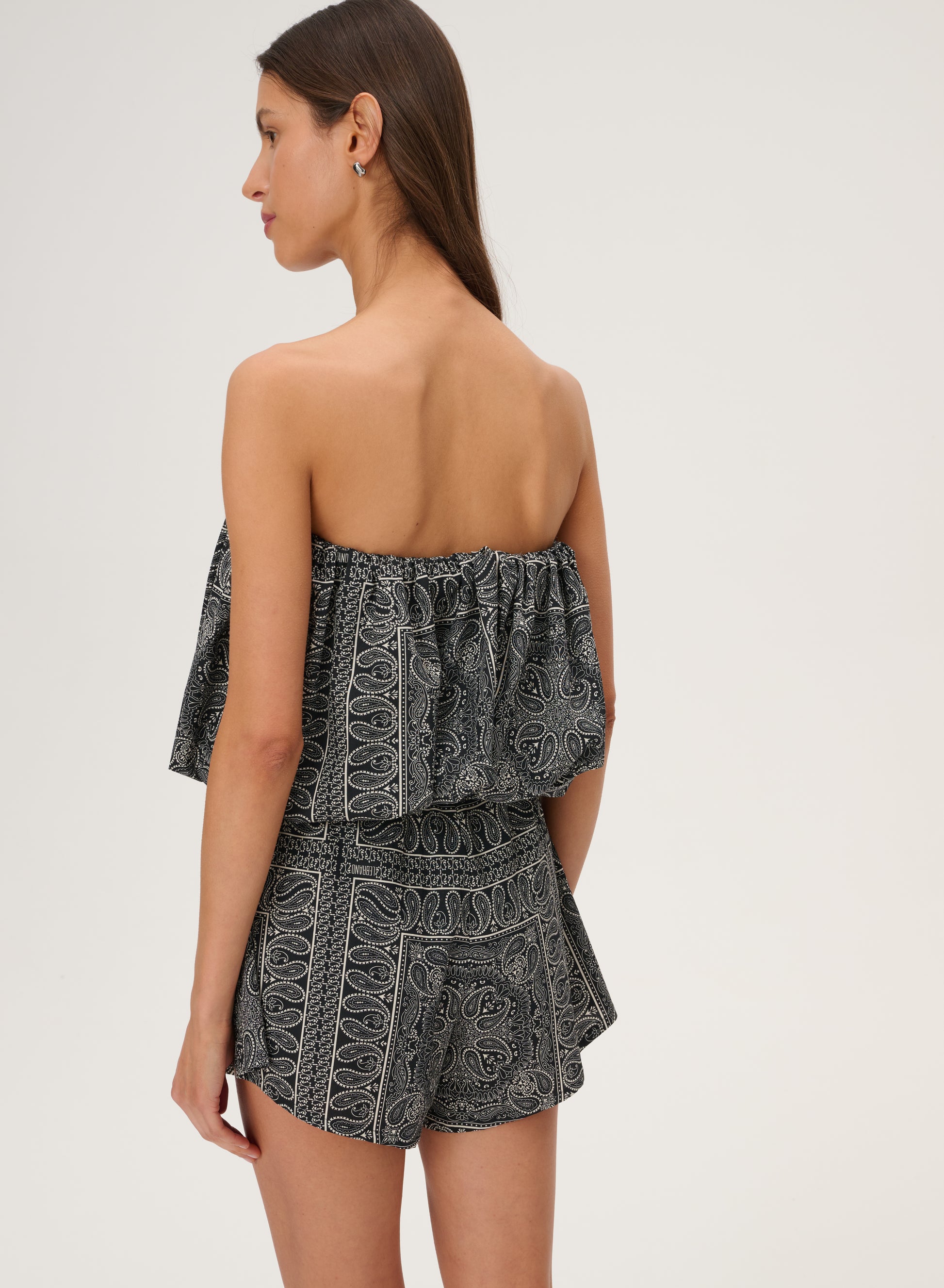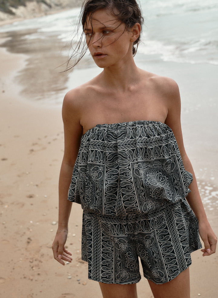 Krótkie szorty z szeroką nogawką wykonane z bawełny drukowanej w rozpoznawalny wzór bandany w kolorze czarnym. Posiadają podwyższony stan z elastycznym pasem oraz dwie boczne kieszenie.
