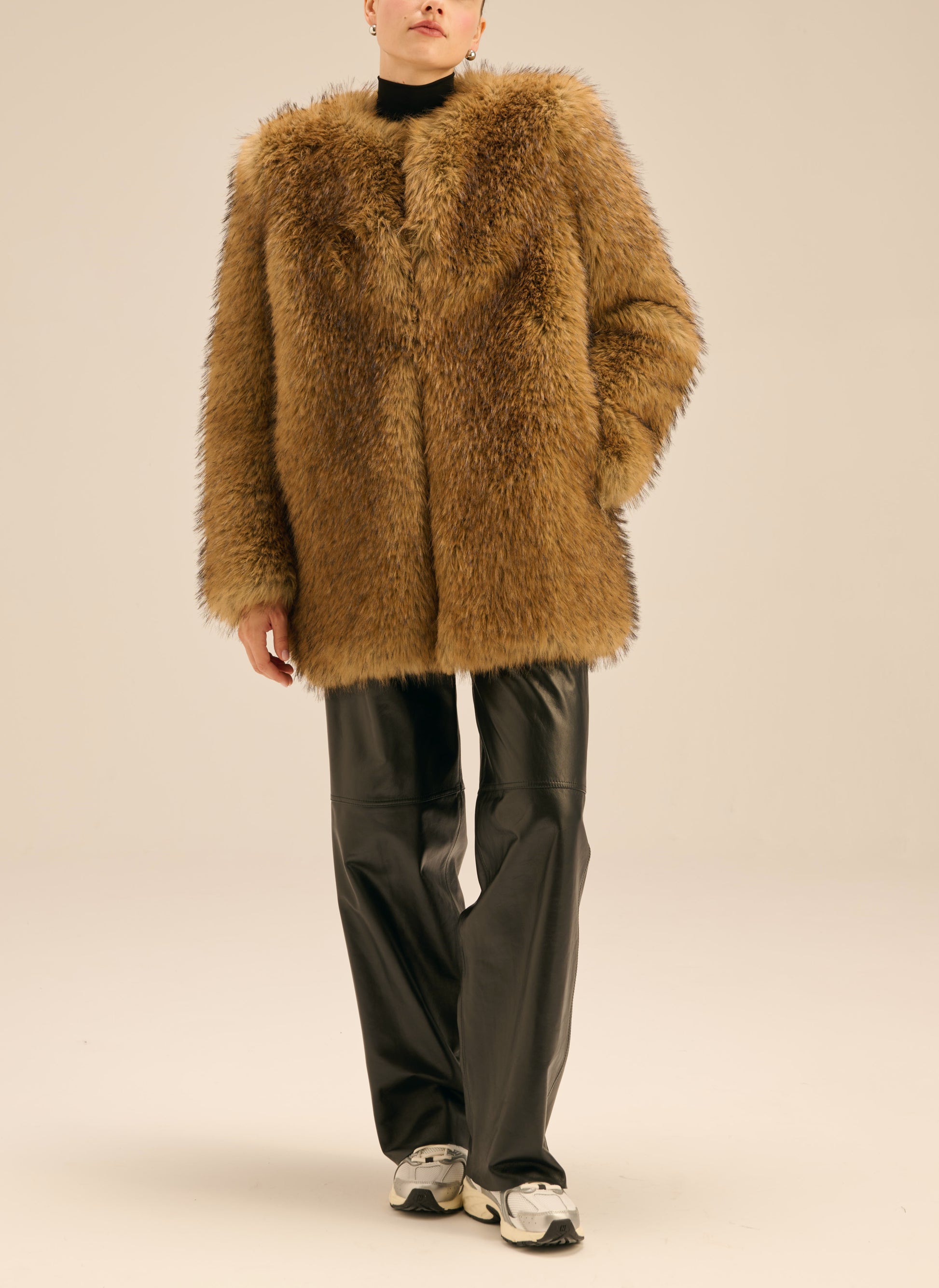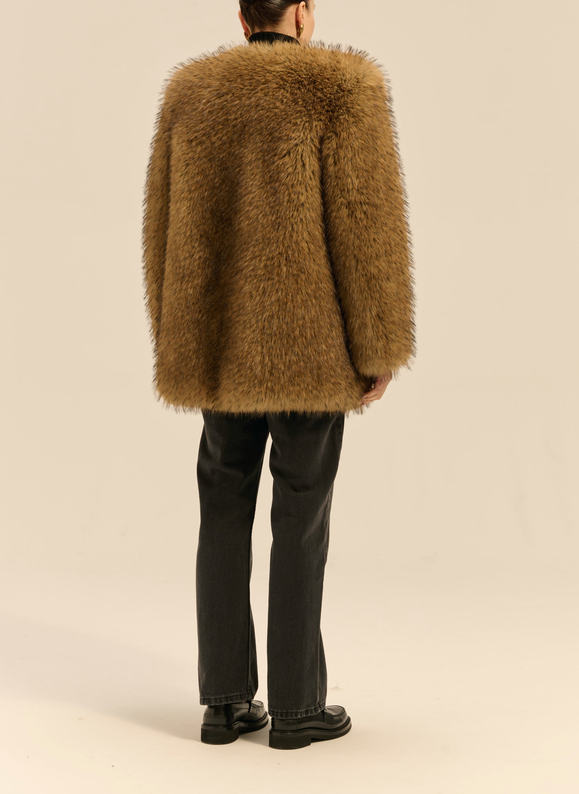 Długa kurtka o pudełkowym kroju, wykonana z miękkiego, sztucznego futra w kolorze jasnego brązu. Posiada górne zapięcie na haftki oraz dwie kieszenie.
