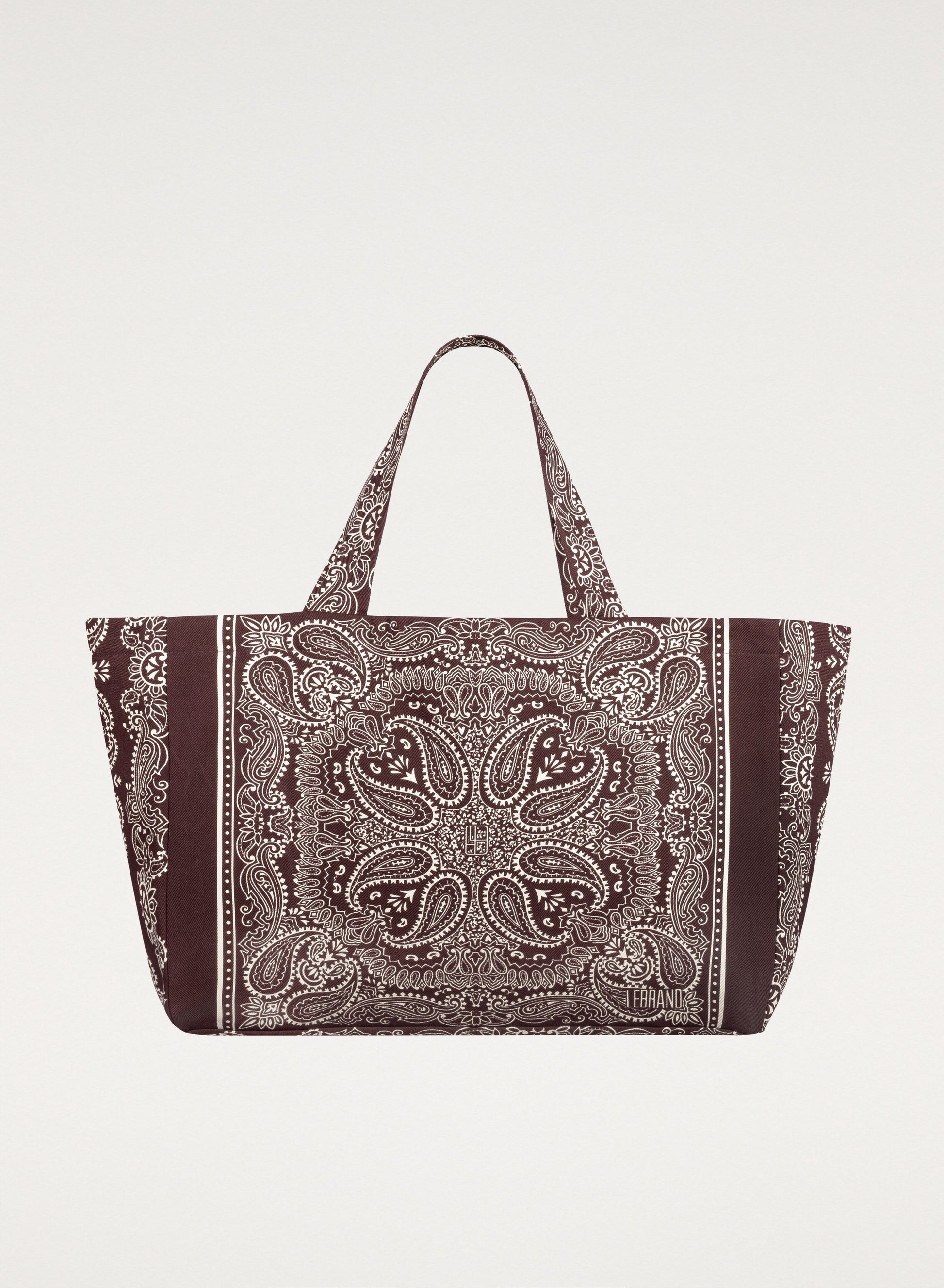 Torba oversize typu shopper wykonana z grubego bawełnianego płótna z nadrukiem bandany w kolorze burgundowym i ecru.
