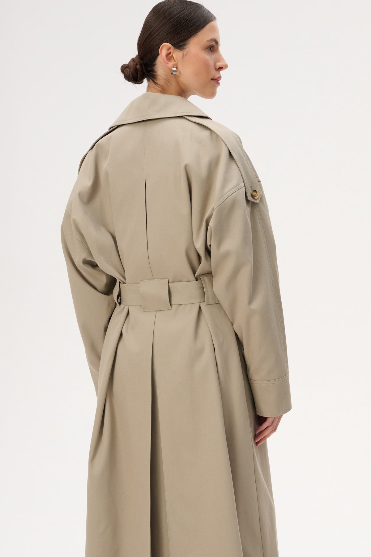 Klasyczny, długi trencz o kroju oversize wykonany z grubej bawełny w kolorze beżowym. Posiada dwurzędowe zapięcie na guziki, szerokie rękawy zbierane w nadgarstkach, pagony na ramionach oraz długi pasek wiązany w talii. Tył płaszcza dekorowany plisą.