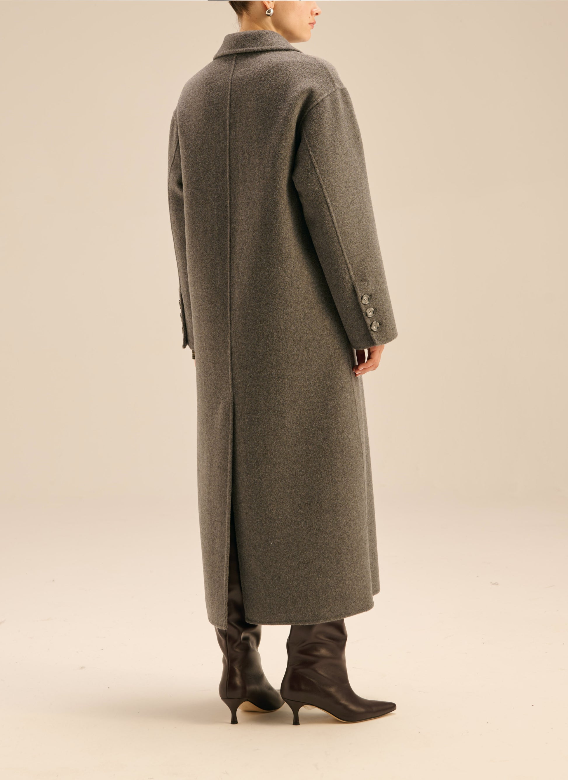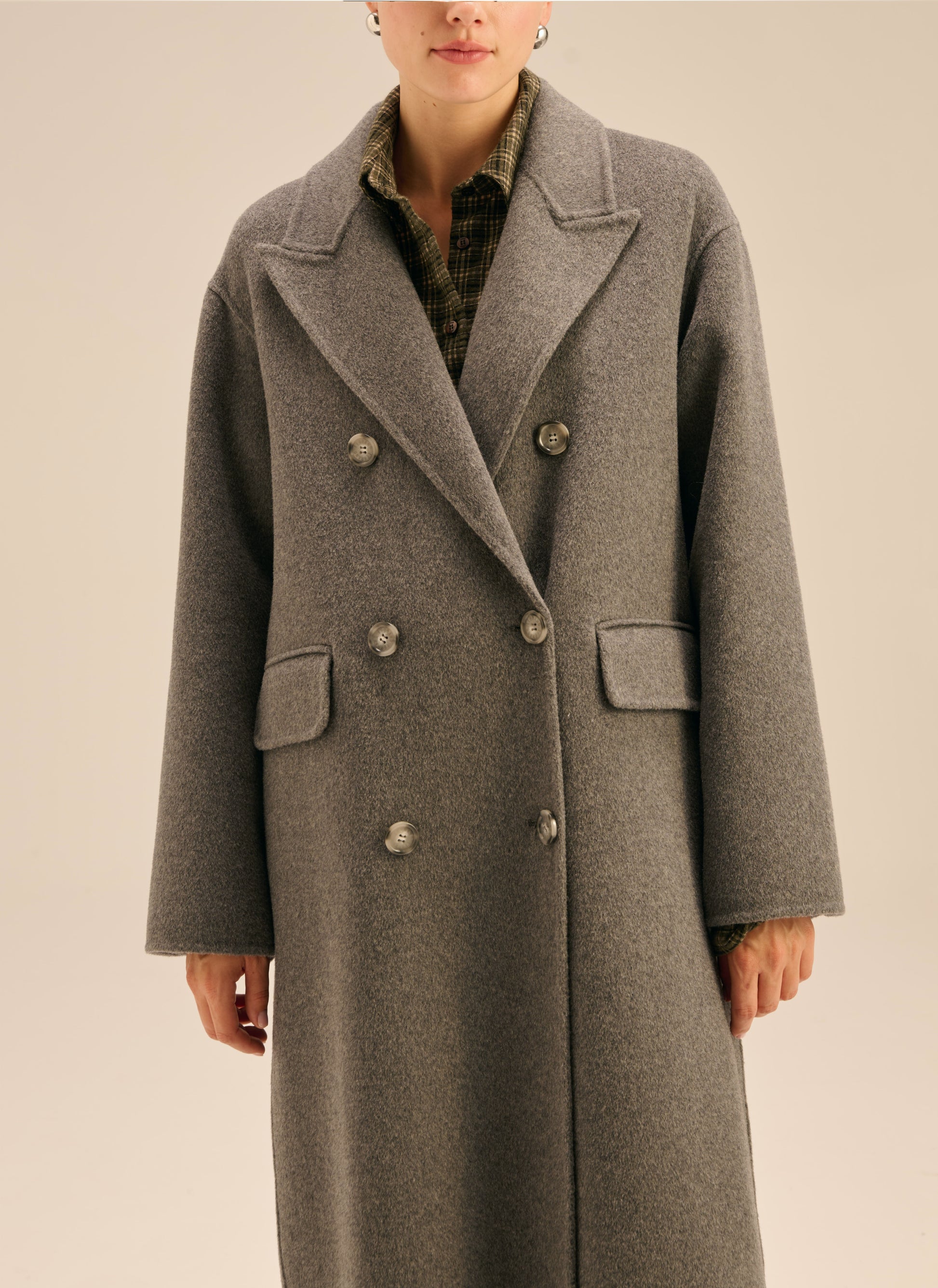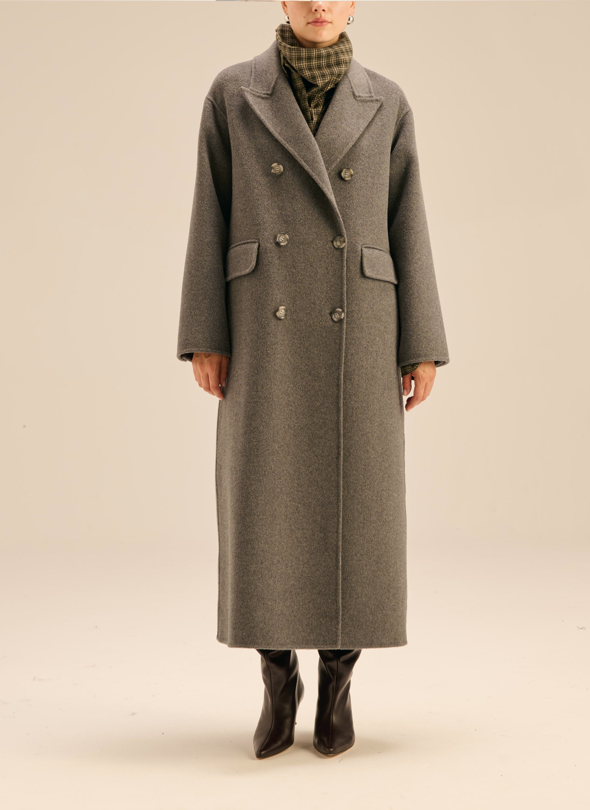 Długi płaszcz o kroju oversize. Wykonany w 100% z miękkiej wełny w szarym kolorze. Posiada dwurzędowe zapięcie na guziki, szerokie klapy oraz dwie kieszenie. Model bez podszewki/ double face.