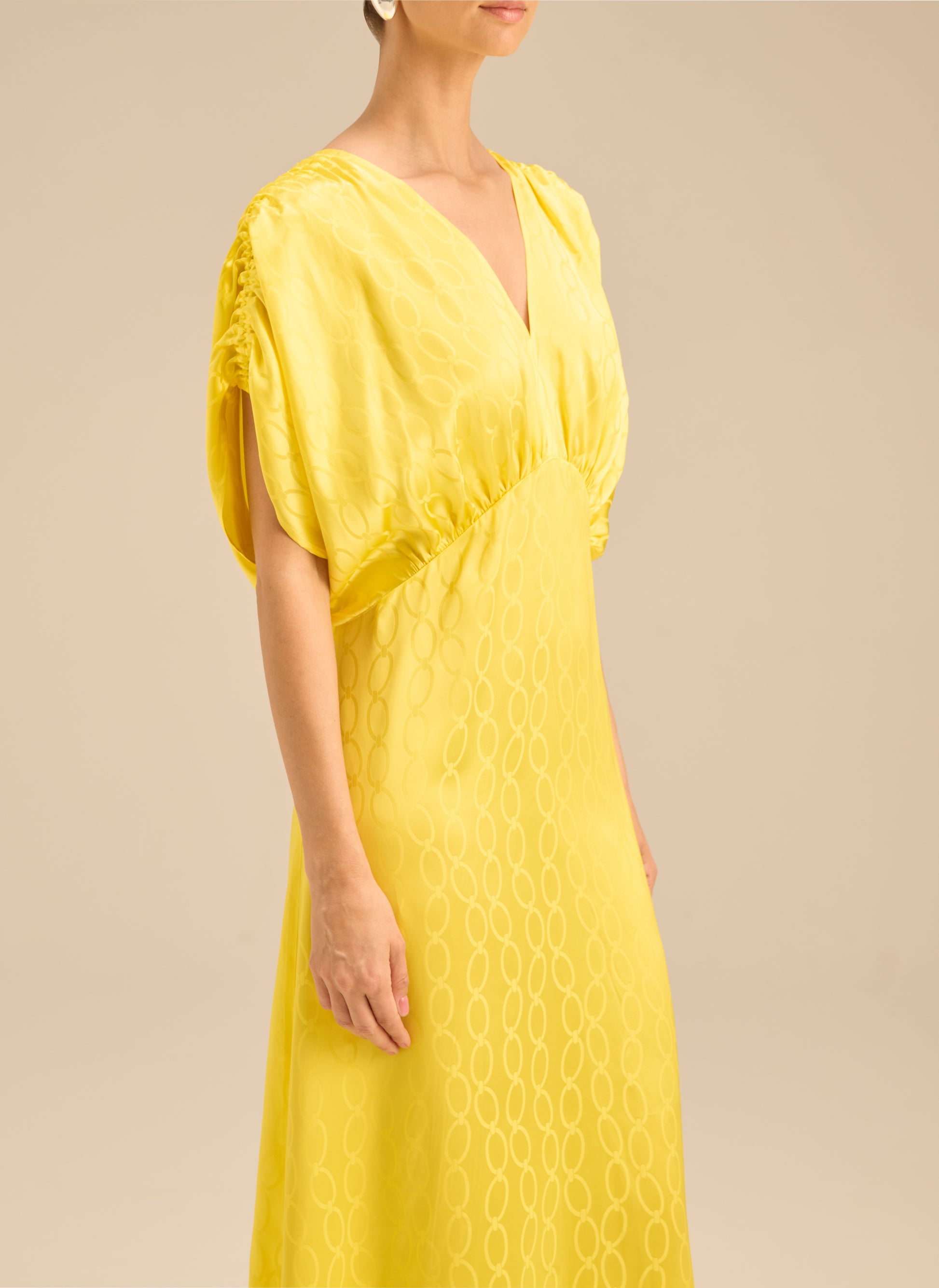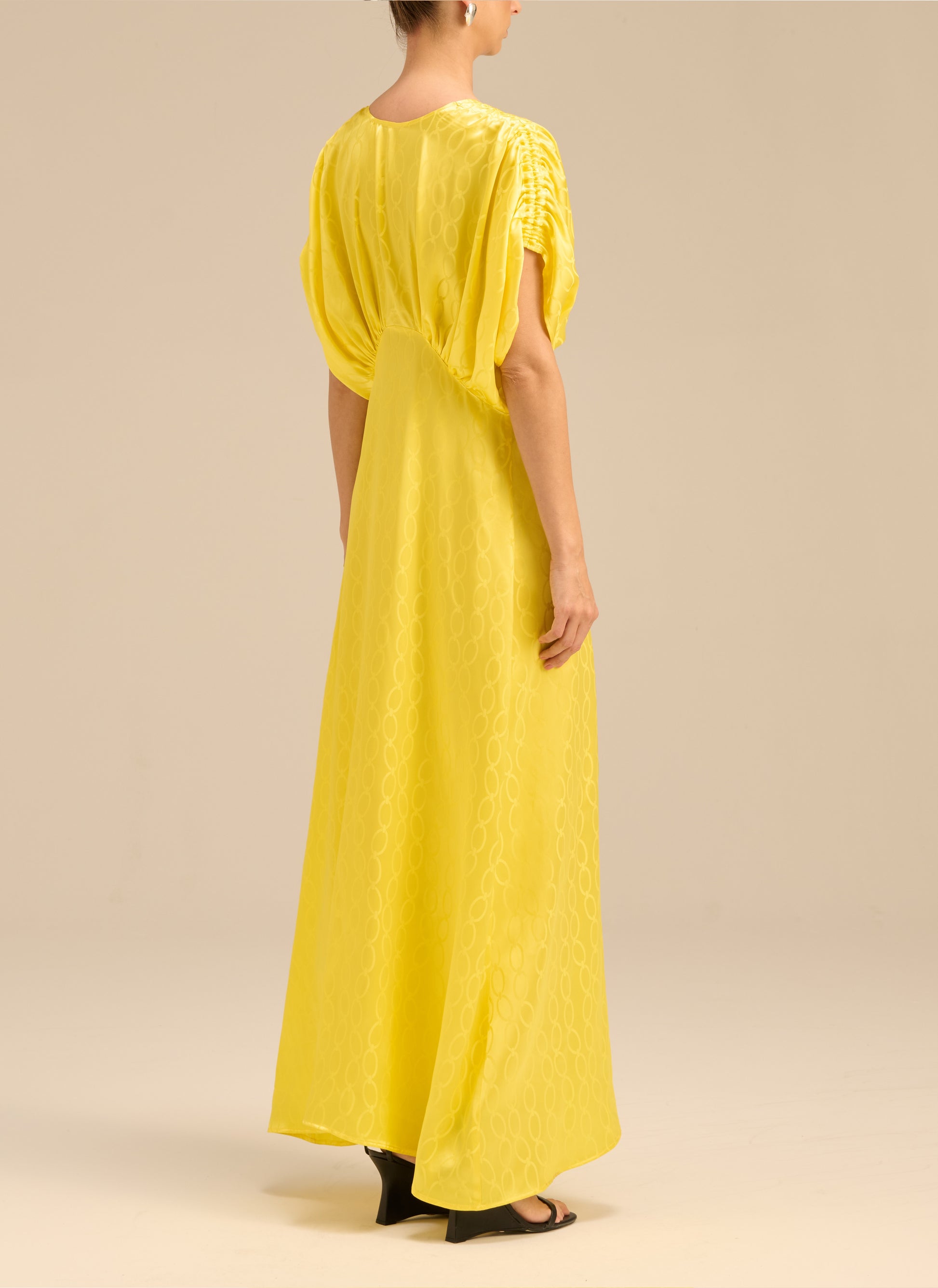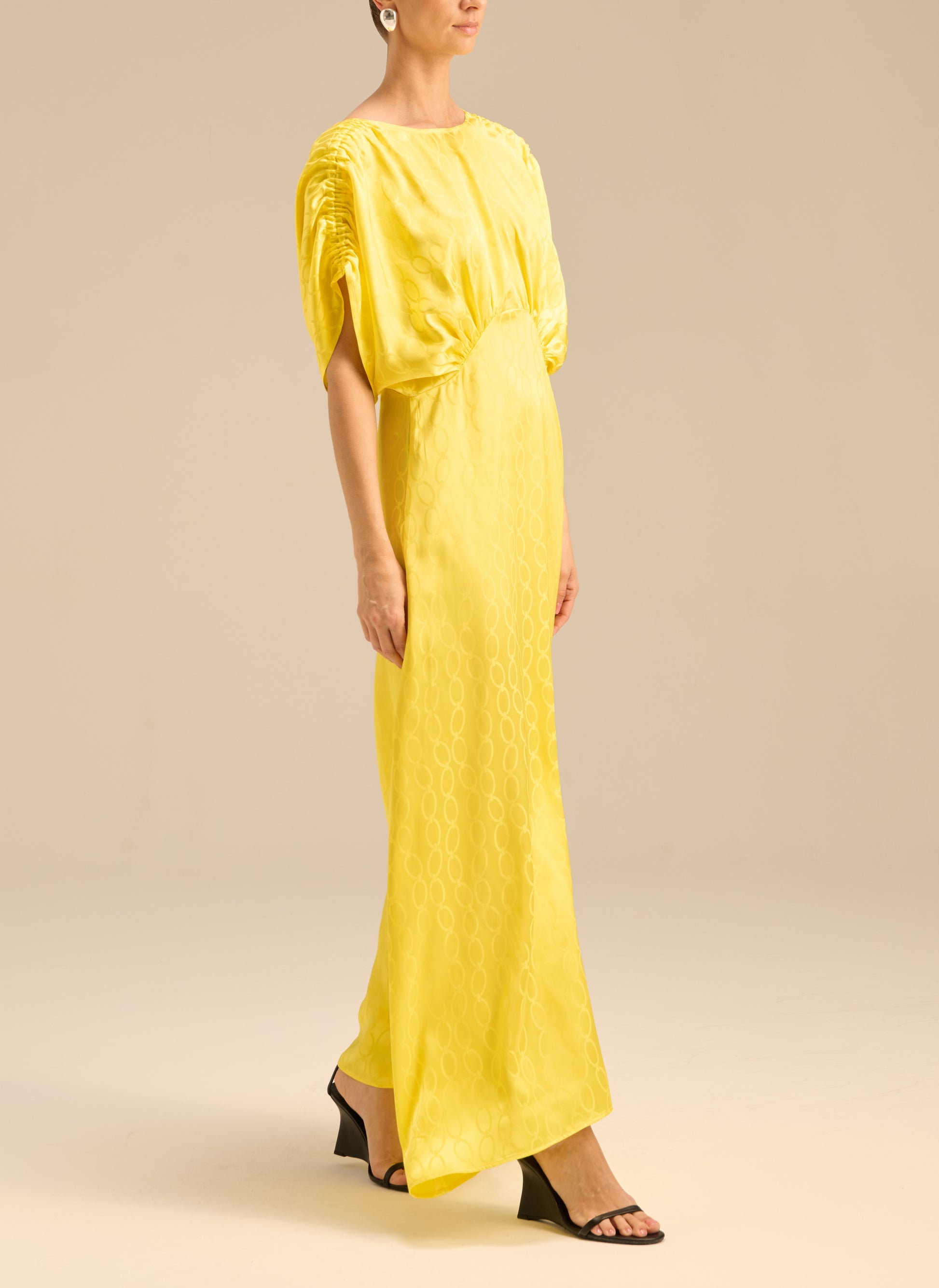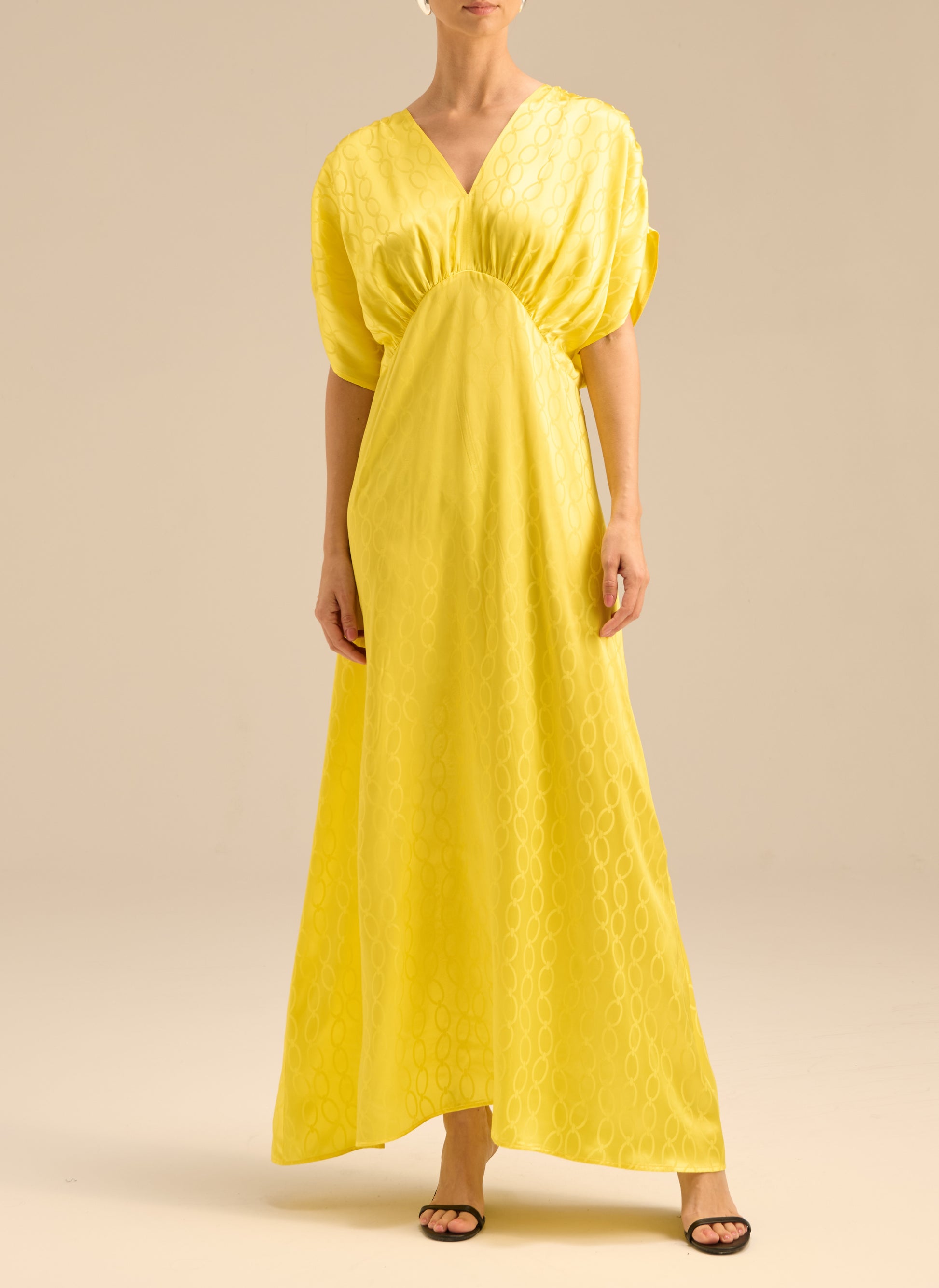 Сукня довжини максі, виготовлена з легкої тканини, що струмує, прикрашена унікальним візерунком жовтого кольору. Має широкі, спадаючі бретельки та V-подібний виріз, що дозволяє носити сукню як спереду, так і ззаду.