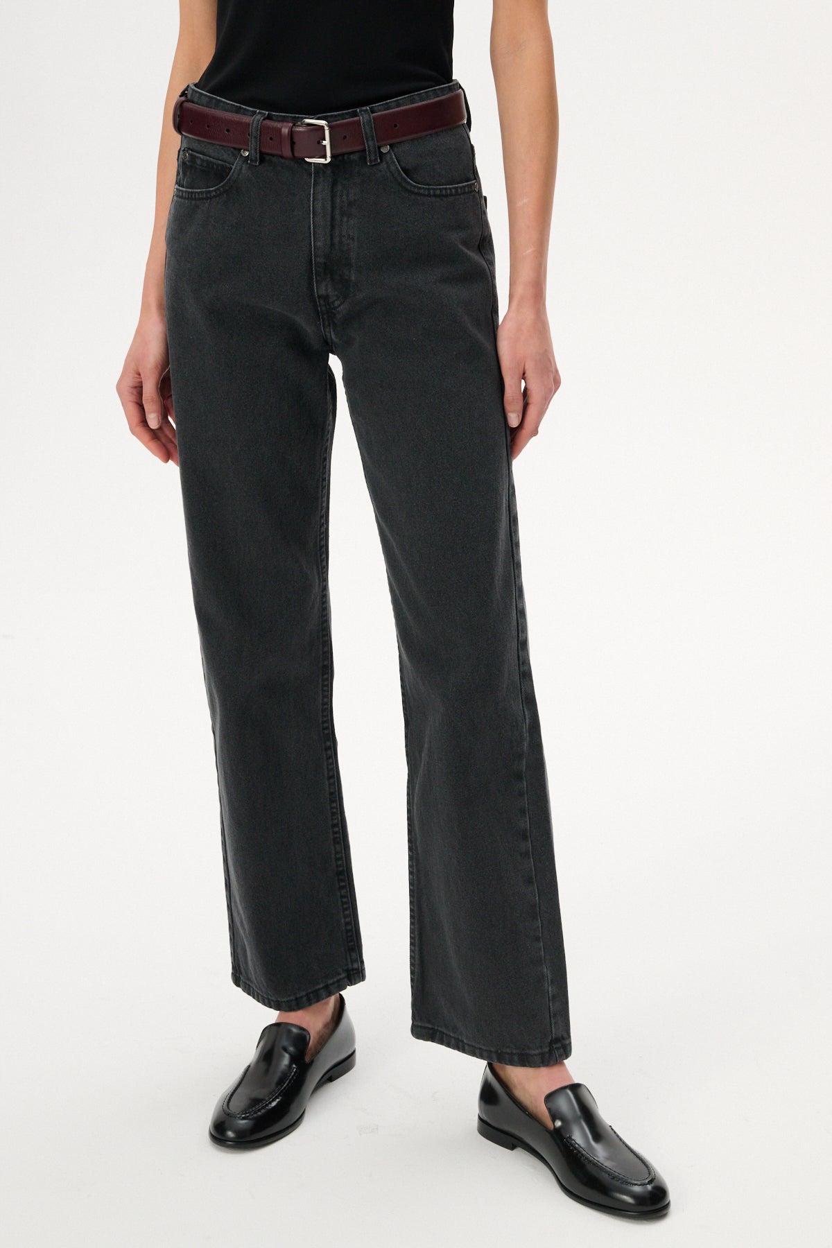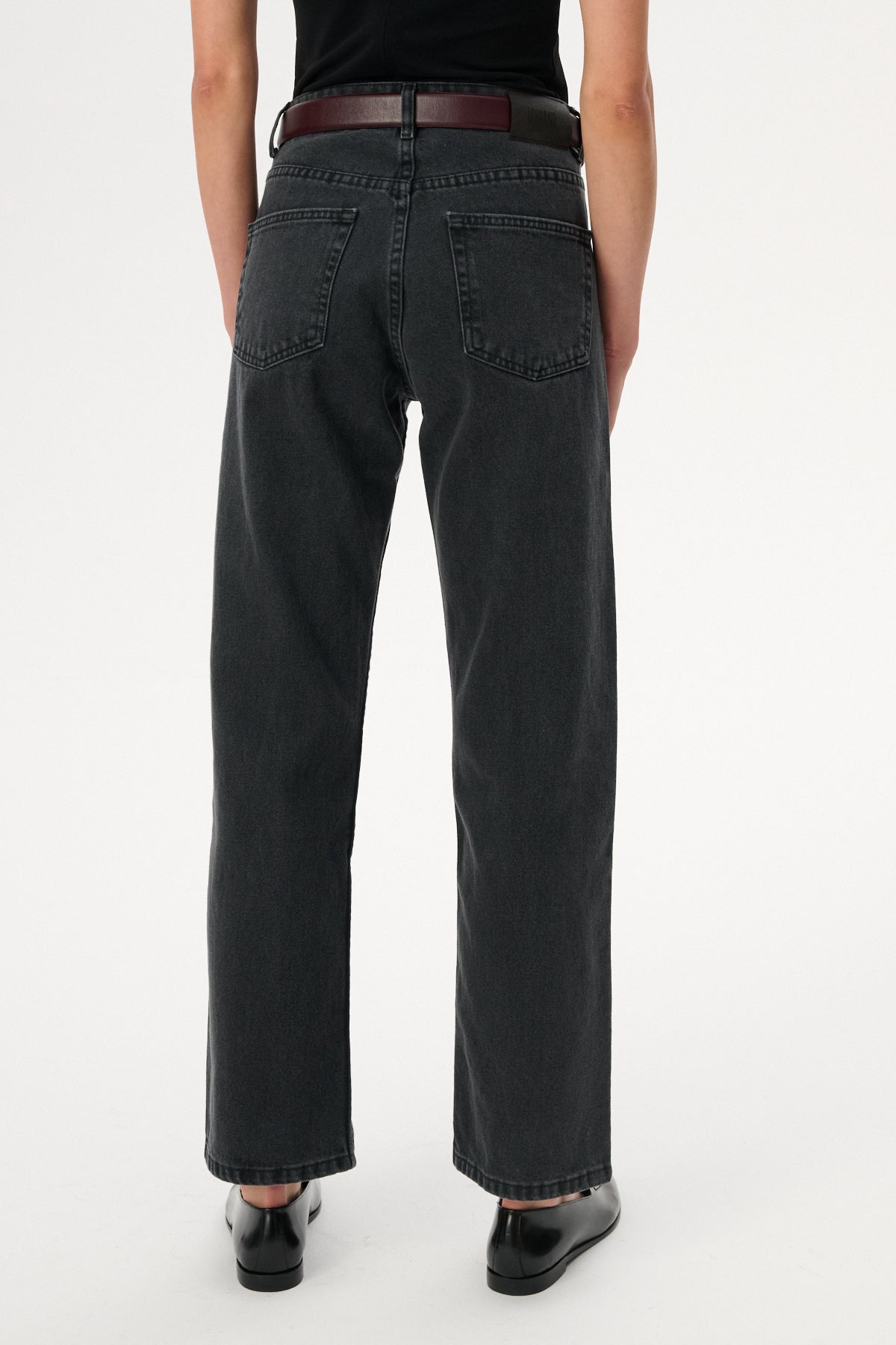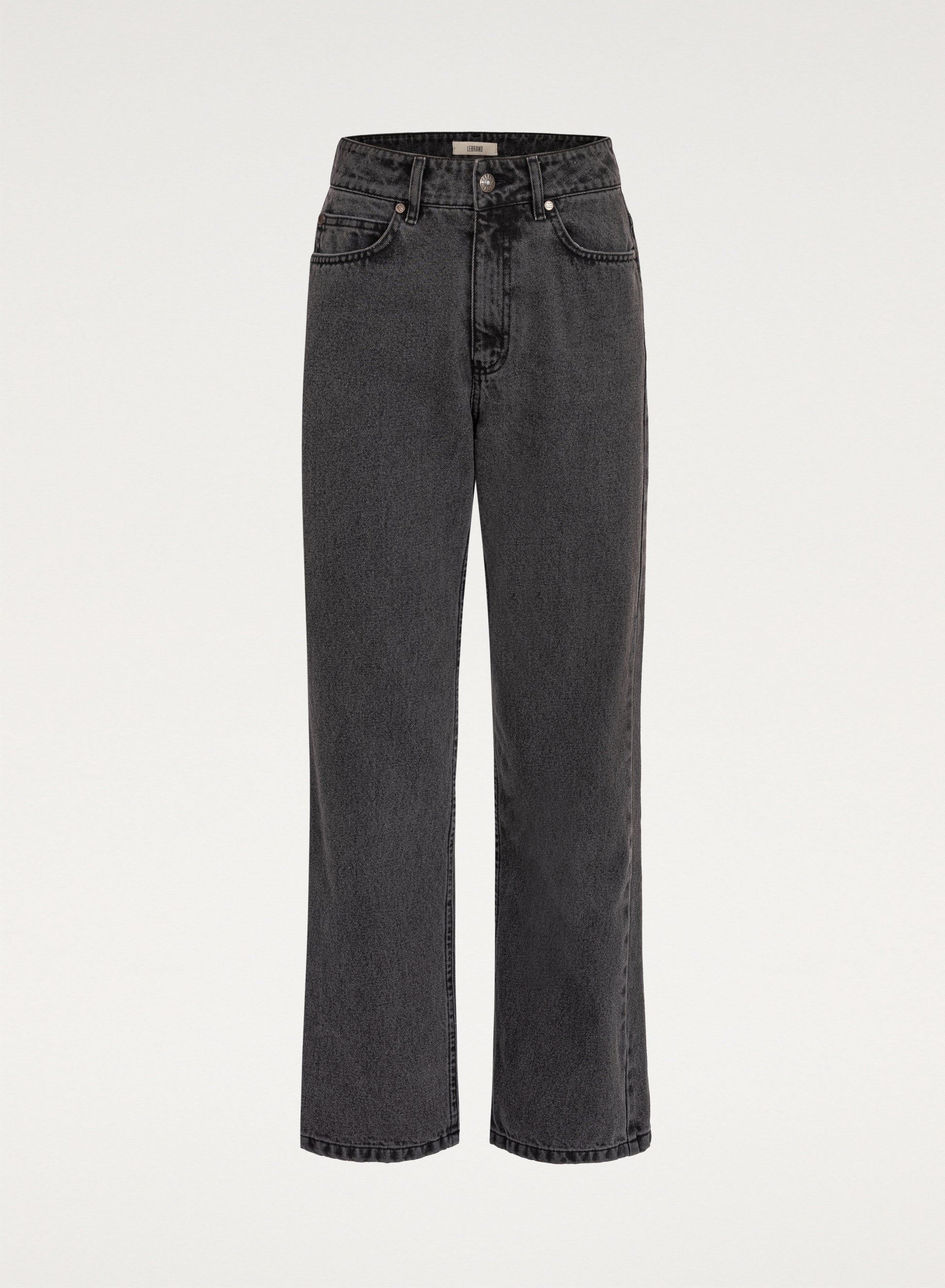 Ці джинси вільного крою мають високу талію та широкі штанини нижче щиколоток. Вони виготовлені зі 100% нееластичної сірої бавовни. Застібаються на ґудзики та блискавку, а також мають шкіряну нашивку з тисненим логотипом ззаду.