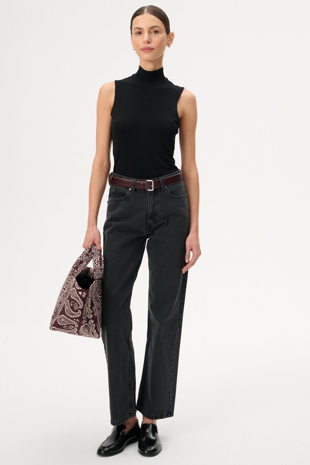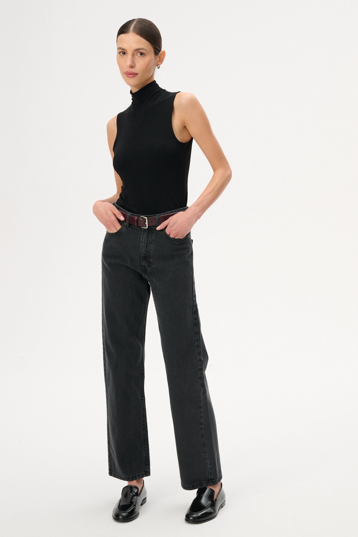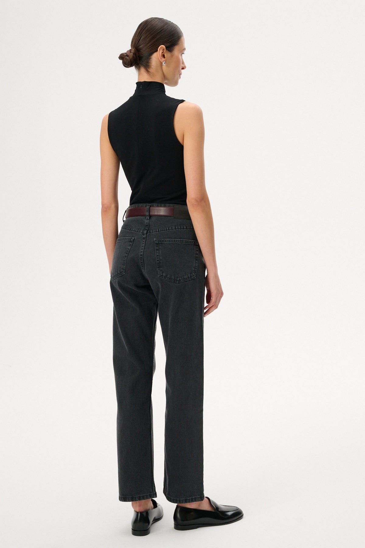 Ці джинси вільного крою мають високу талію та широкі штанини нижче щиколоток. Вони виготовлені зі 100% нееластичної сірої бавовни. Застібаються на ґудзики та блискавку, а також мають шкіряну нашивку з тисненим логотипом ззаду.