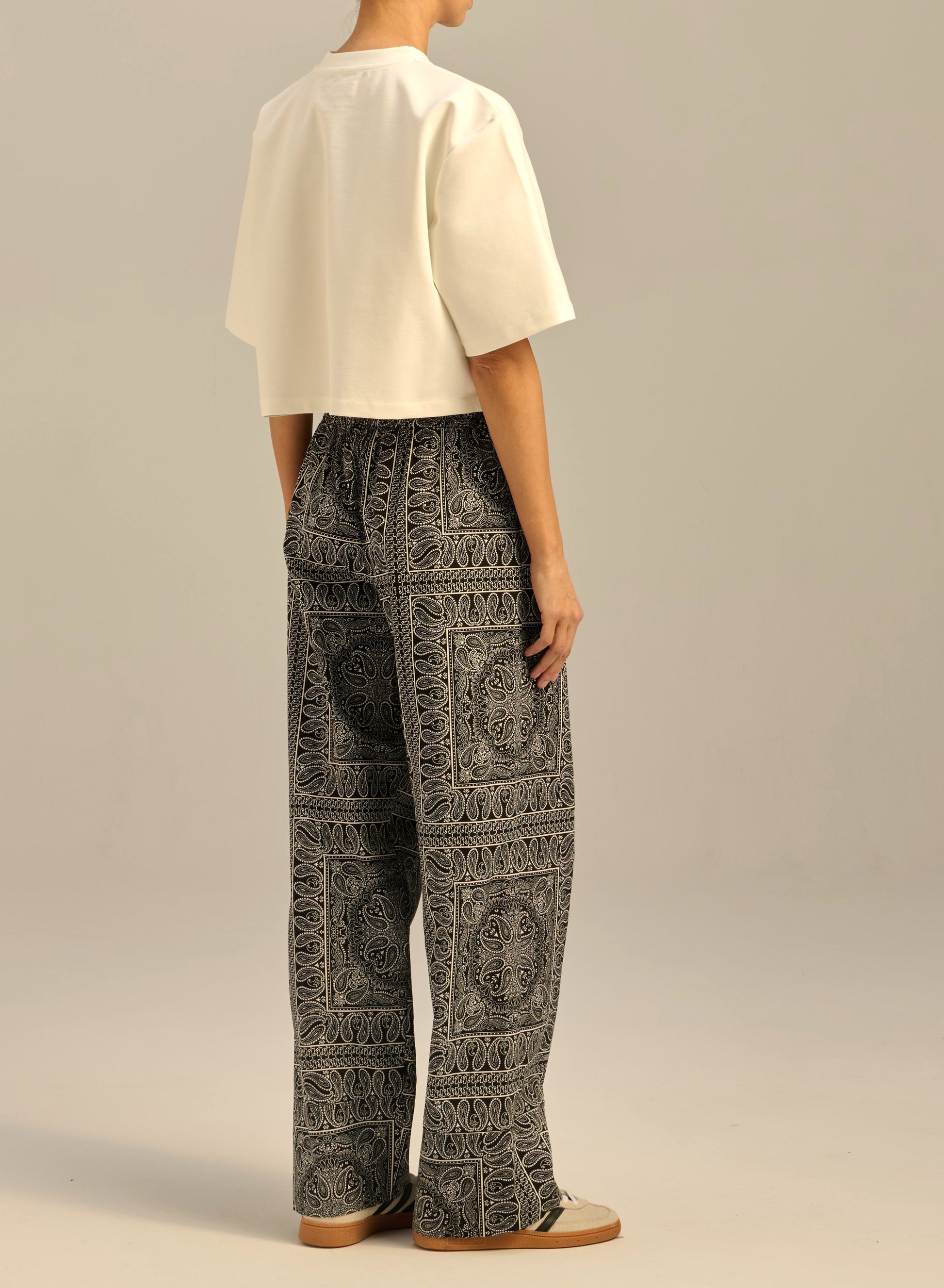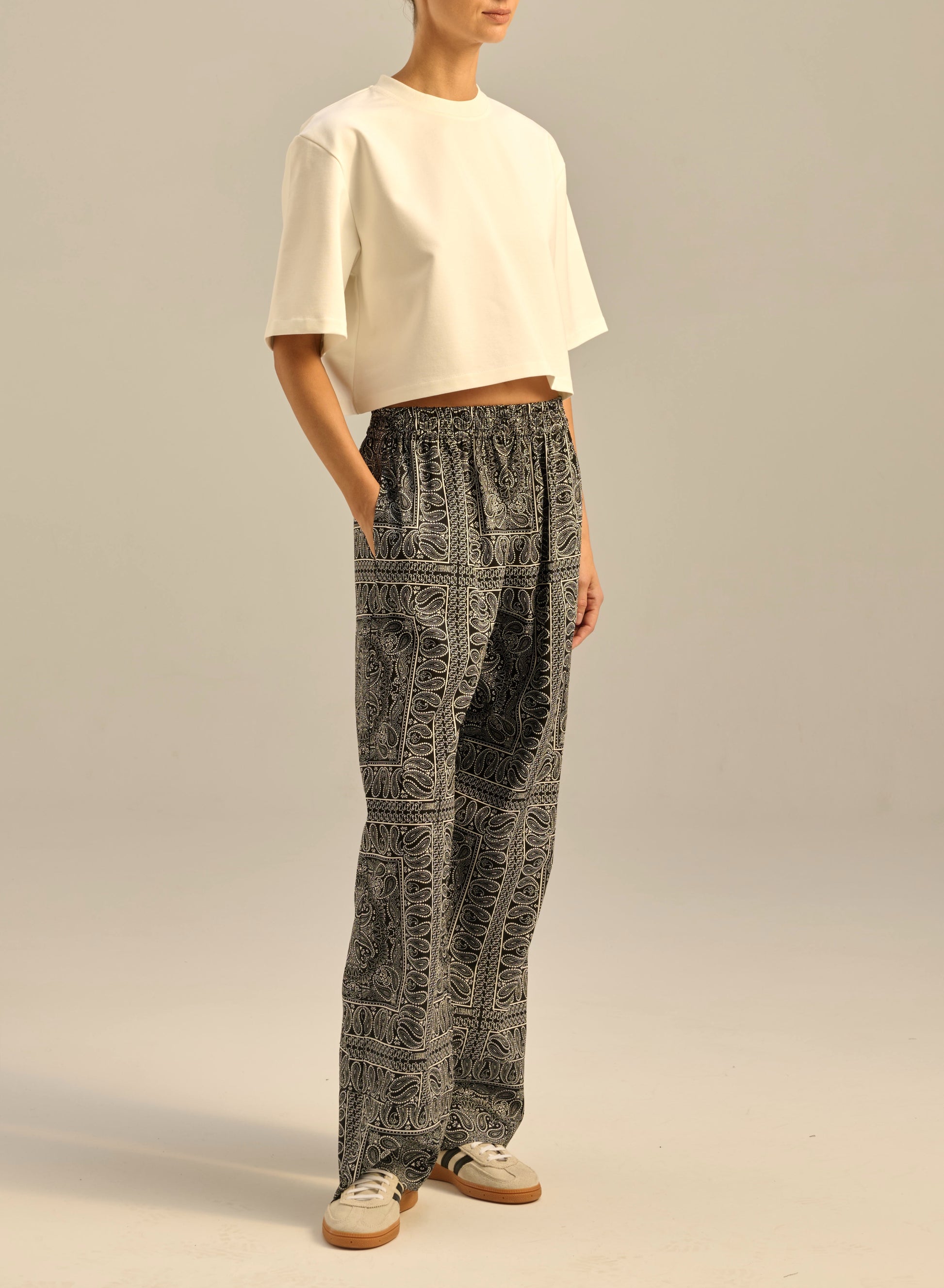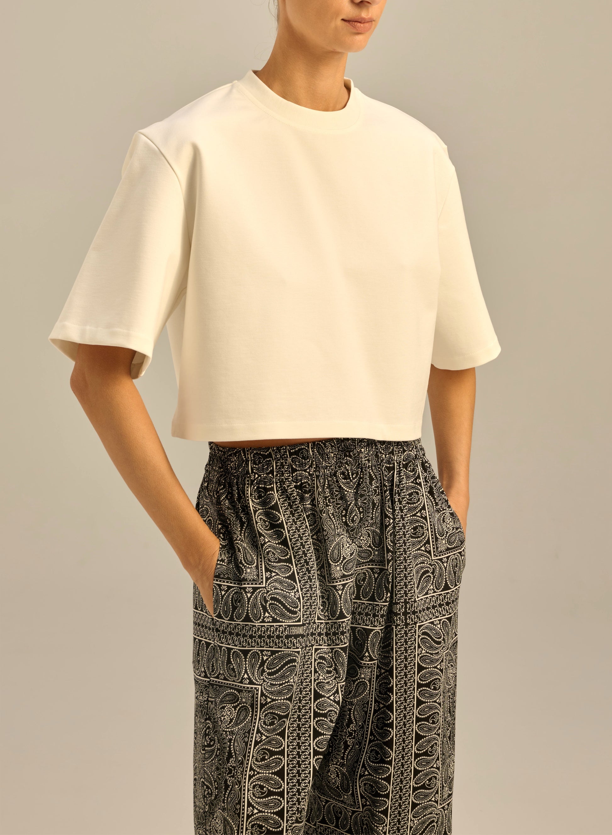 Коротка футболка oversize з м'якого трикотажу. Має круглий виріз і рукава до ліктів.