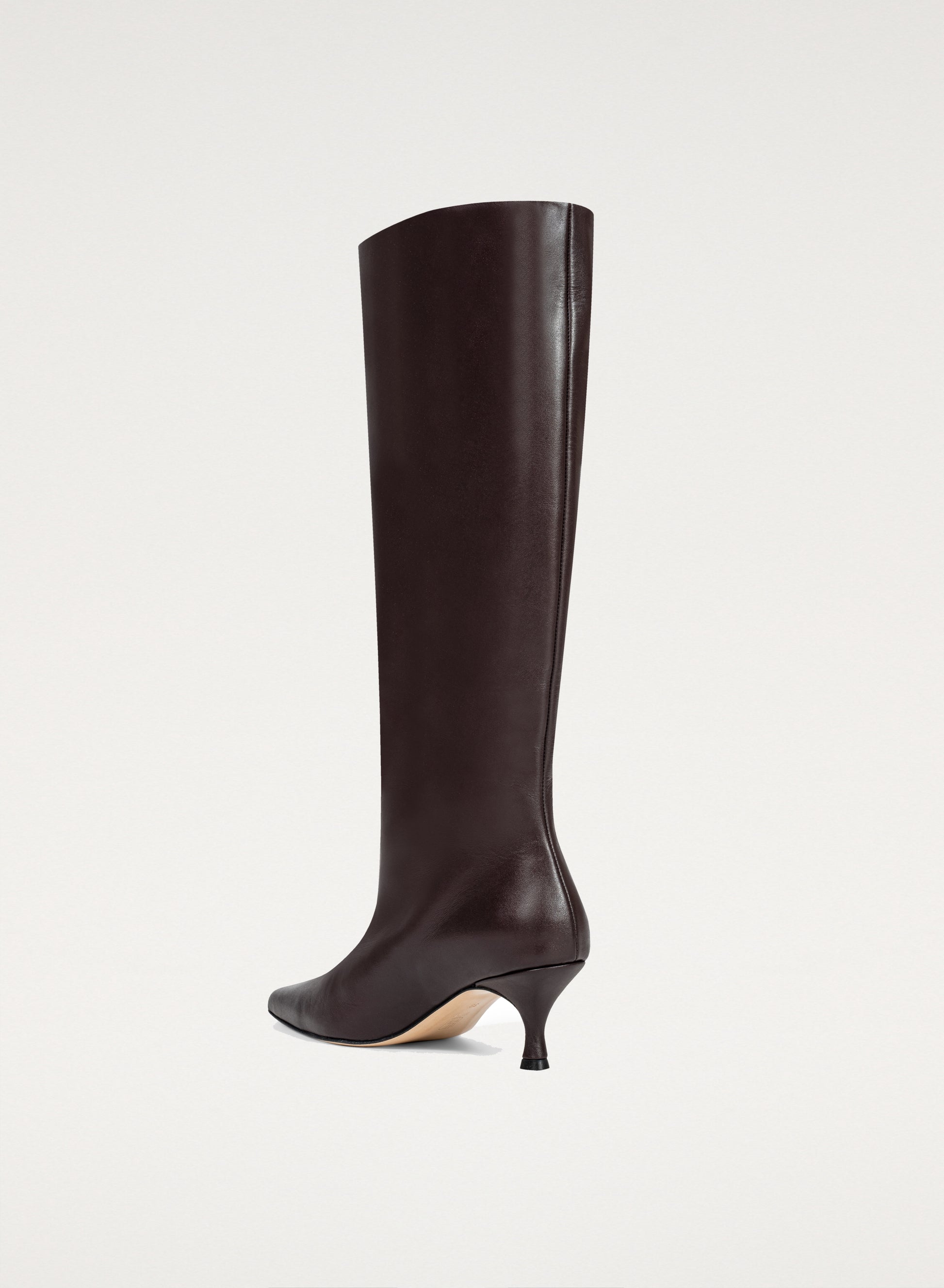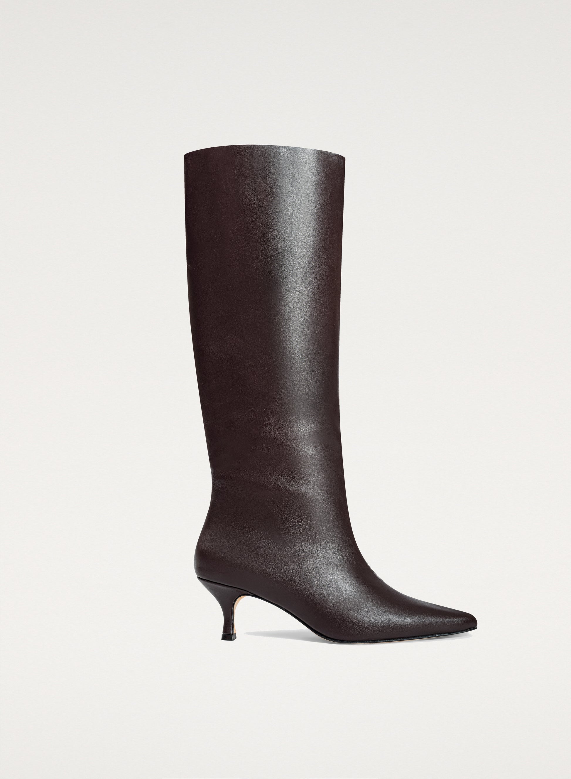 Довгі чоботи на каблуці типу «качка» насиченого бордового кольору. Виготовлений з натуральної шкіри. Вони мають верхню частину, яка досягає трохи вище коліна, і вузьку передню частину з гострим носком.