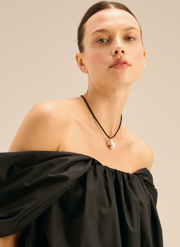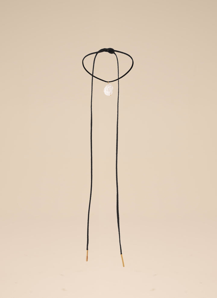 Намисто в стилі чокер, прикрашене срібними підвісками у формі серця.