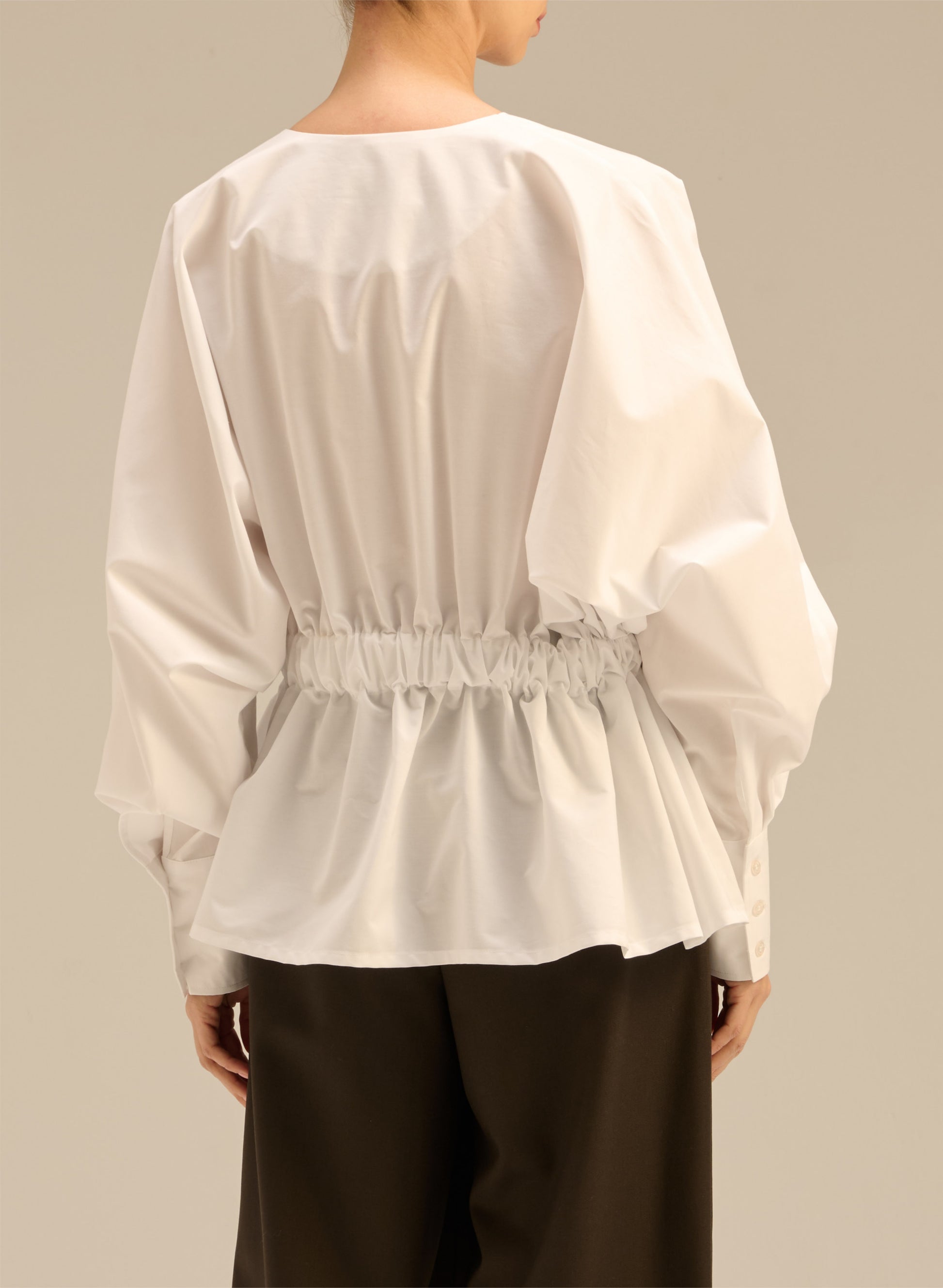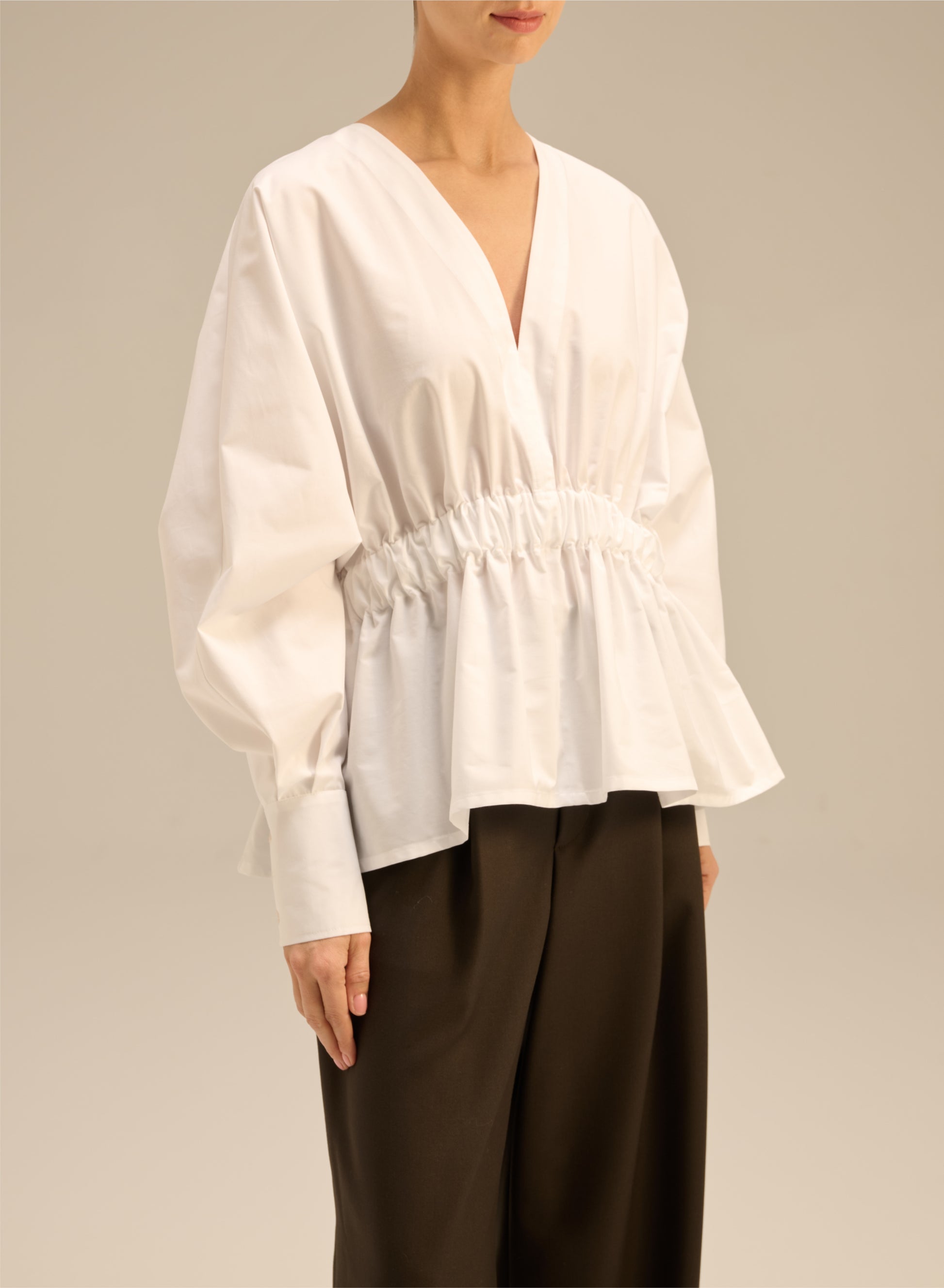 Вільна сорочка oversize з легкої білої бавовни. Має еластичну талію, довгі манжети на 3 гудзиках і V-подібний виріз.