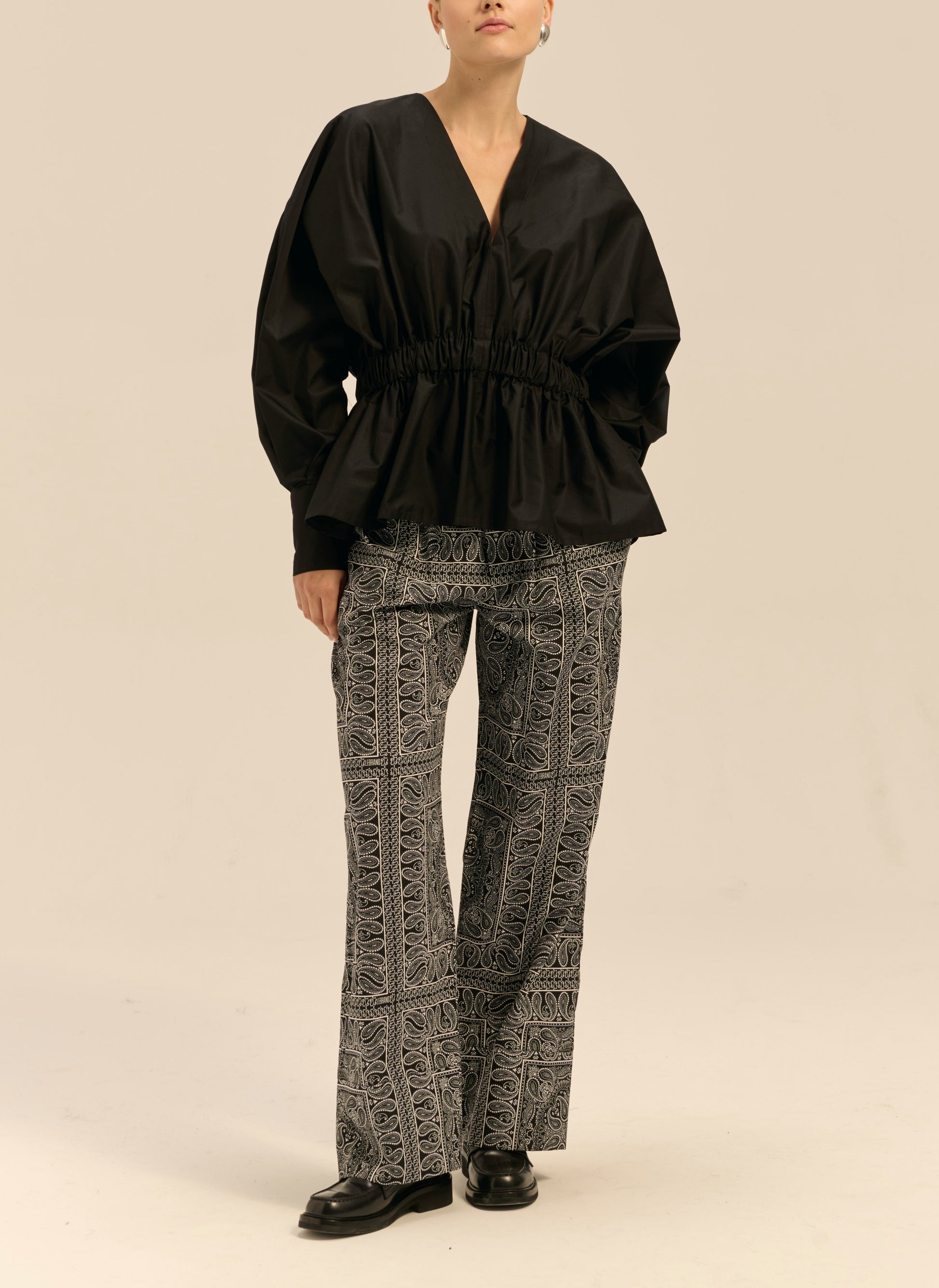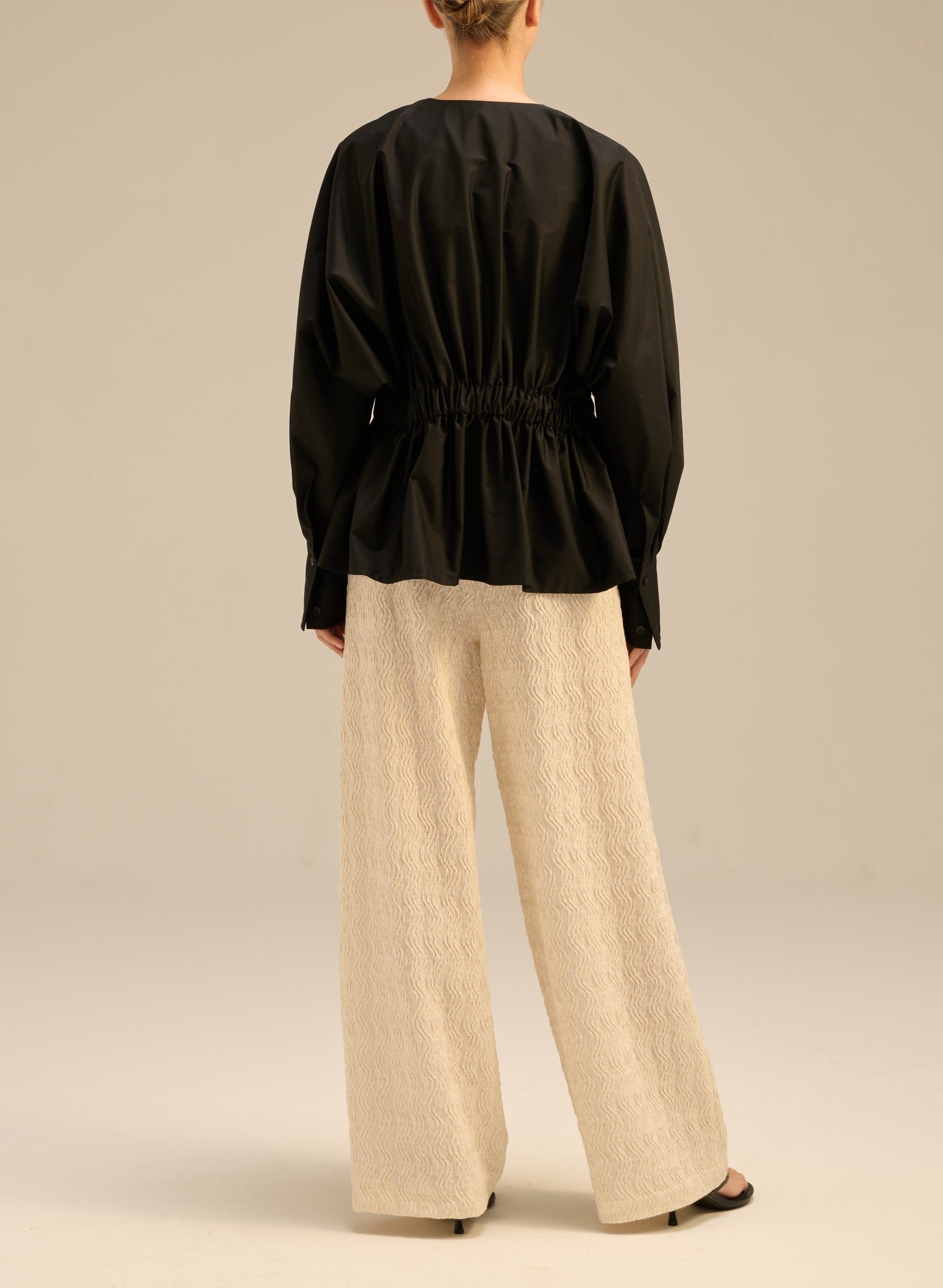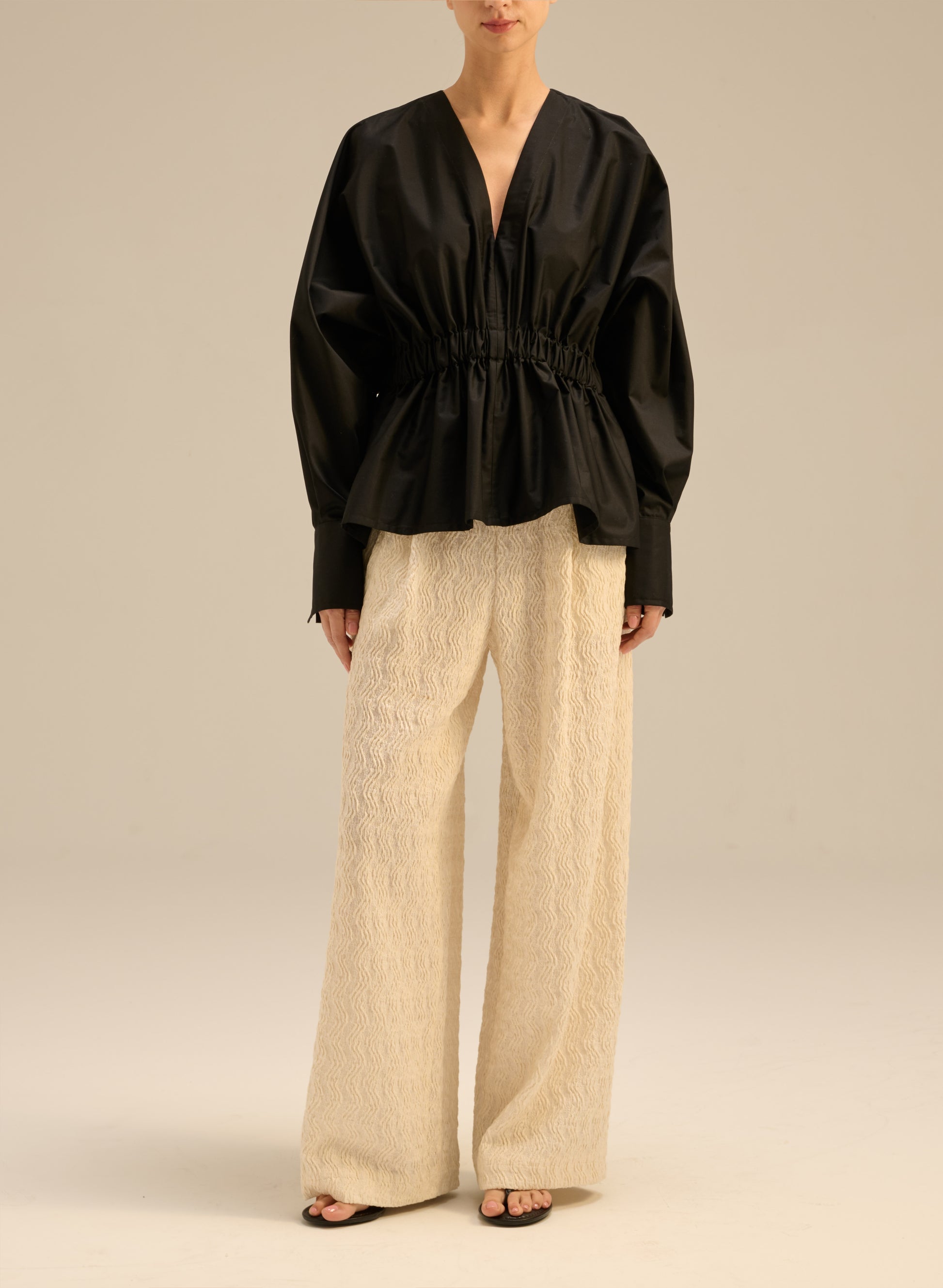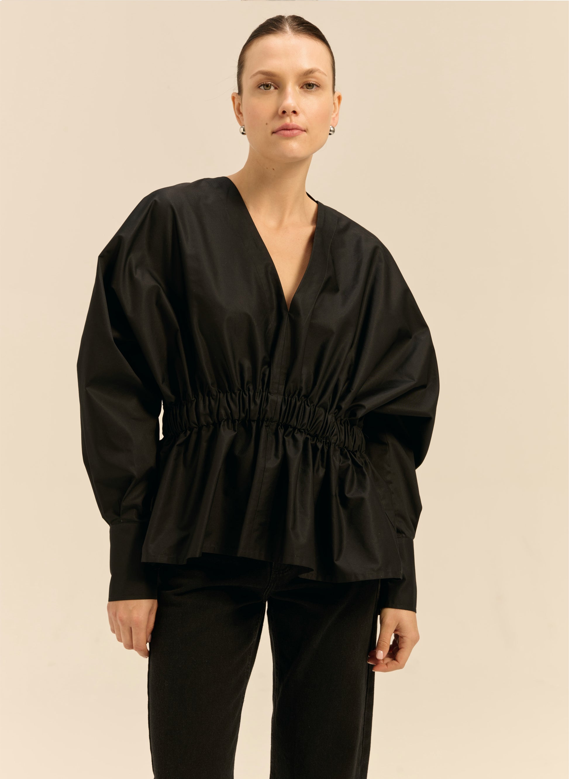 Вільна сорочка oversize з легкої чорної бавовни. Має еластичну талію, довгі манжети на 3 гудзиках і V-подібний виріз.