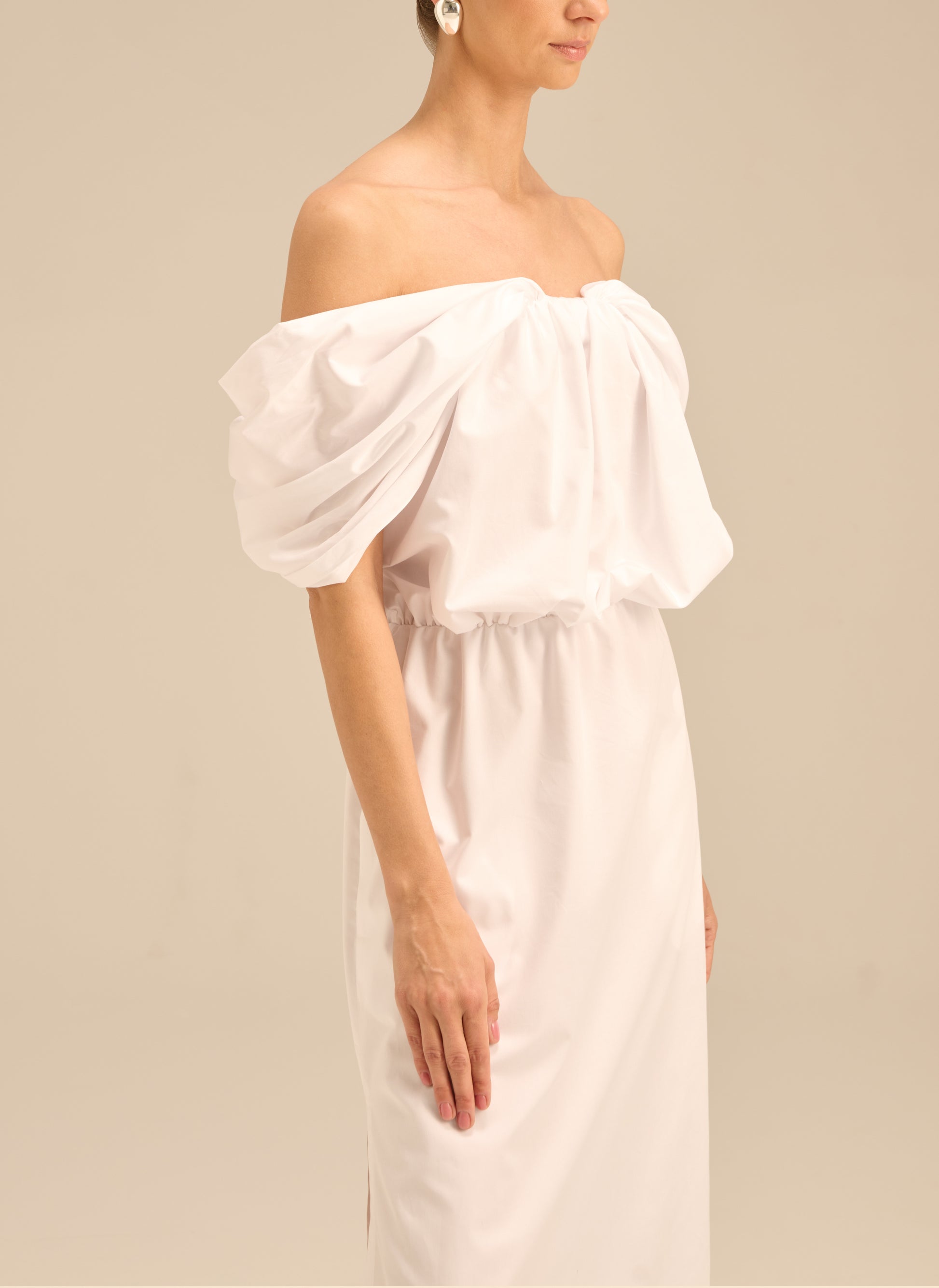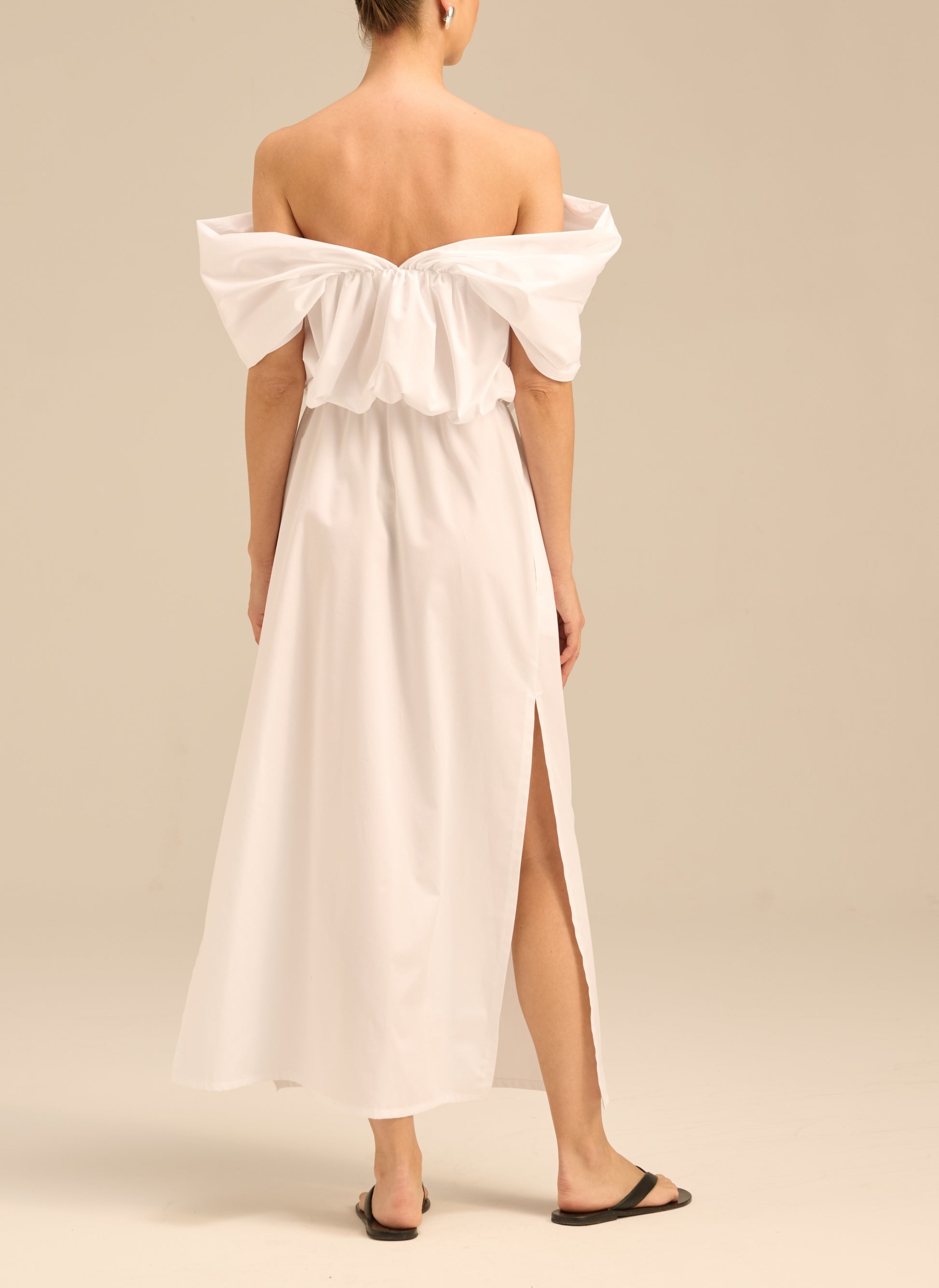 Sukienka o kroju maxi rozszerzanym ku dołowi, wykonana w całości z bawełny w kolorze białym. Posiada opadające ramiączka, dwie boczne kryte kieszenie, rozcięcie na dale po obu stronach oraz gumkę w talii.