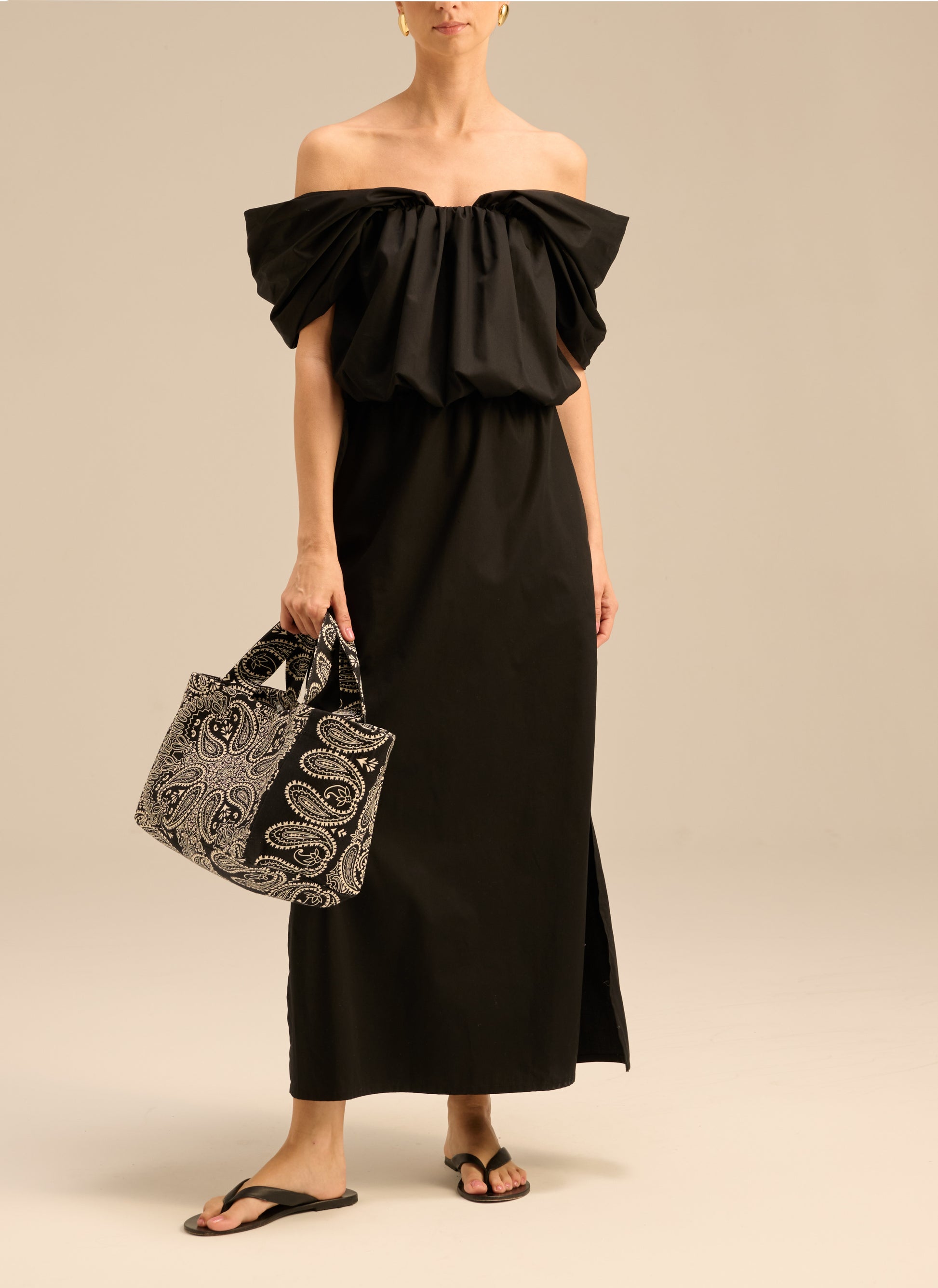 Sukienka o kroju maxi rozszerzanym ku dołowi, wykonana w całości z bawełny w czarnym kolorze. Posiada opadające ramiączka, dwie boczne kryte kieszenie, rozcięcie na dale po obu stronach oraz gumkę w talii.