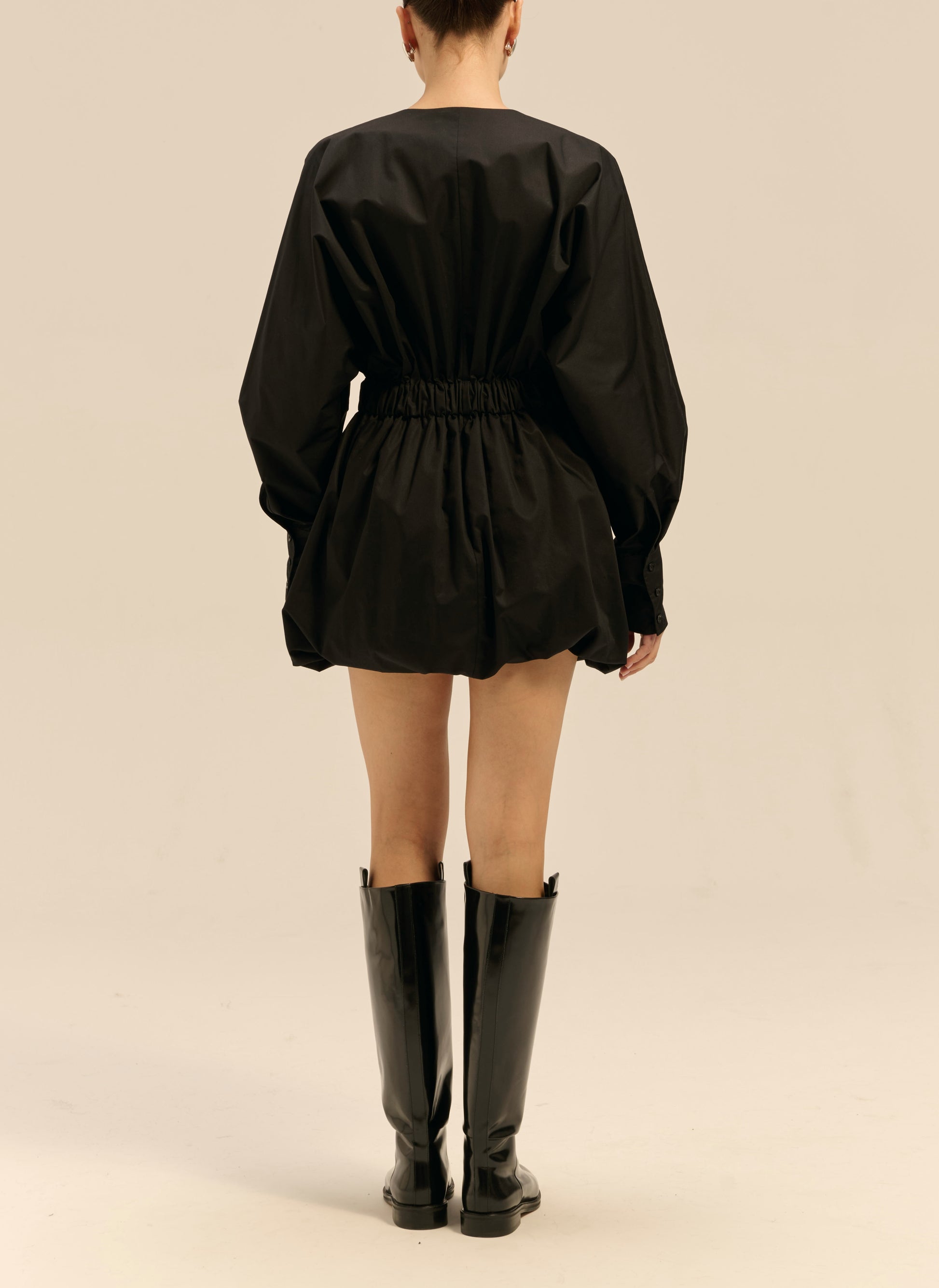Sukienka o długości mini i kroju oversize wykonana z lekkiej bawełny w czarnym kolorze. Posiada gumę w talii, długie mankiety zapinane na 3 guziki, elastyczny dół oraz dekolt w serek.