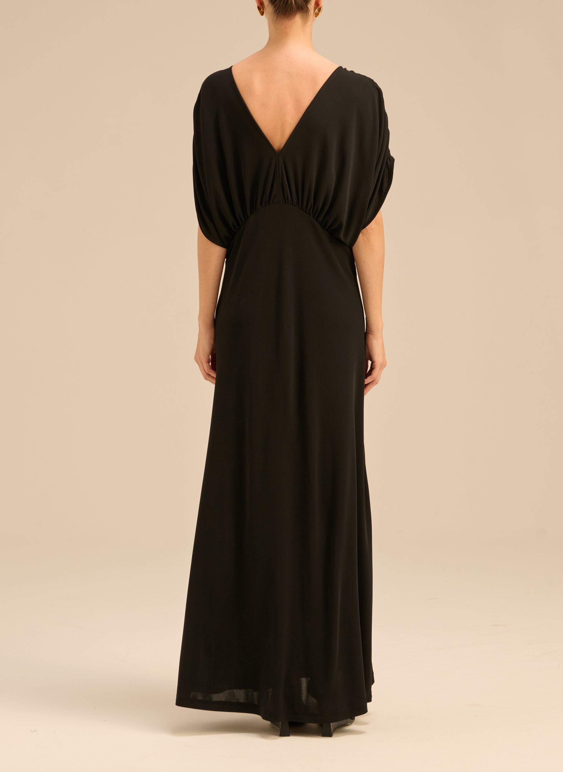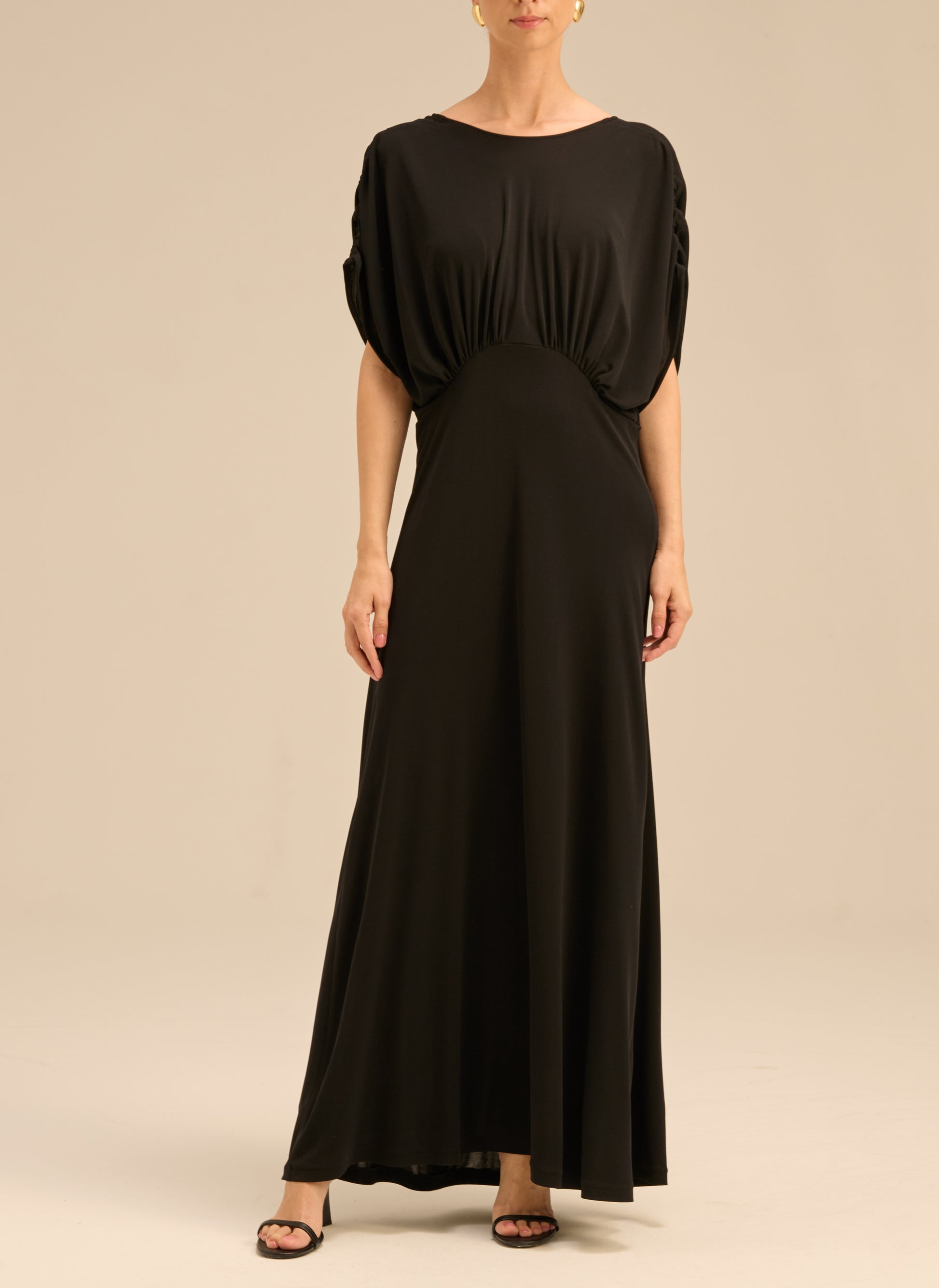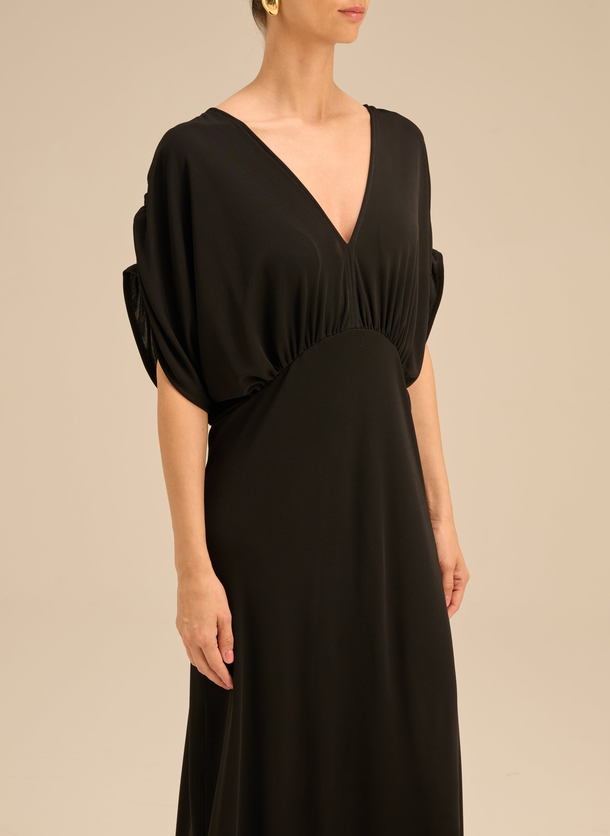 Sukienka o długości maxi, wykonana z lejącej tkaniny w kolorze czarnym. Posiada szerokie, opadające, krótkie rękawy oraz dekolt w literę V. Można nosić ją również z dekoltem na plecach.