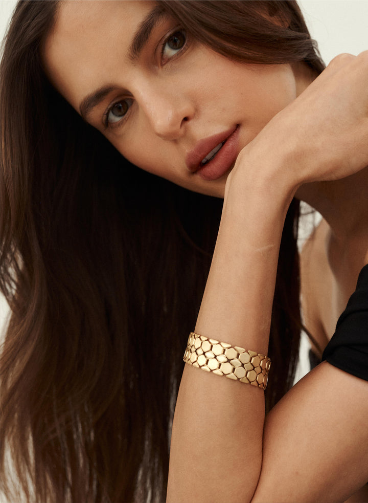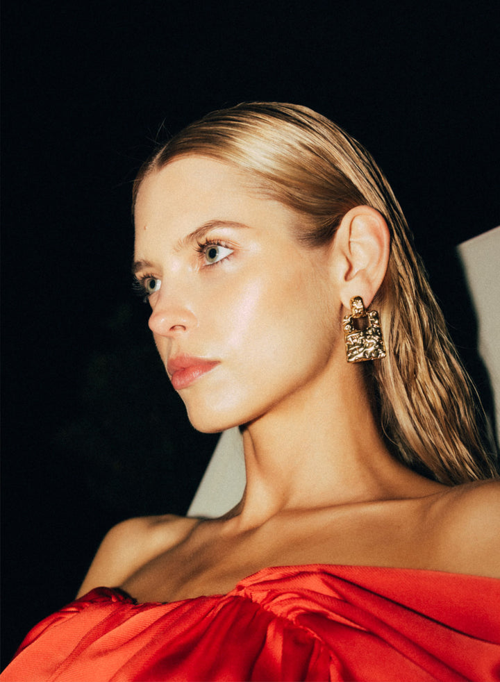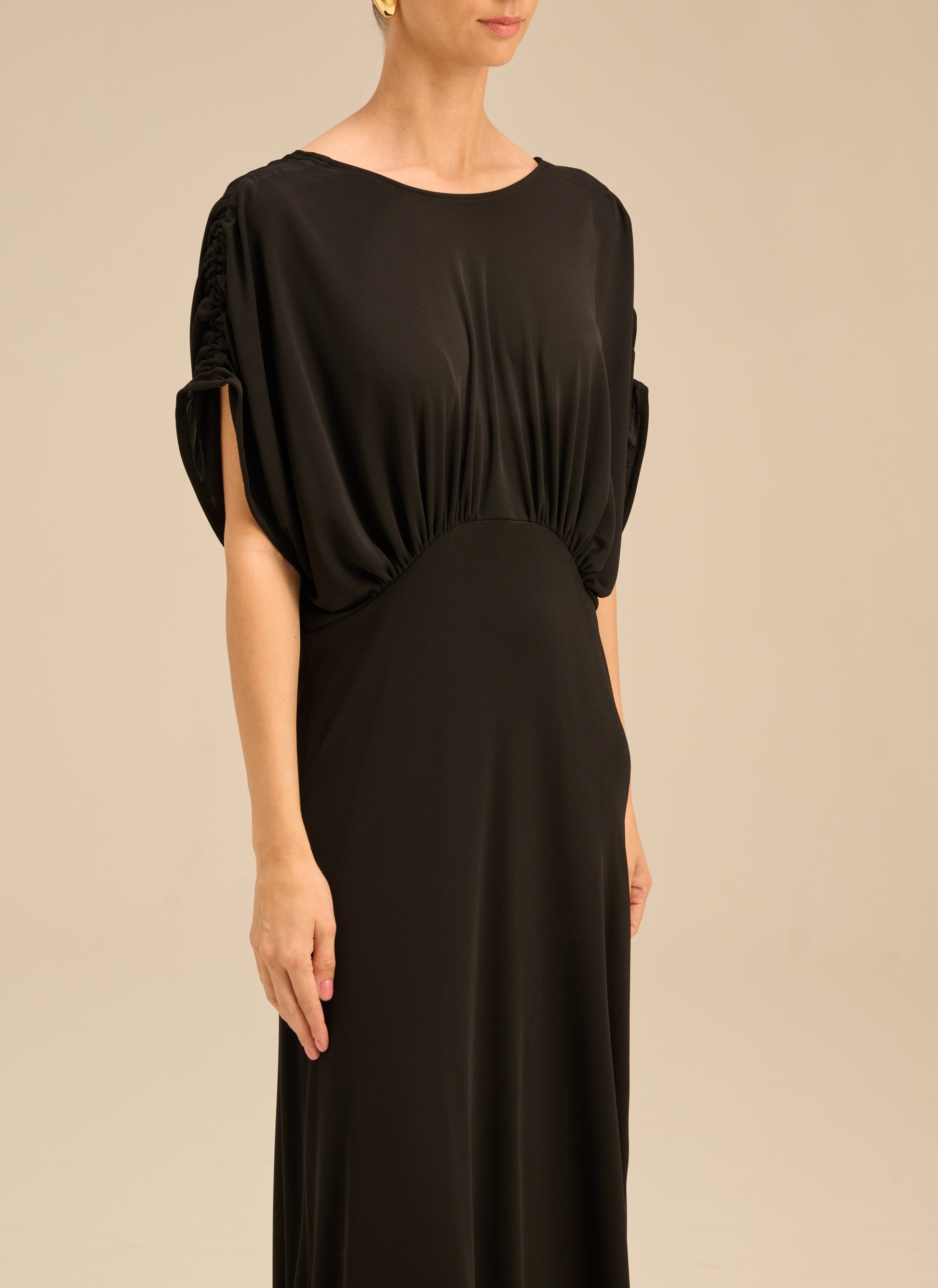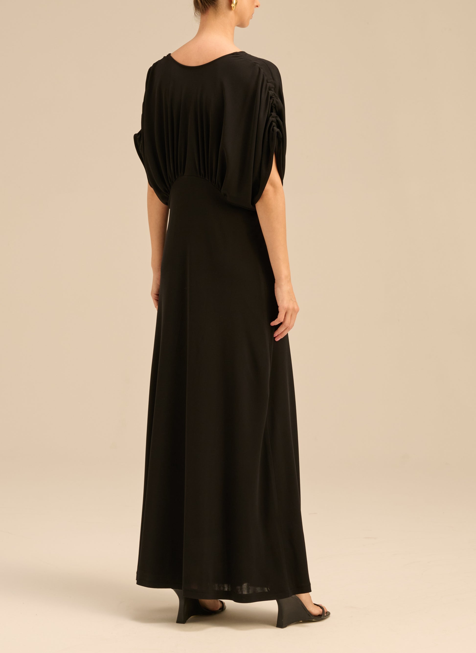 Sukienka o długości maxi, wykonana z lejącej tkaniny w kolorze czarnym. Posiada szerokie, opadające, krótkie rękawy oraz dekolt w literę V. Można nosić ją również z dekoltem na plecach.