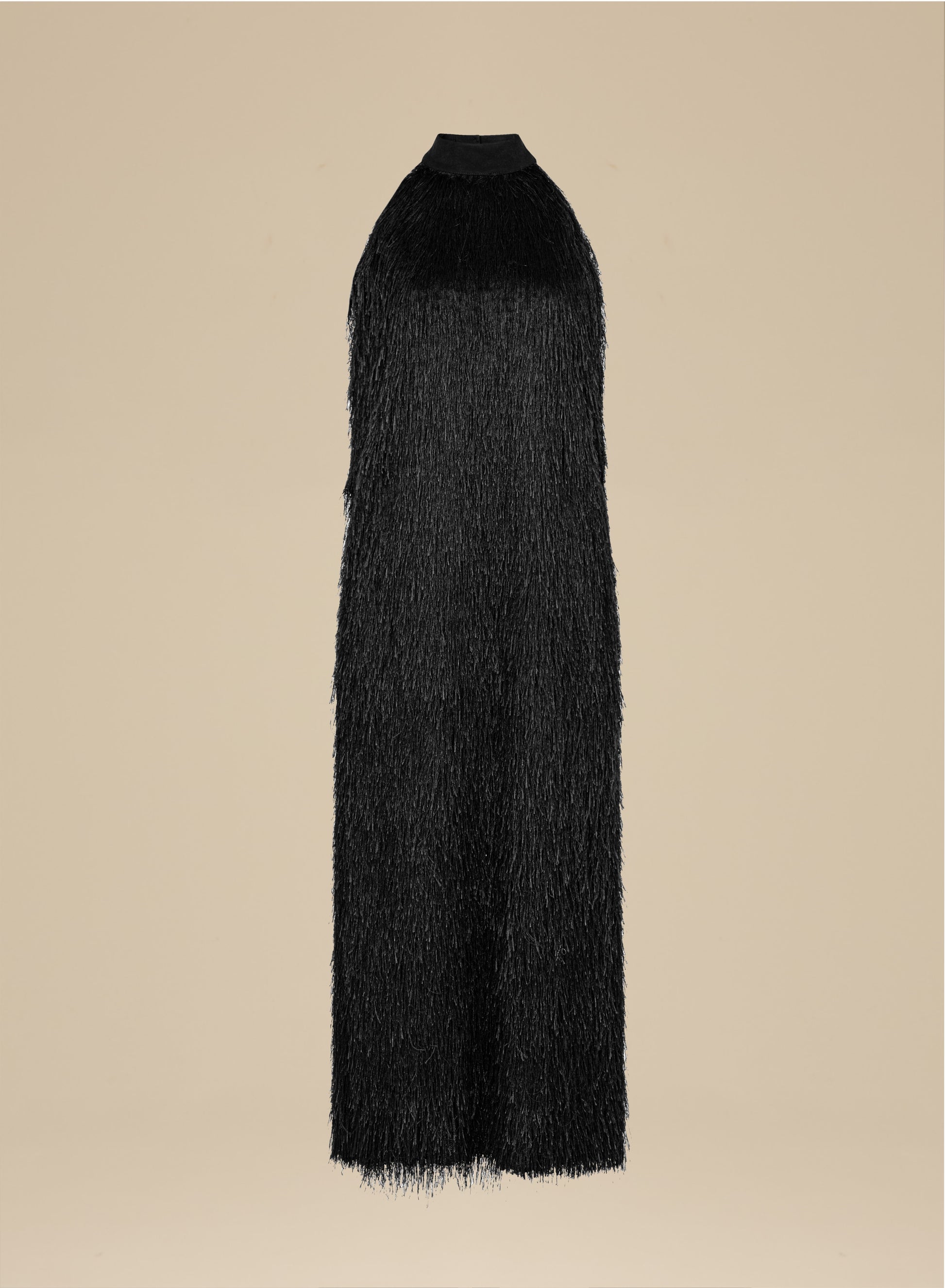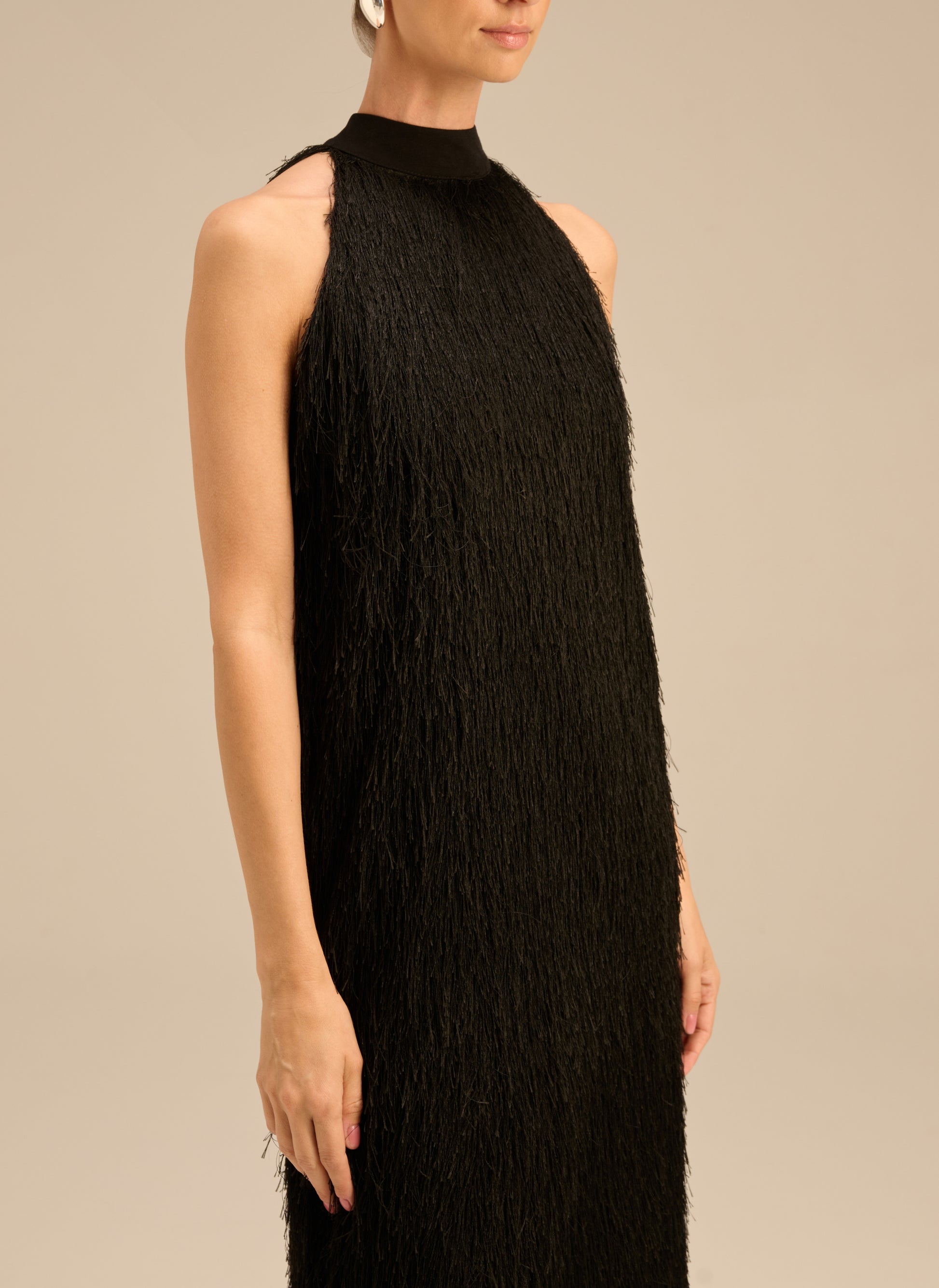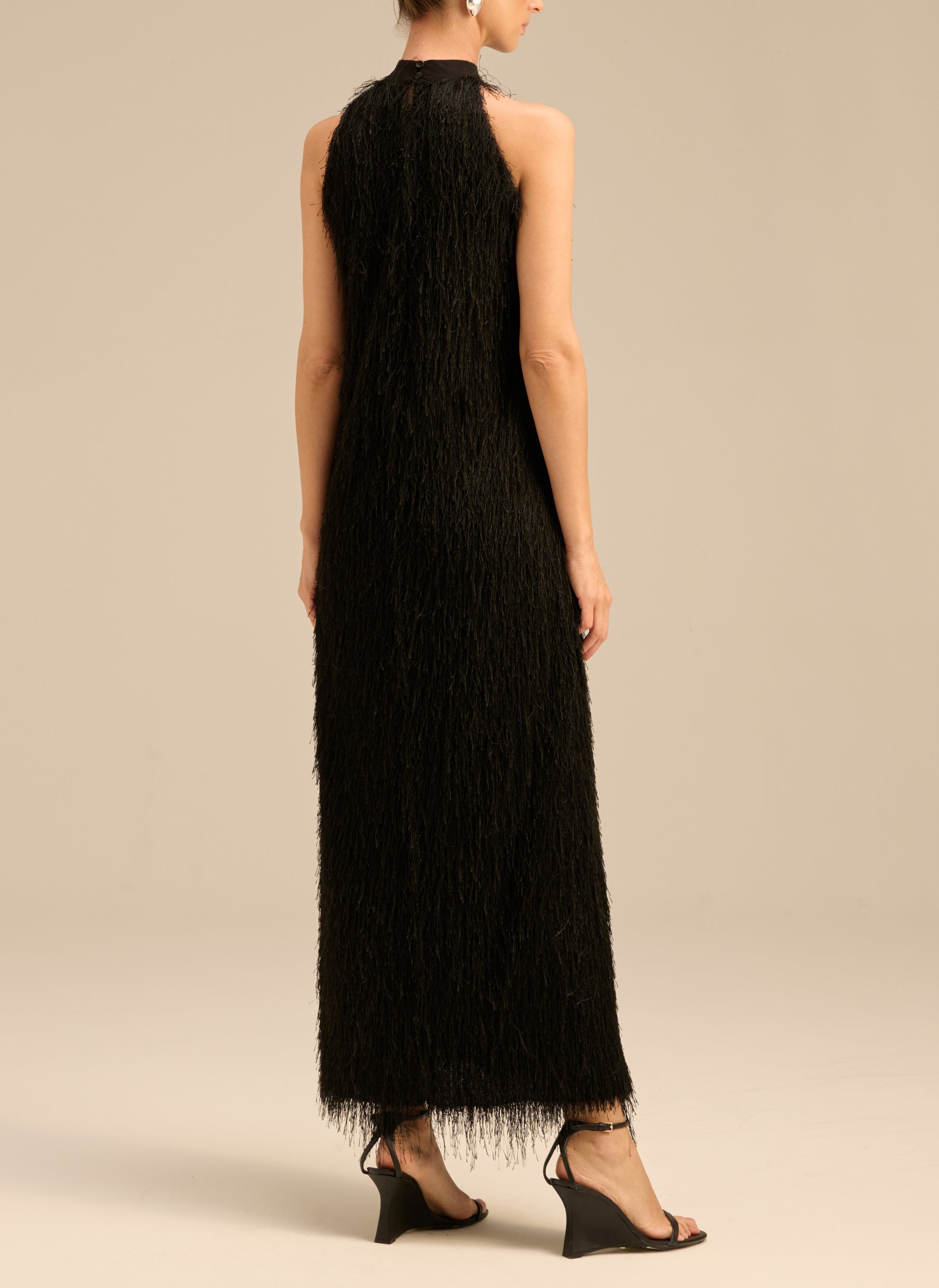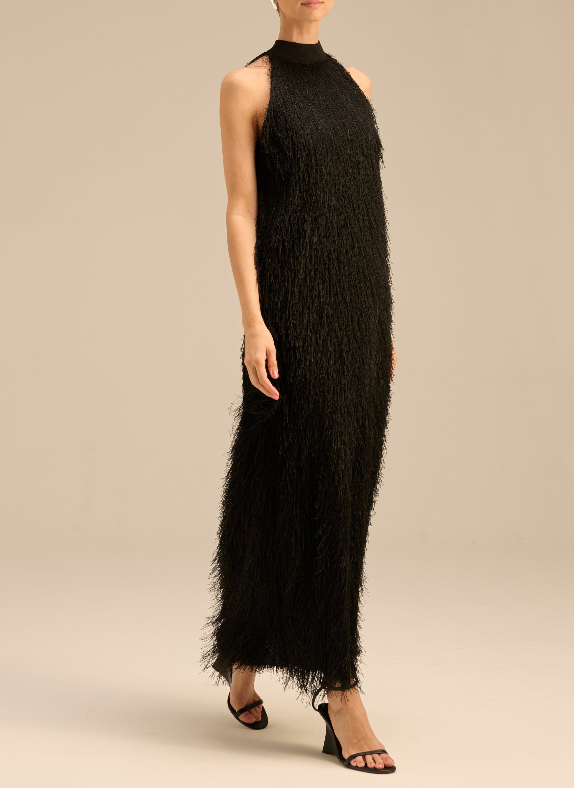 Sukienka maxi z górą w stylu halter, rozszerzana ku dołowi. Wykonana z lekkiego materiału pokrytego cienkimi frędzlami emitującymi włosy w kolorze czarnym. Posiada zapięcie na szyi na dwa guziki, trapezowy krój oraz odkryte ramiona.