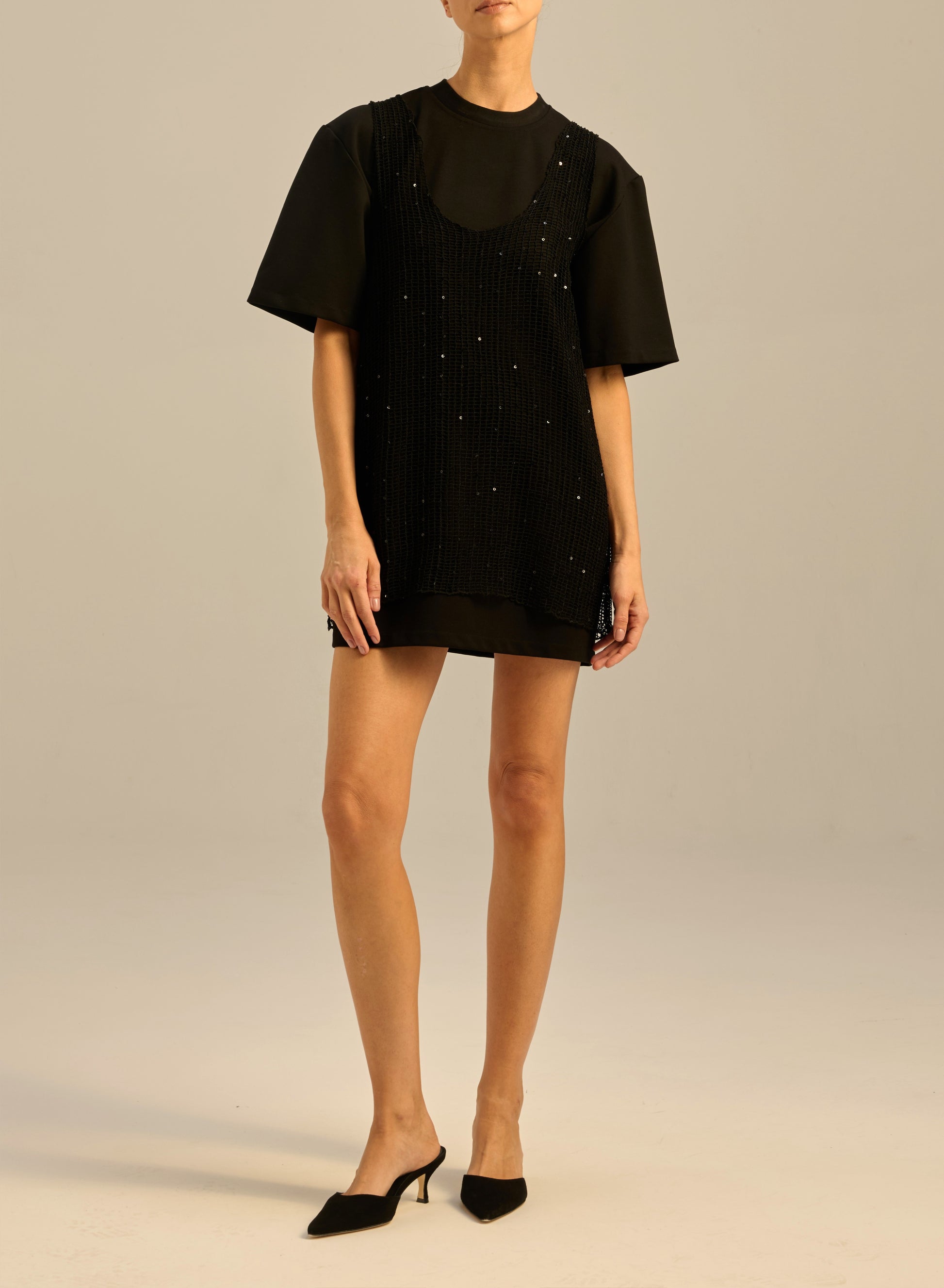 Міні-сукня без рукавів з сітчастої тканини, нерівномірно прикрашена паєтками. На фото з міні-сукнею Davis.