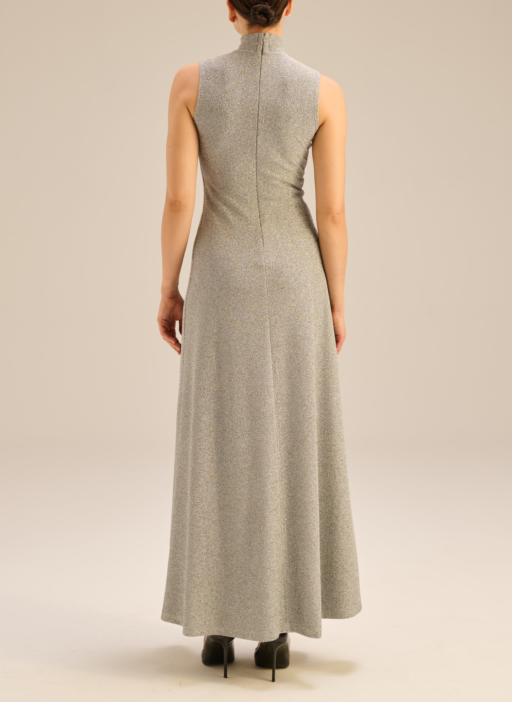 Sukienka bez rękawów o dopasowanym kroju i długości maxi. Wykonana z lekkiej tkaniny typu siateczka w kolorze srebrnym. Posiada krótką stójkę oraz zabudowany dekolt.