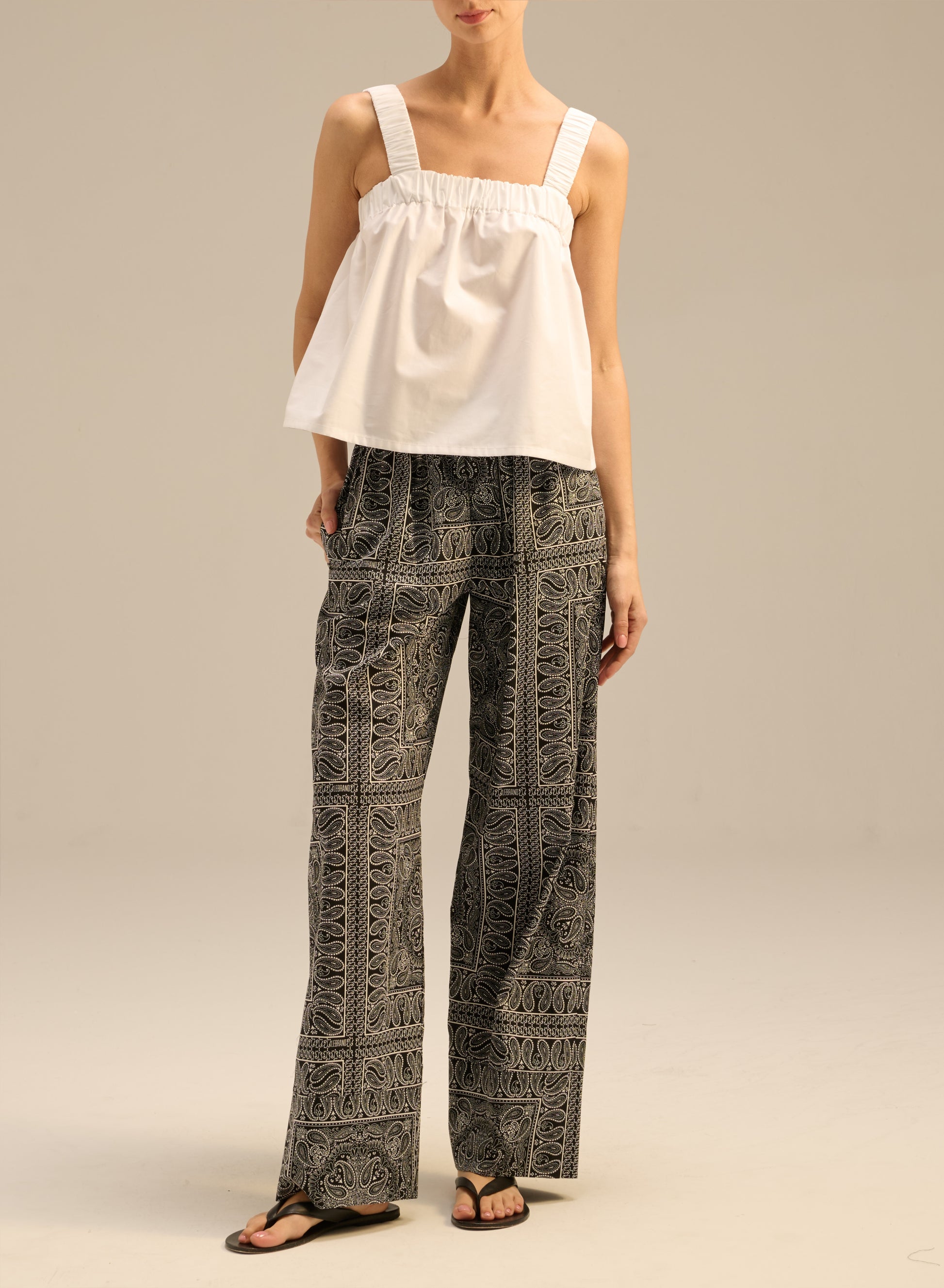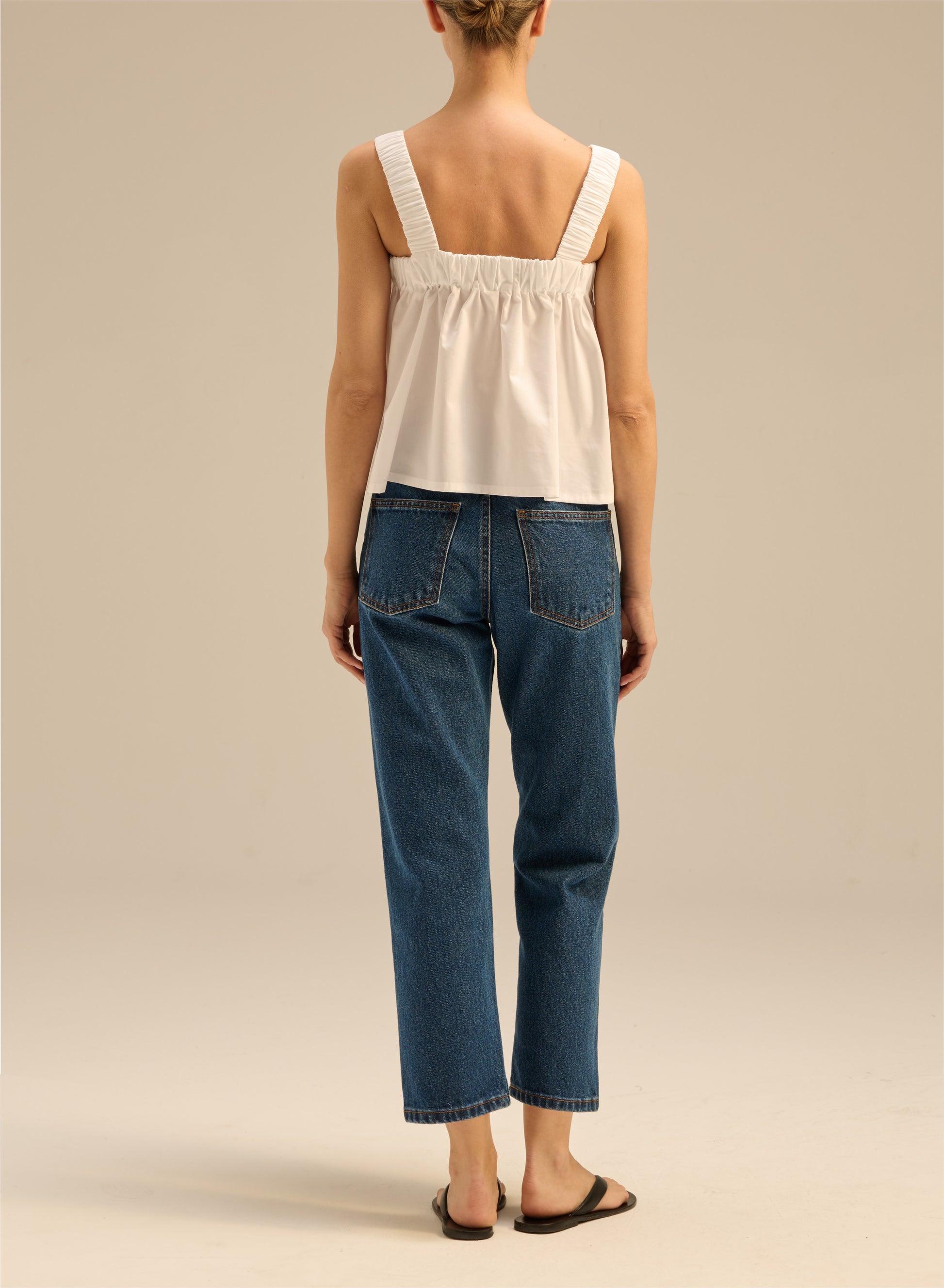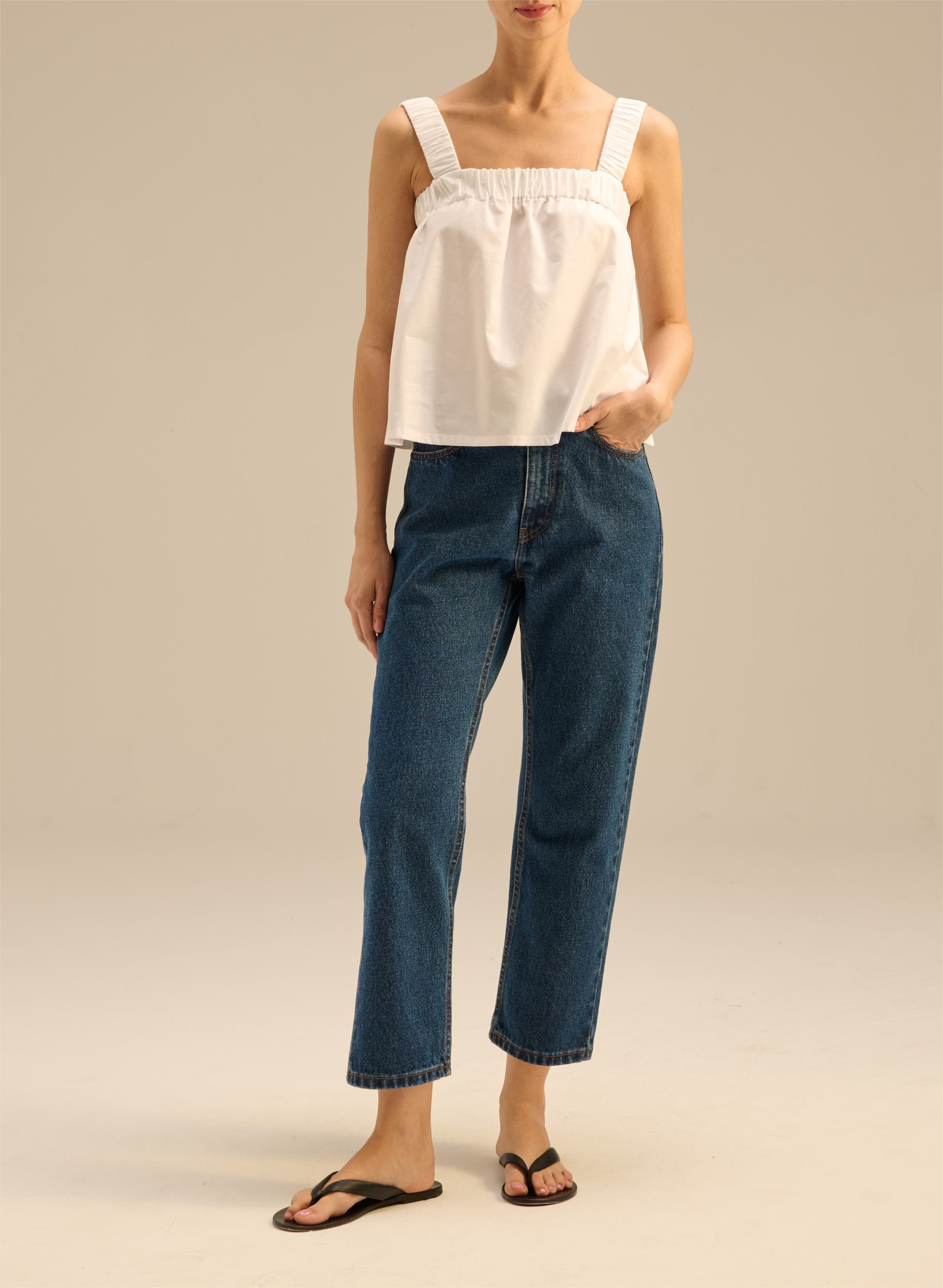 Короткий топ з гладкого білого матеріалу. Має товсті зібрані бретелі, гумку в горловині та вільний крій.