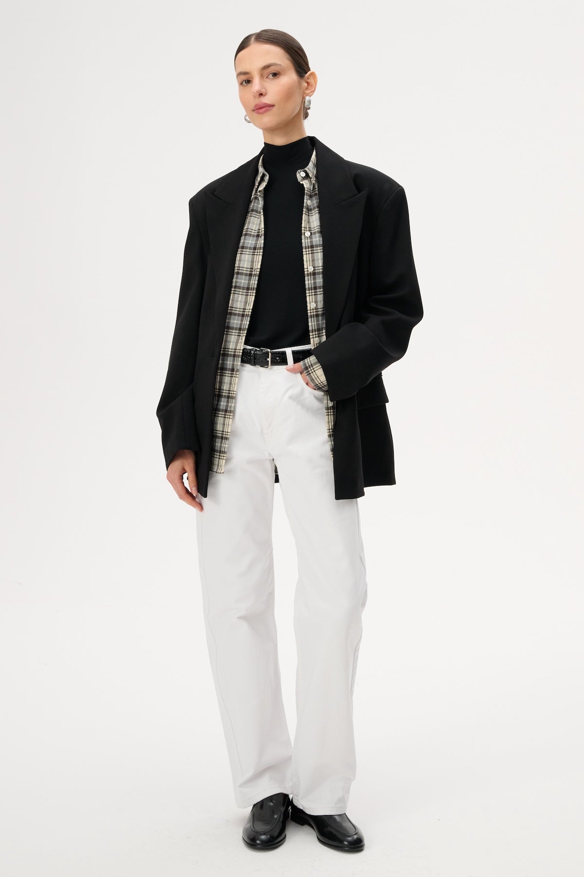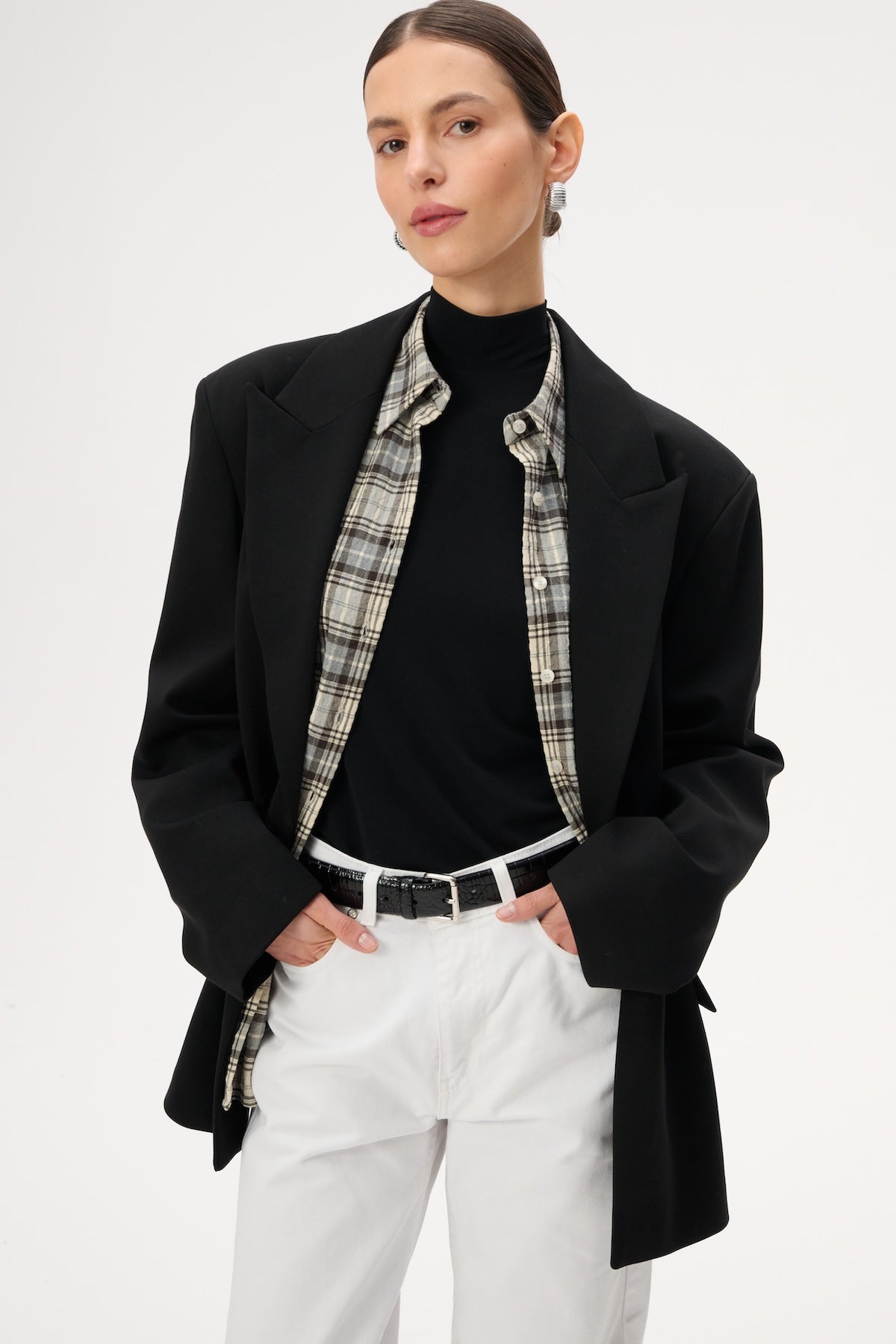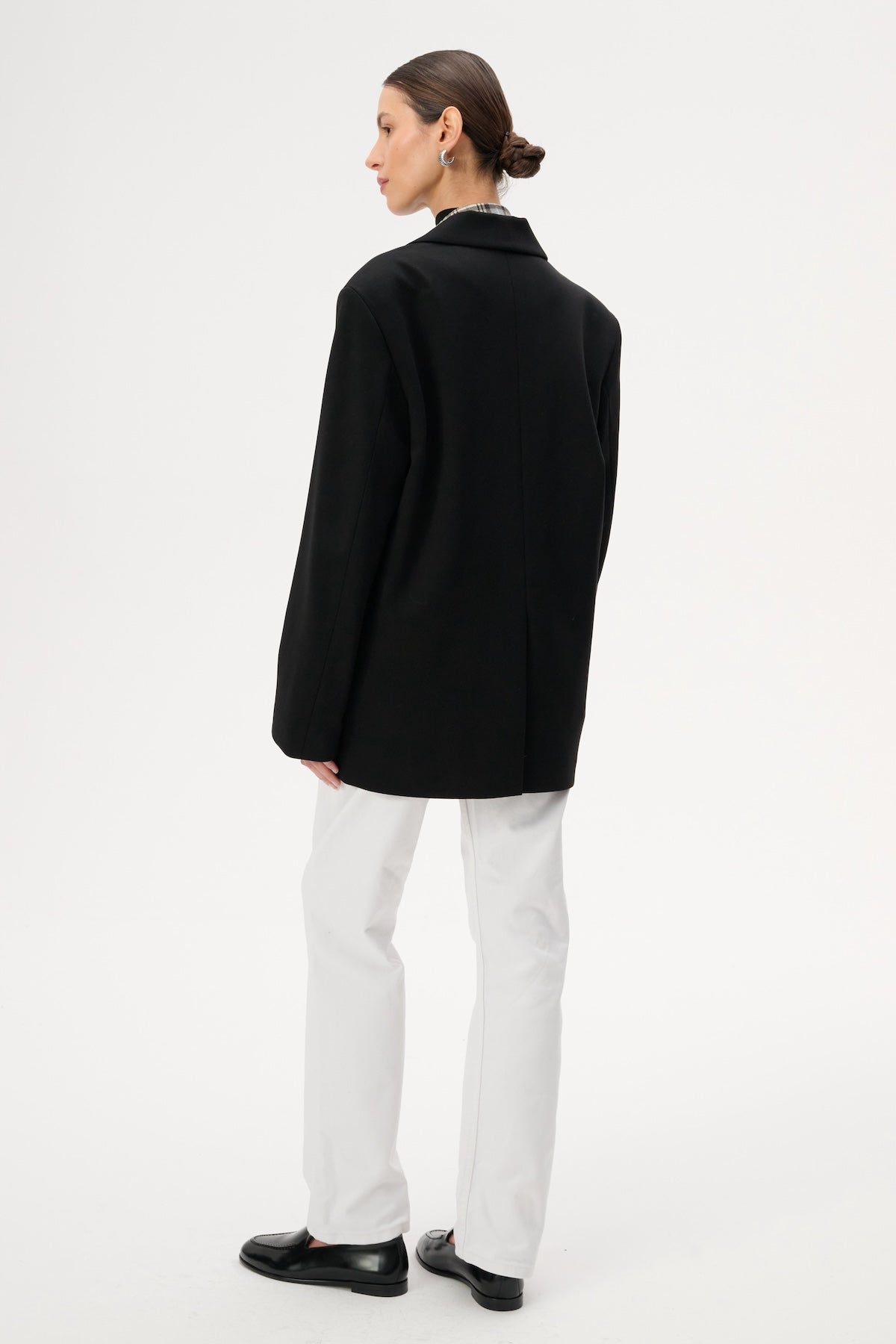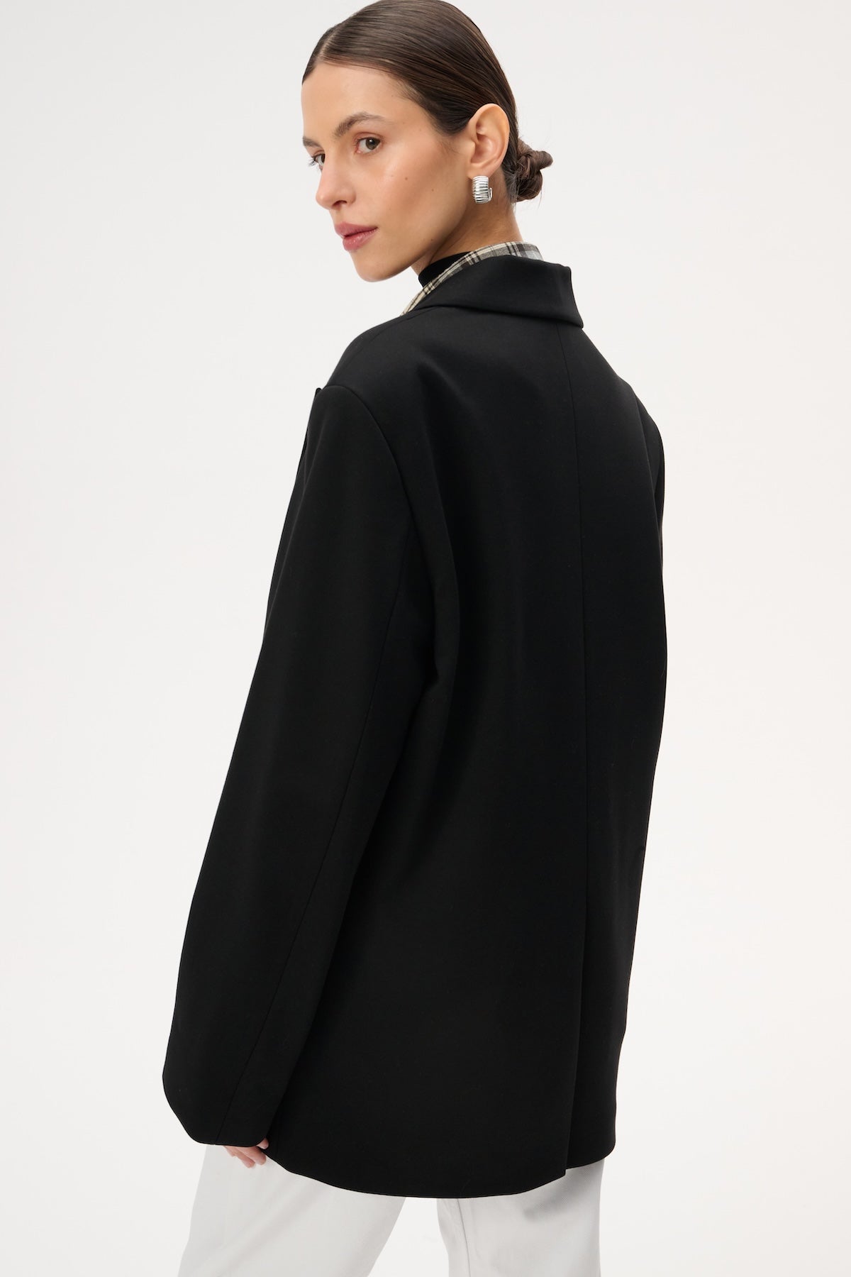 Довгий жакет oversize. Має довгі шалеві лацкани та застібається на один гудзик. Виготовлена з щільного трикотажу чорного кольору.