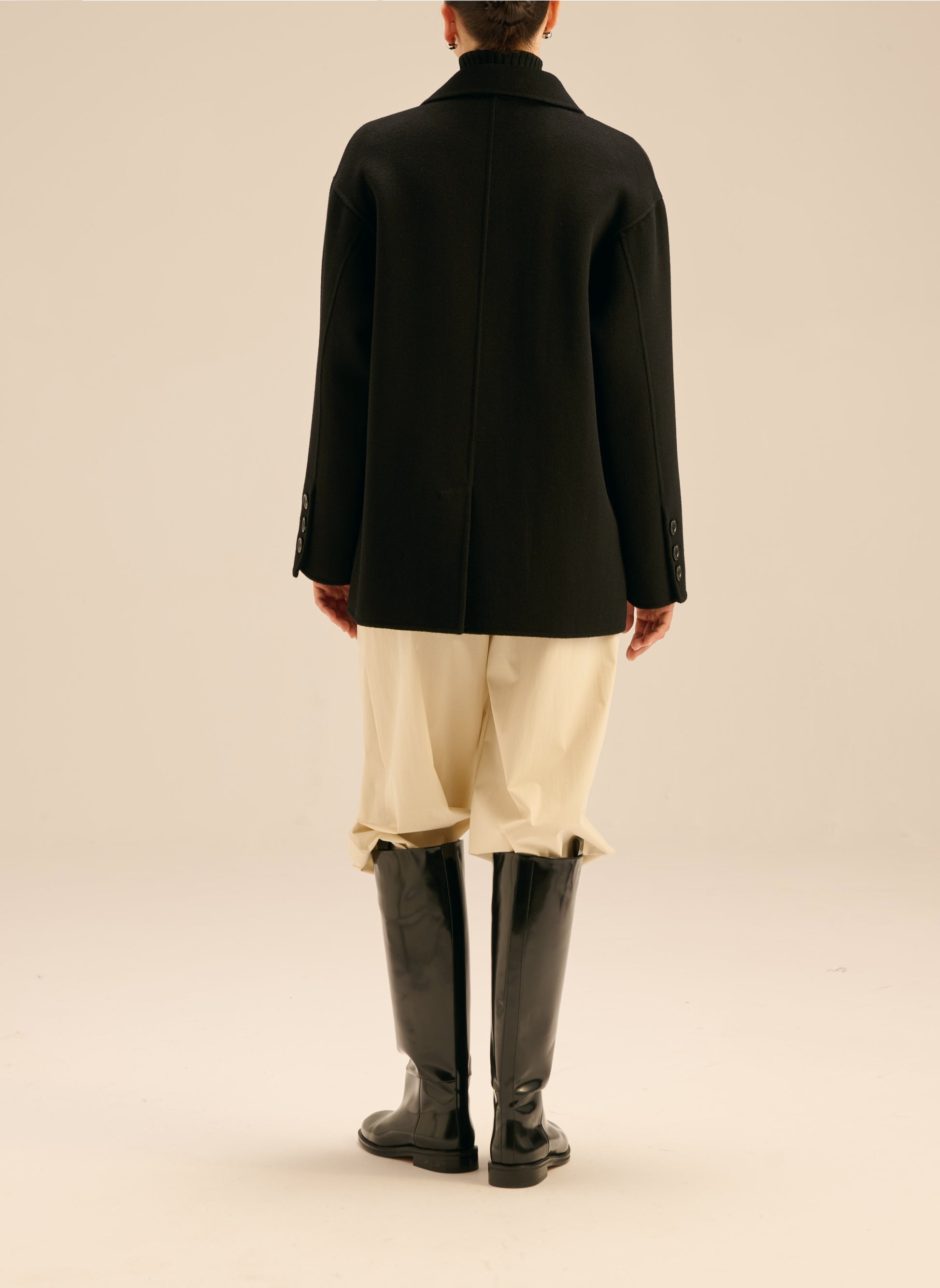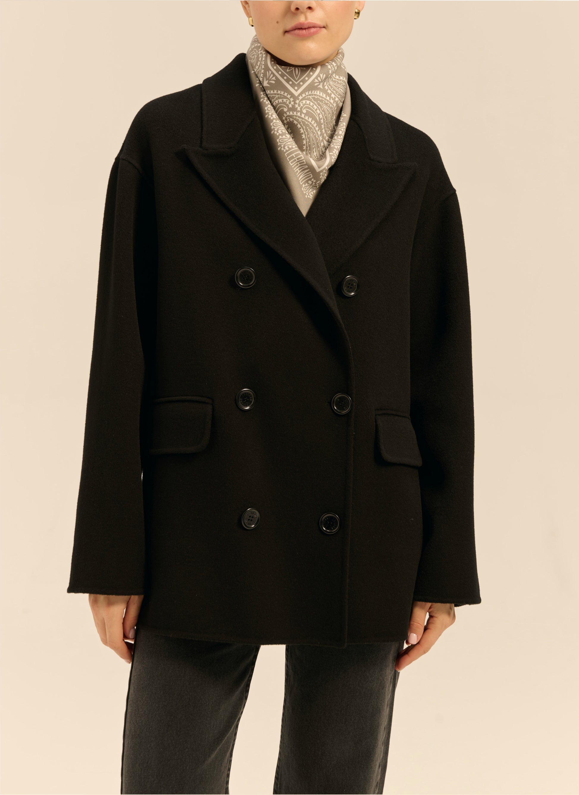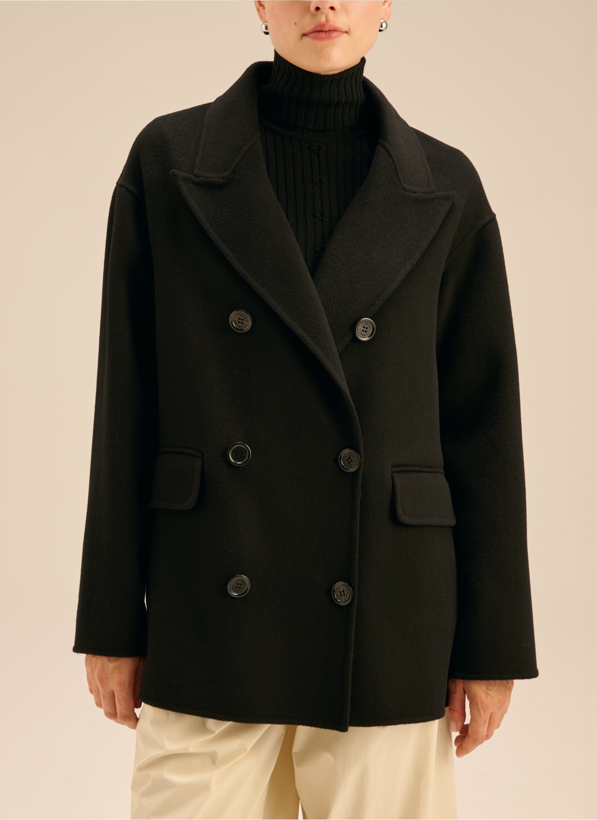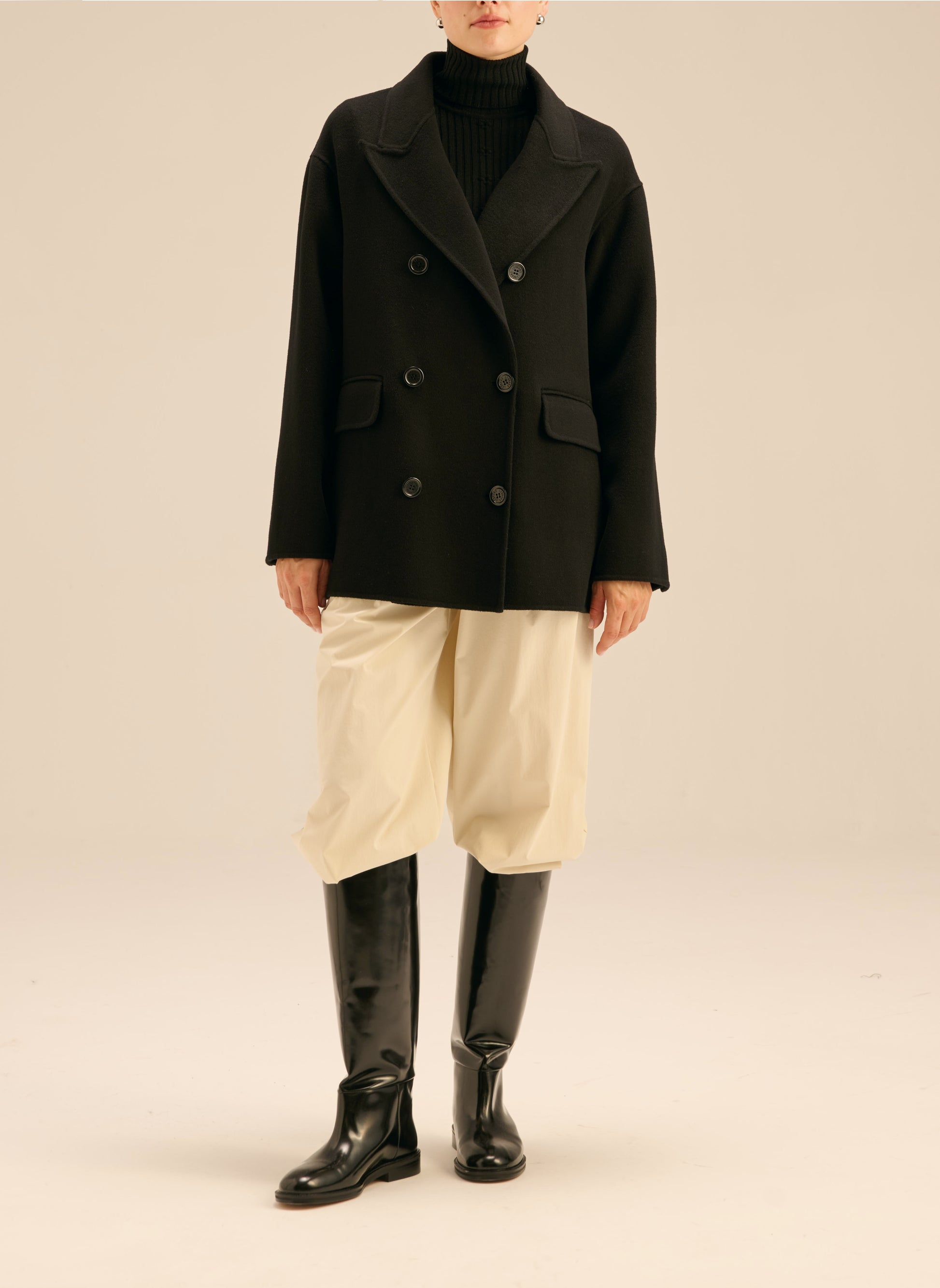 Długa marynarka o kroju oversize. Wykonana w 100% z miękkiej wełny w czarnym kolorze. Posiada dwurzędowe zapięcie na guziki i szerokie klapy. Model bez podszewki/ double face.