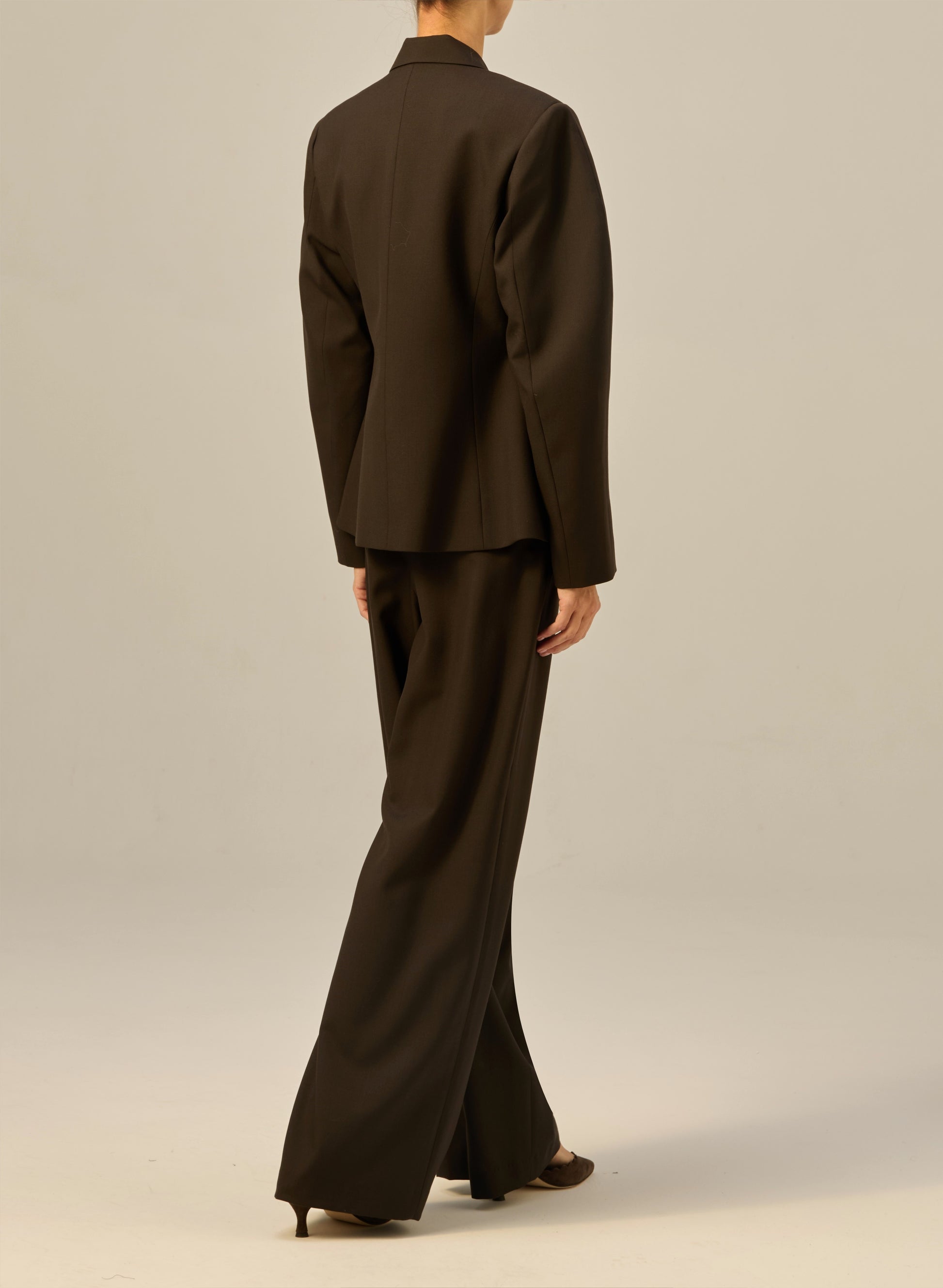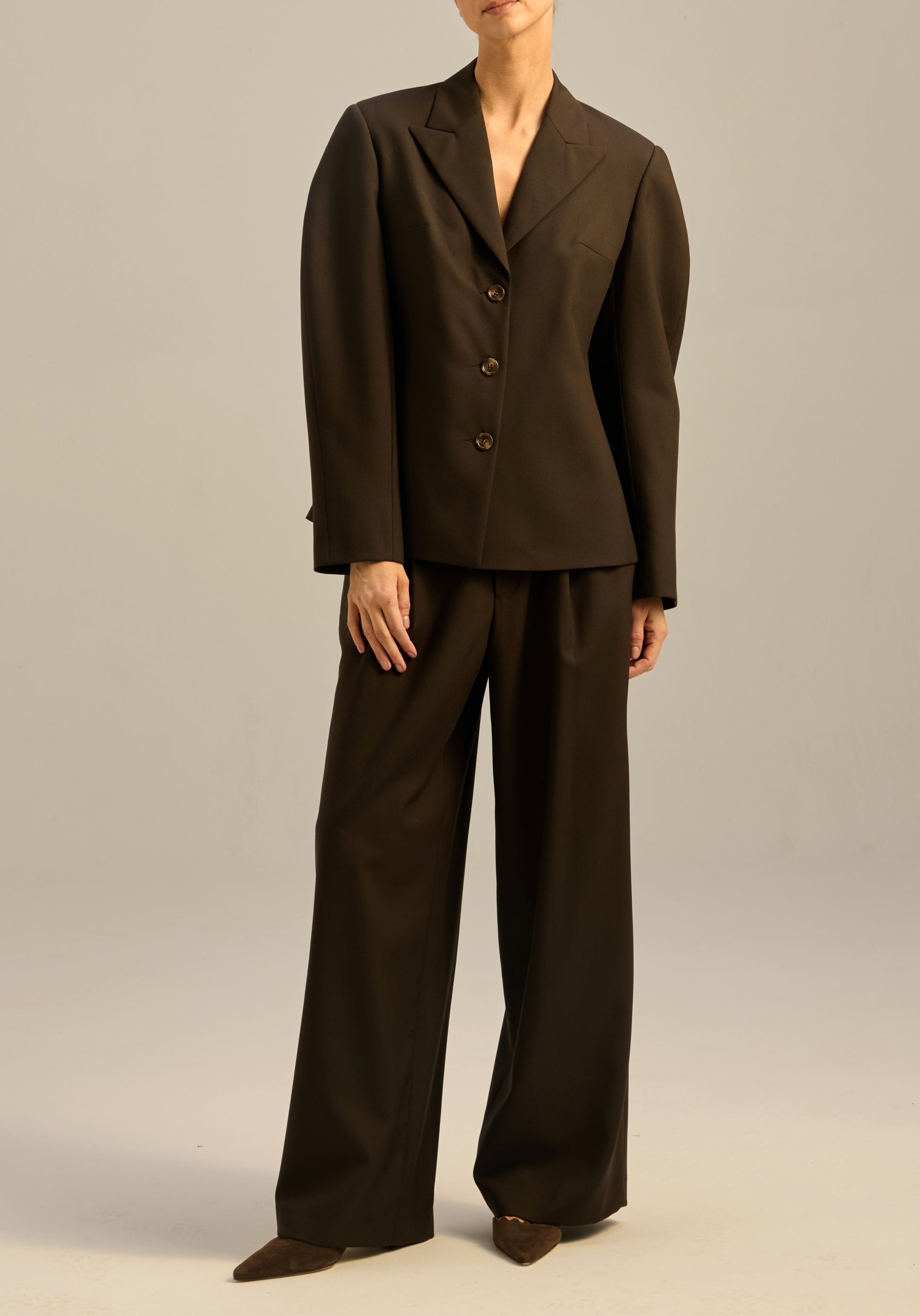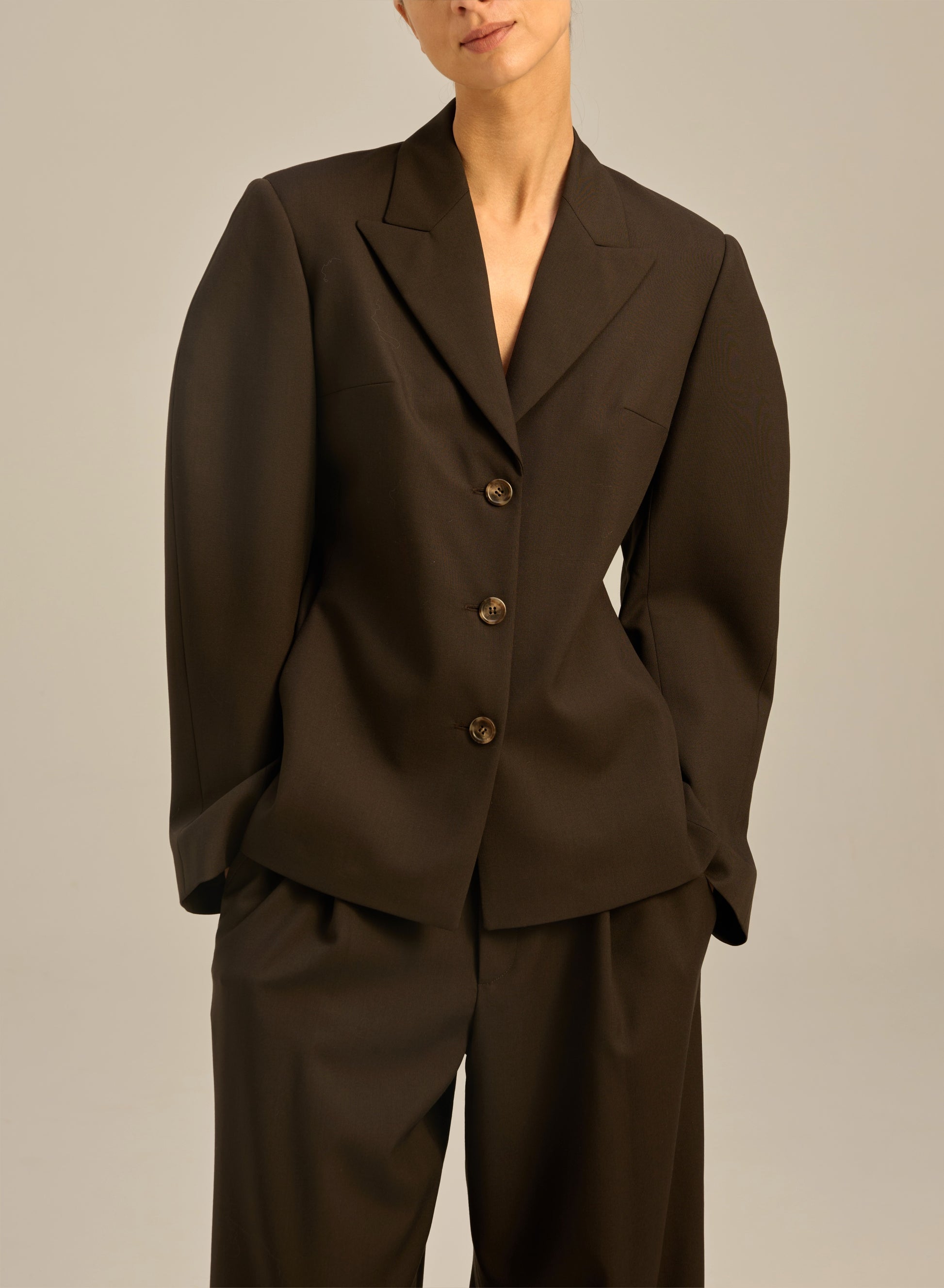 Приталена куртка з м'якої вовни оливкового кольору. Має помітні плечі та рукав незвичайної округлої конструкції.