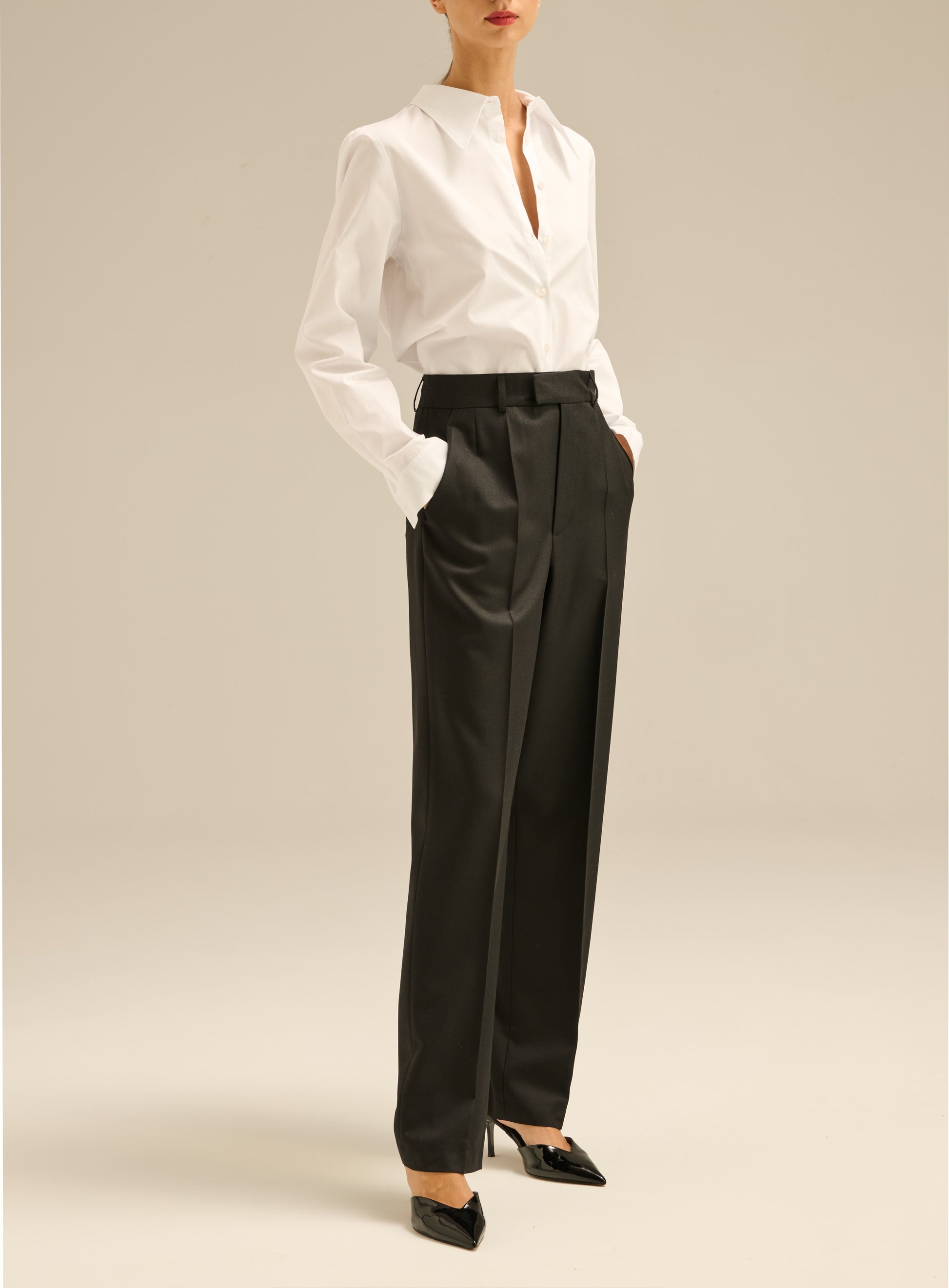Класичні штани з прямими довгими штанинами. Виготовлений з костюмної вовни насиченого чорного кольору. Мають завищену талію, бічні та задні кишені.