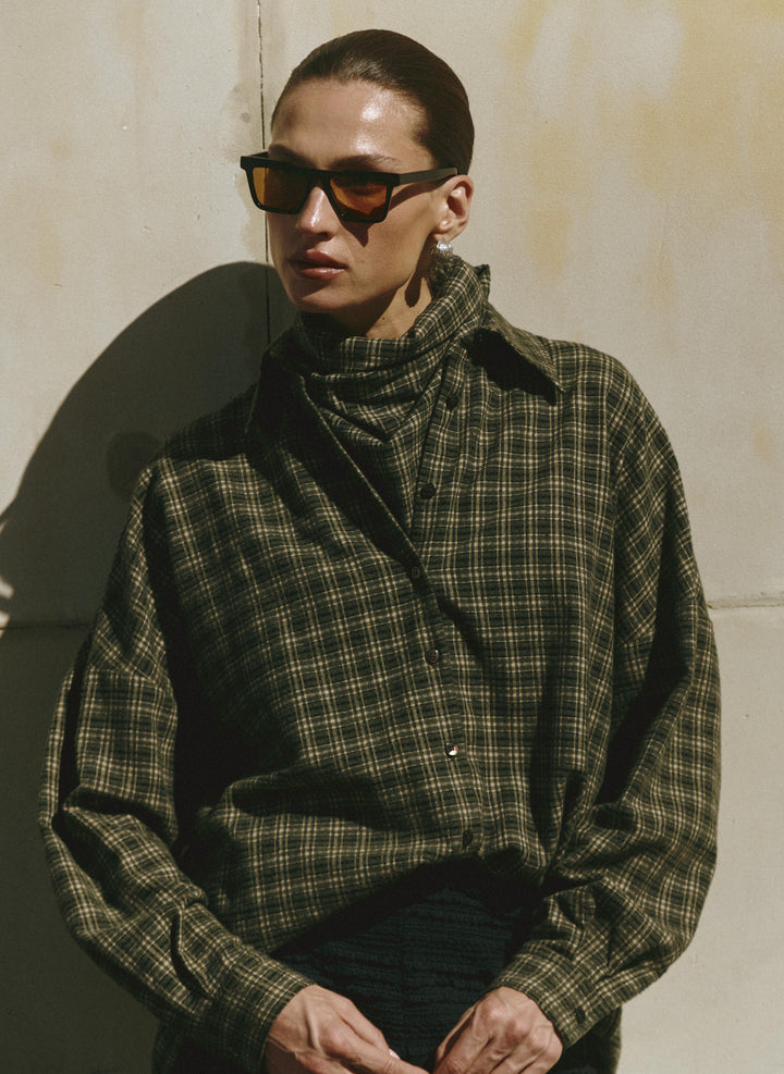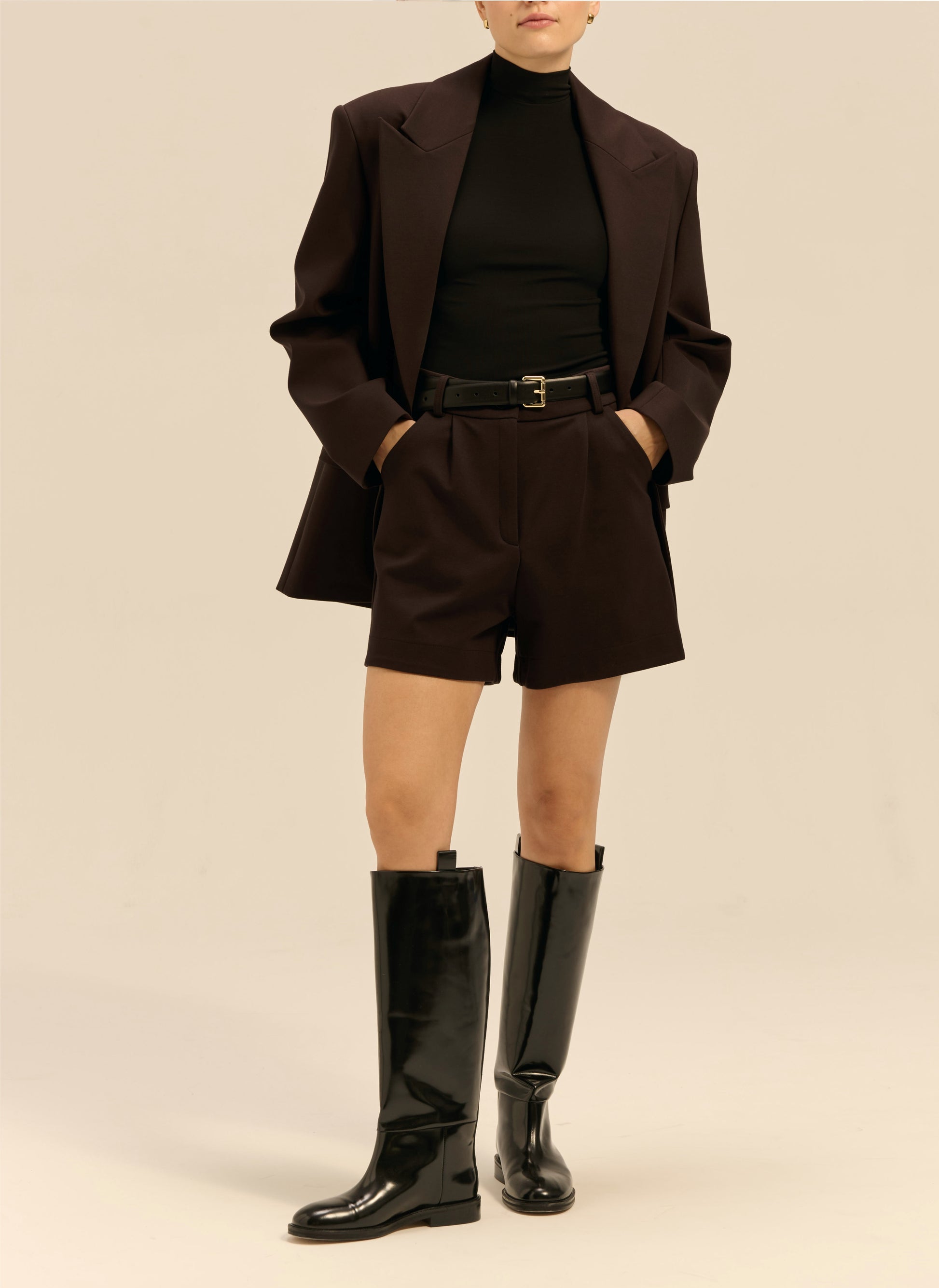Елегантні шорти із завищеною талією з ніжного трикотажу коричневого кольору. Вони мають вільні штанини, дві бічні кишені, шлевки на талії та застібаються на блискавку та ґудзики.