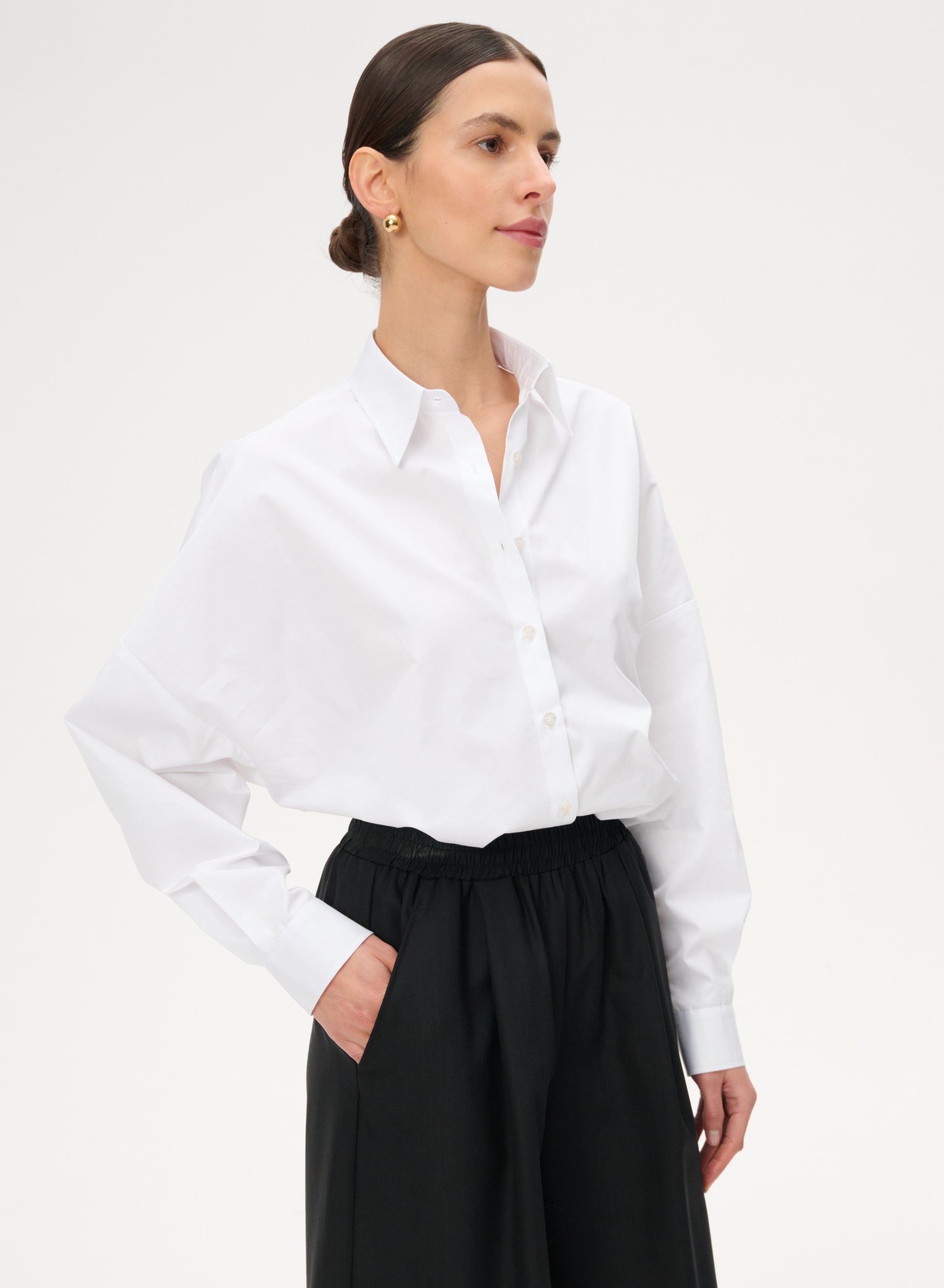 Oversize'owa koszula wykonana z bawełny w kolorze białym. Posiada klasyczny kołnierzyk i długie rękawy wykończone mankietami.