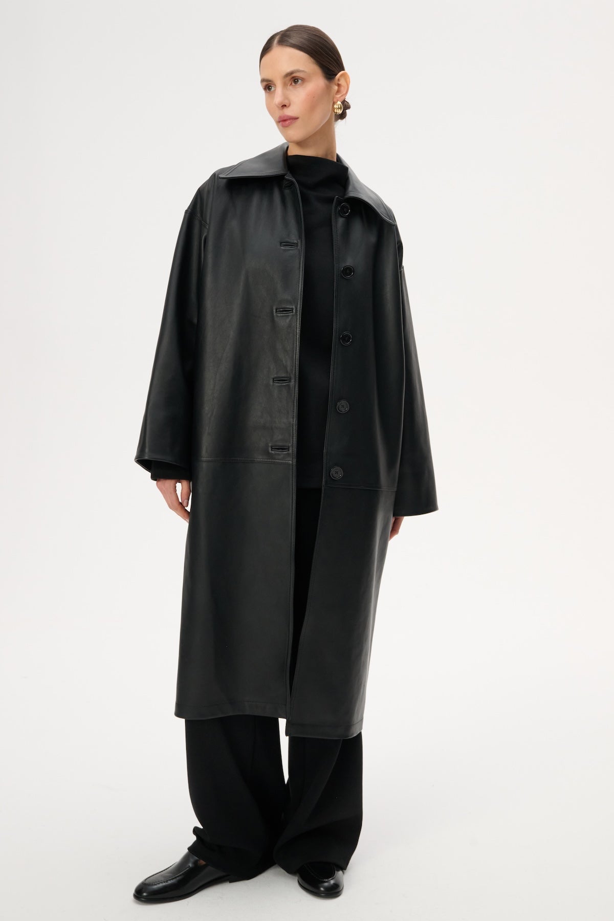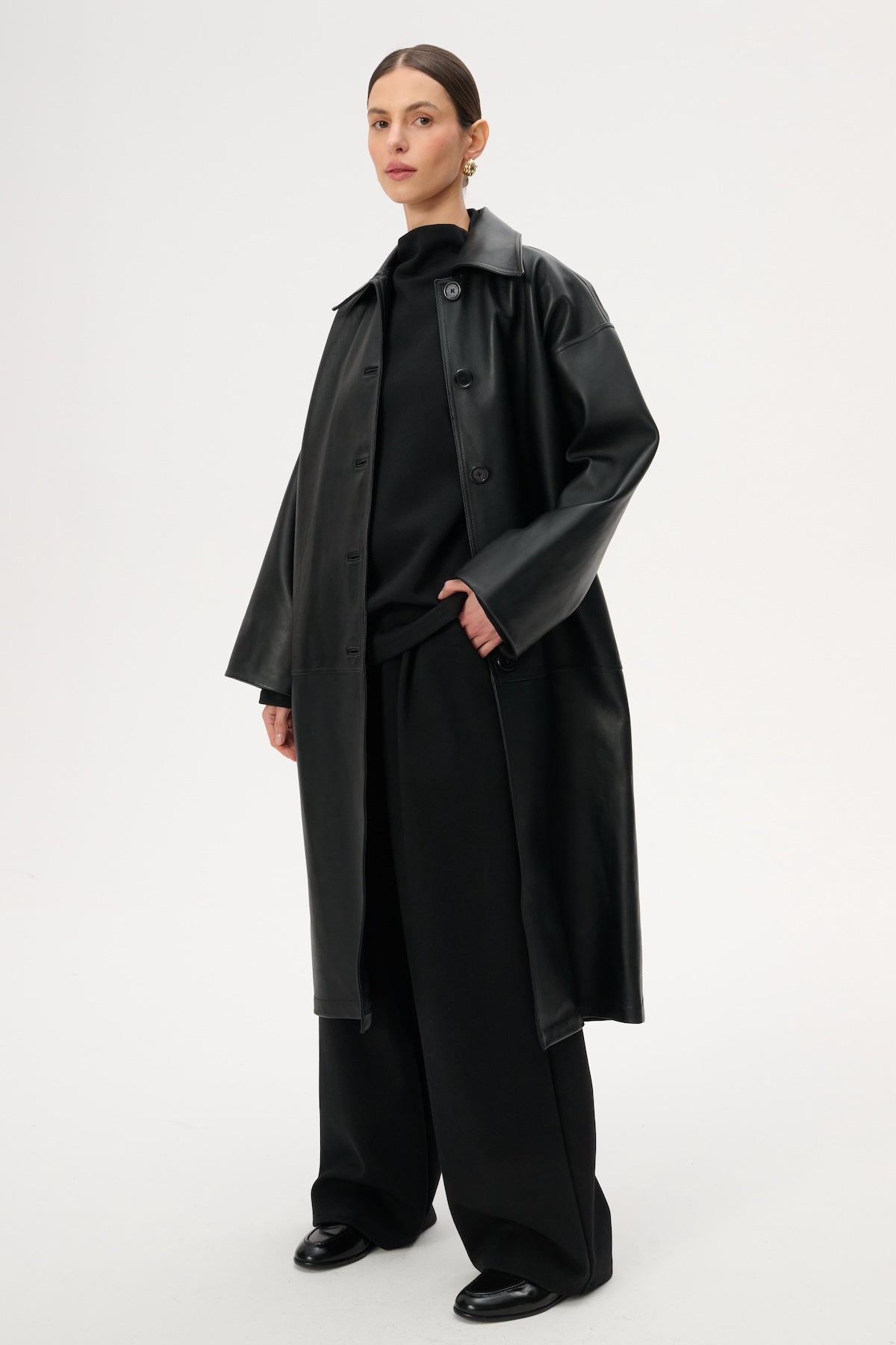Це об'ємне пальто до колін виготовлене зі 100% натуральної чорної шкіри. Воно має широкий комір, однобортну застібку на ґудзики та приховані бічні кишені.