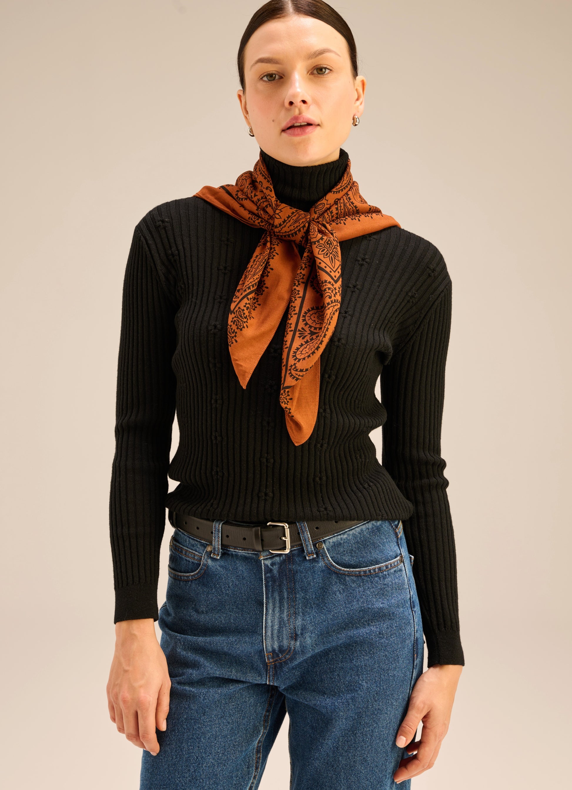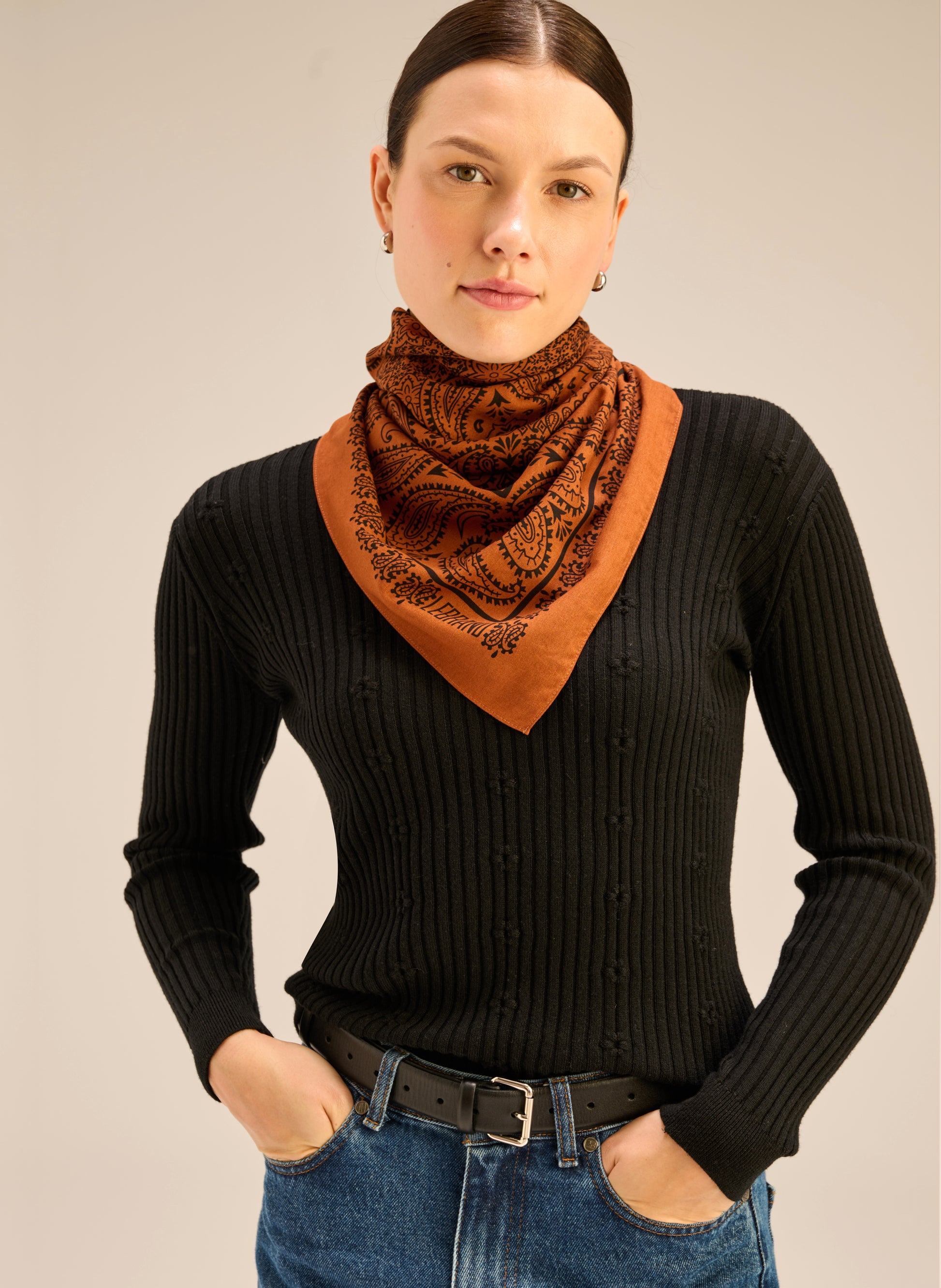 Uniwersalna chusta typu bandana, ręcznie wykończona, wykonana z miękkiej wiskozy w kolorze konaikowym. Ta wersja kolorystyczna powstała w limitowanej ilości.