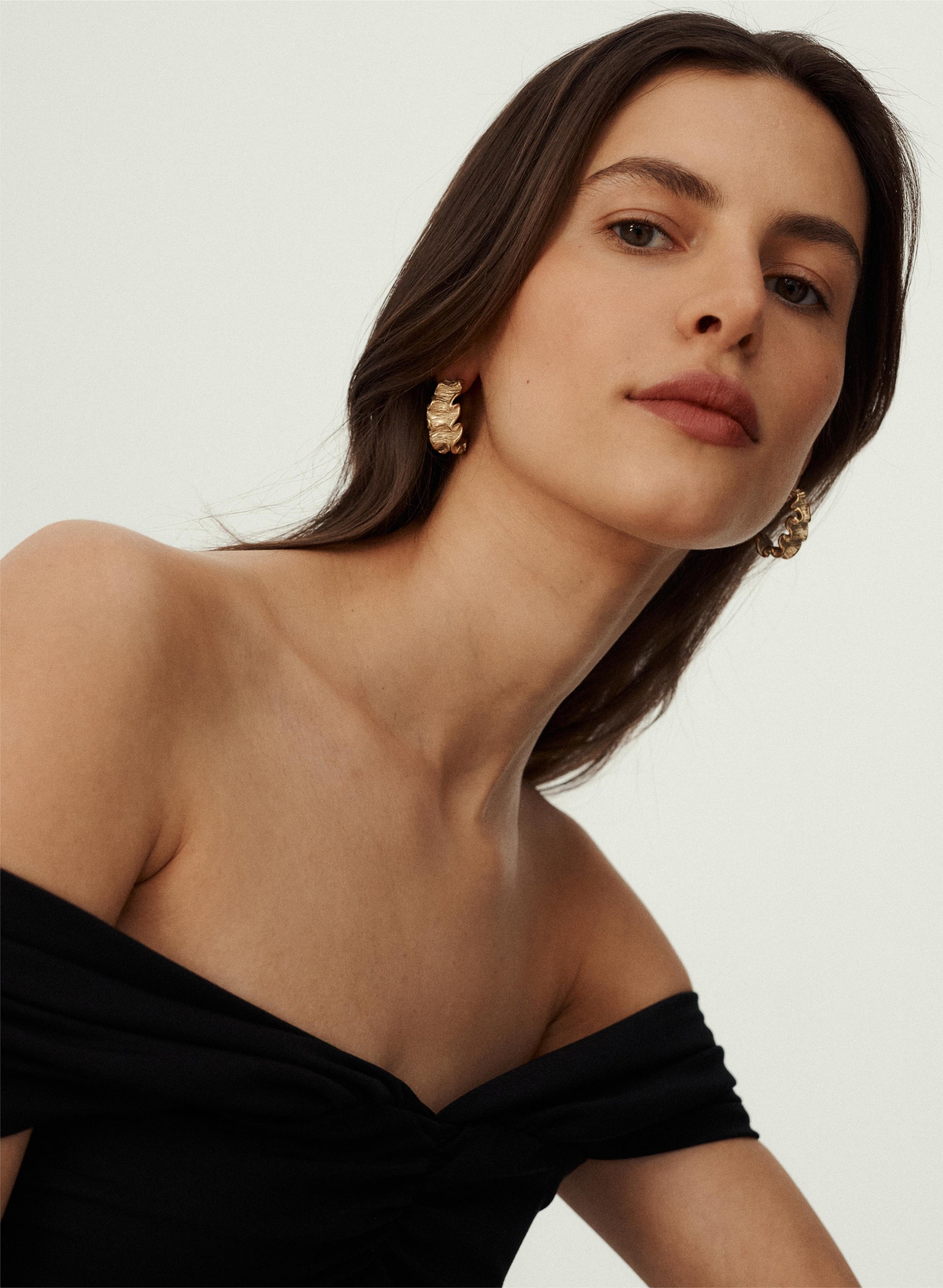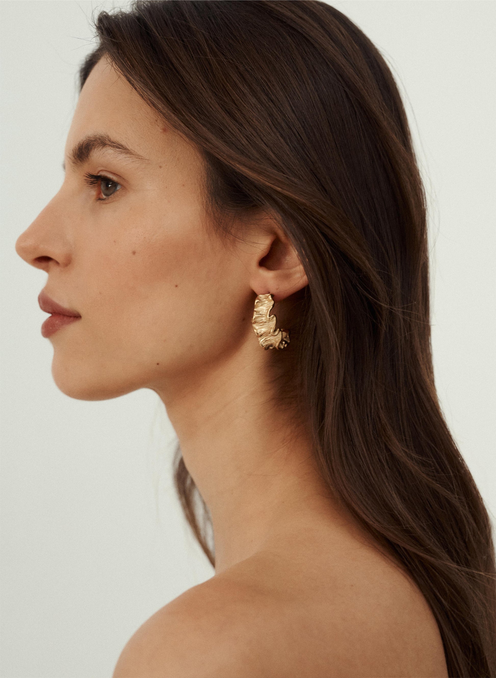 Великі сережки витягнутої неправильної форми. Виготовлений з хірургічної сталі золотого кольору. З міркувань гігієни товар не підлягає поверненню.