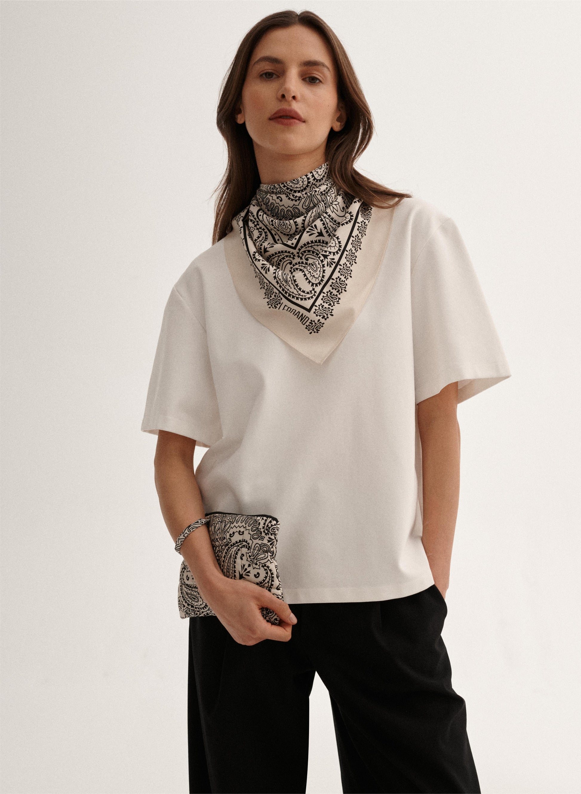 Міні-косметичка з ніжної віскози кольору екрю. Застібається на блискавку, всередині є невелика кишенька.