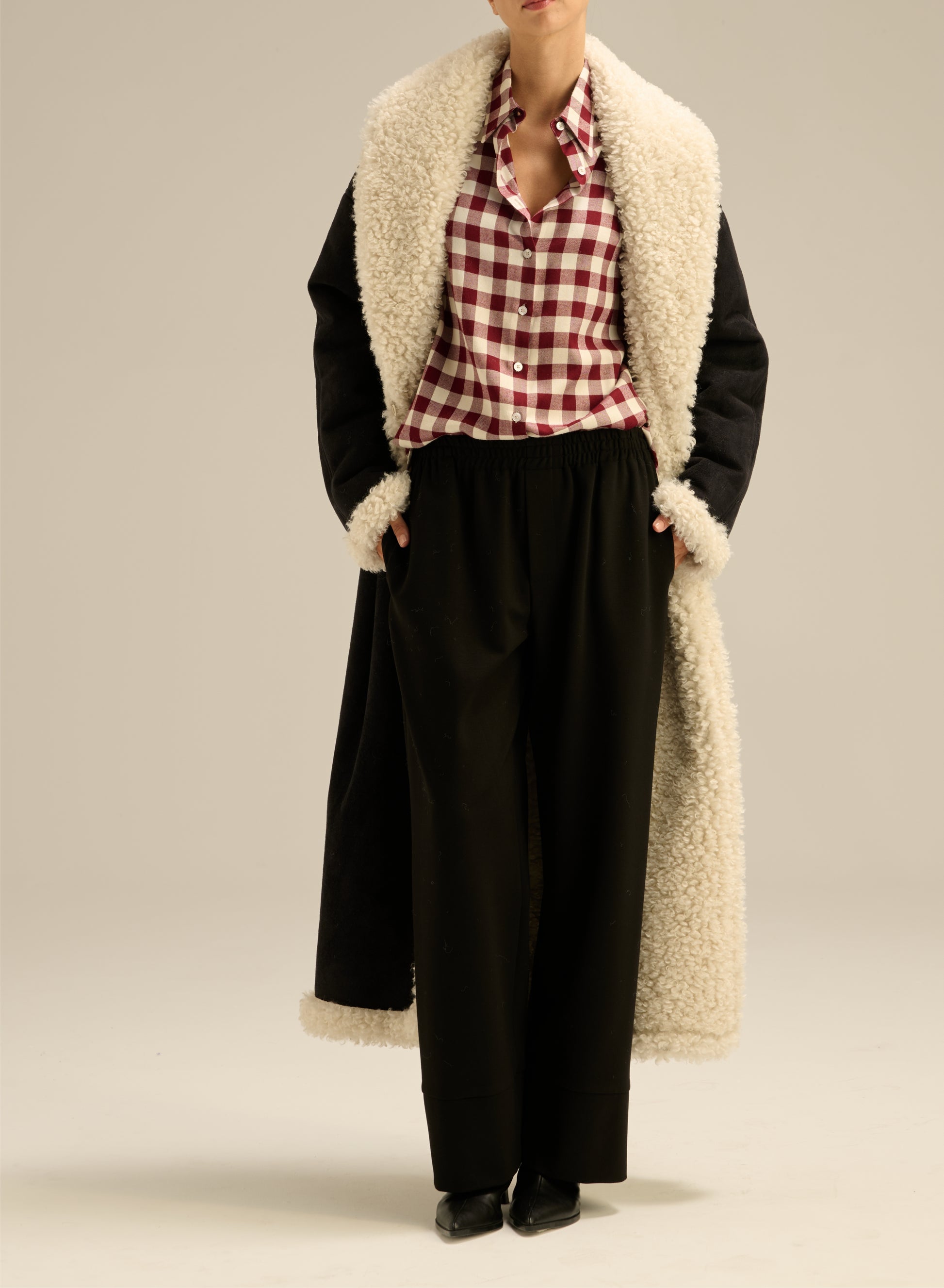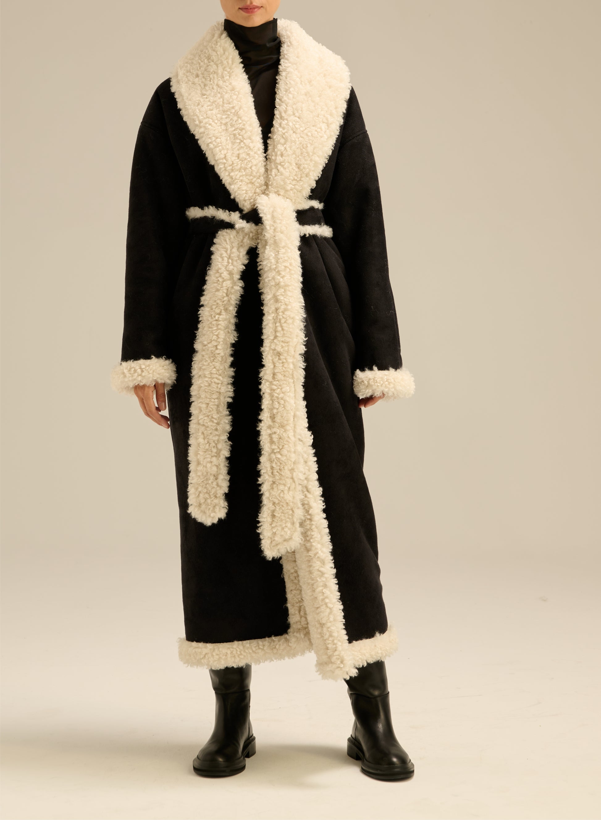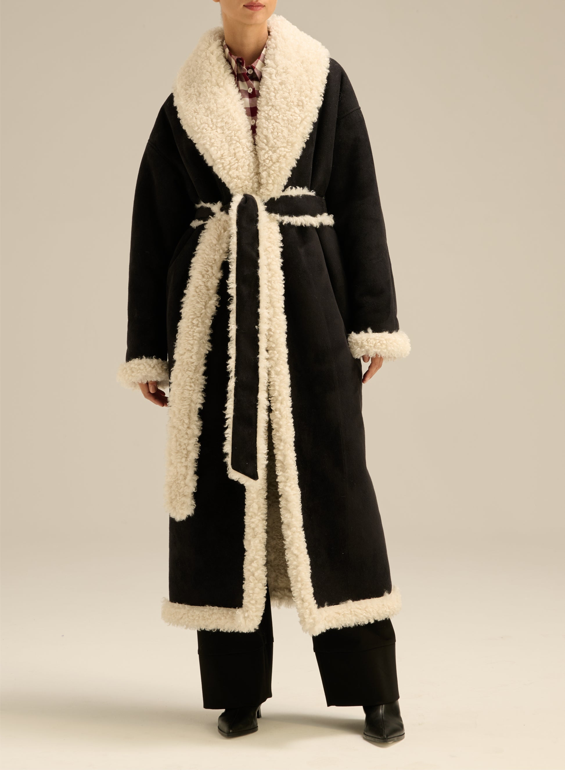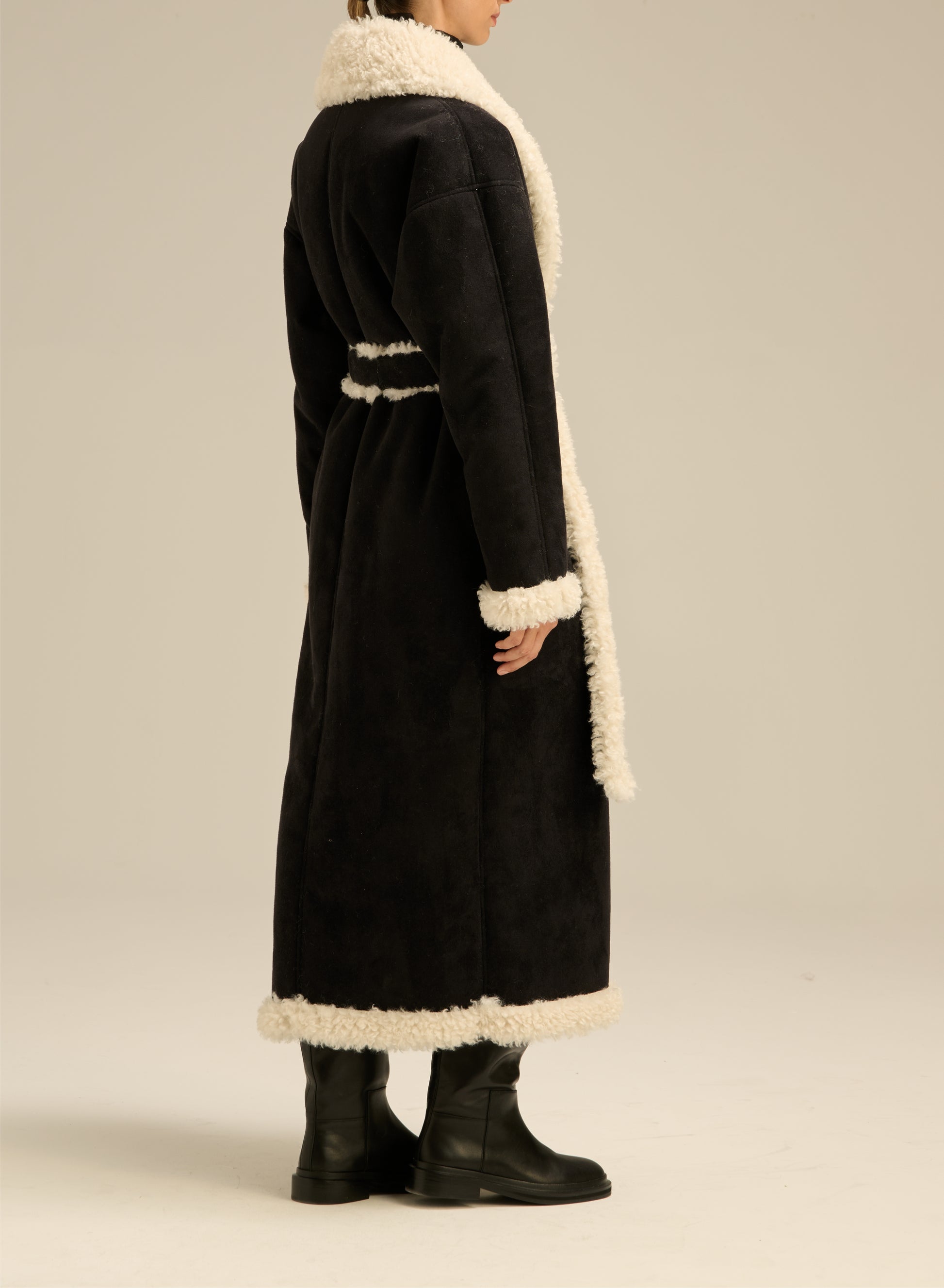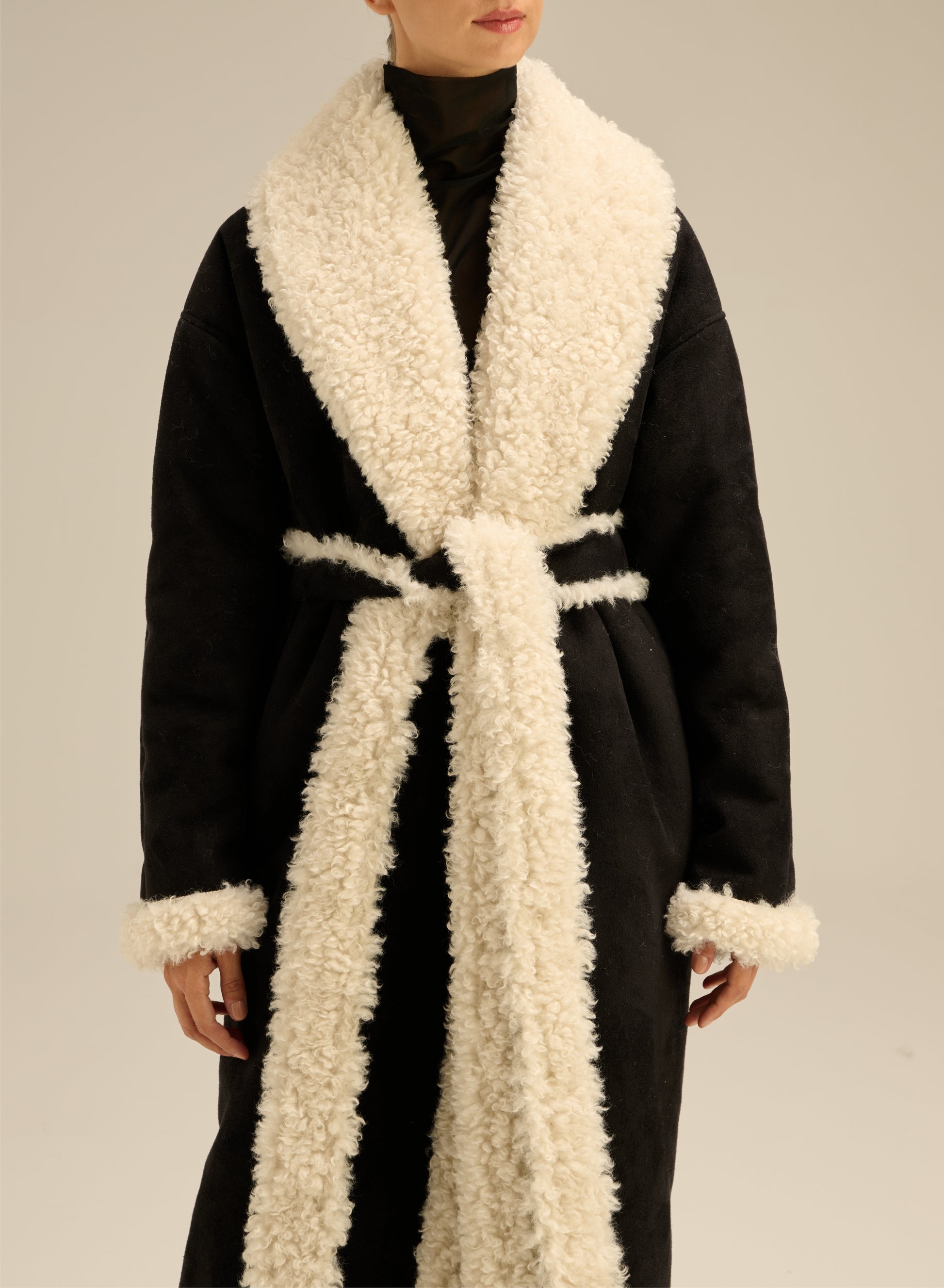 Довга шуба з екологічної овчини. Має ремінець і довгі клапани. Можна носити на обидві сторони.