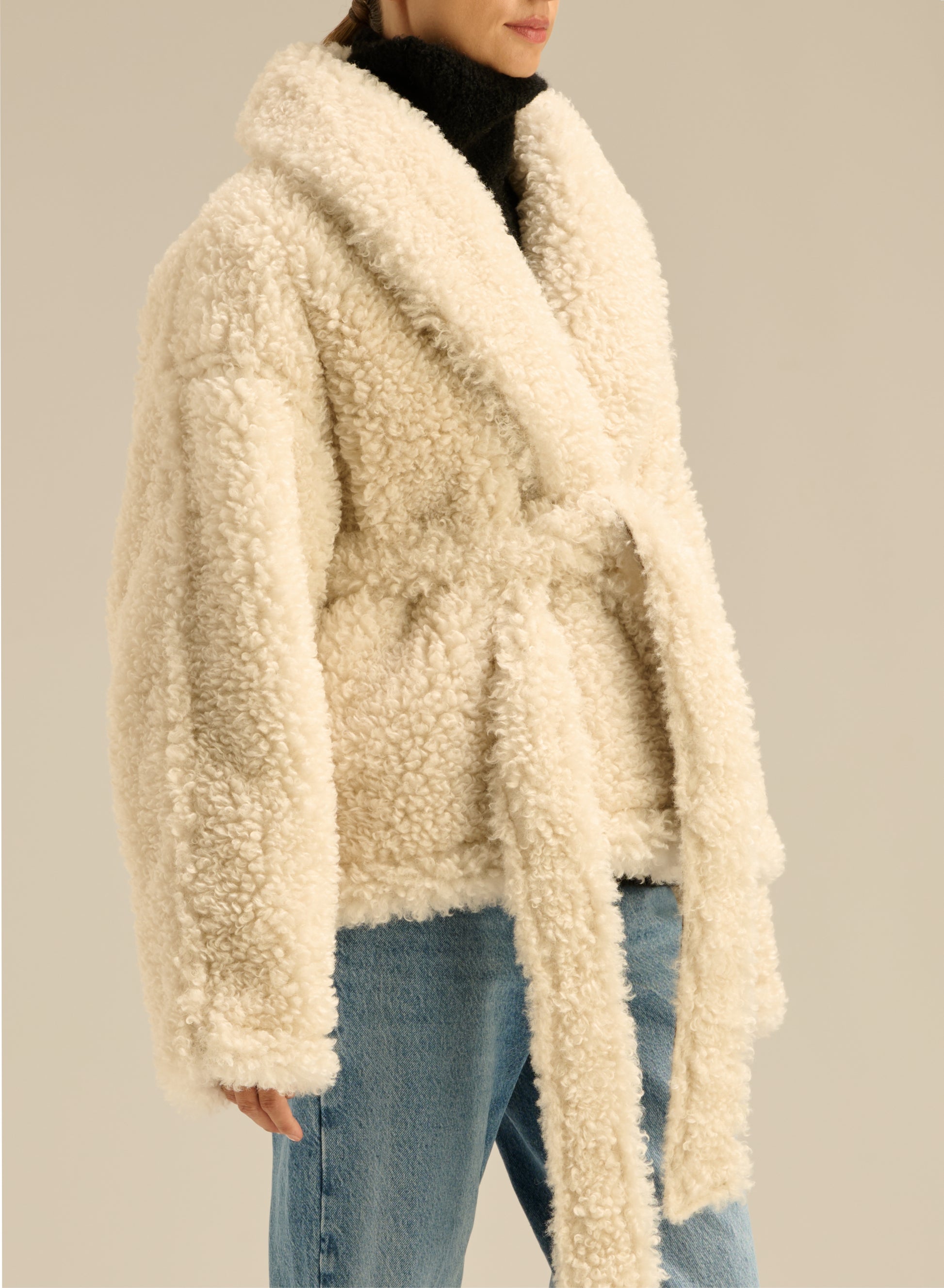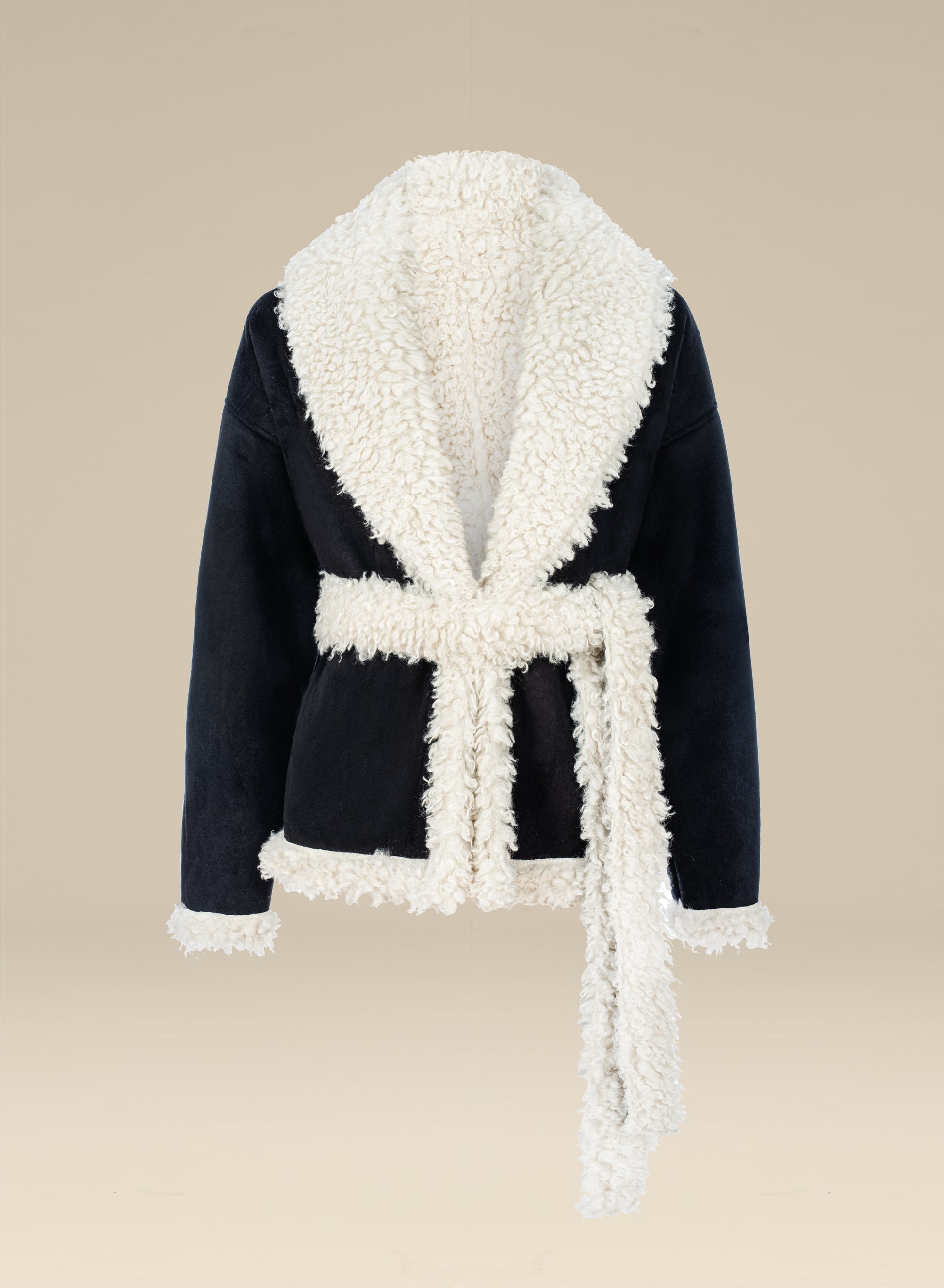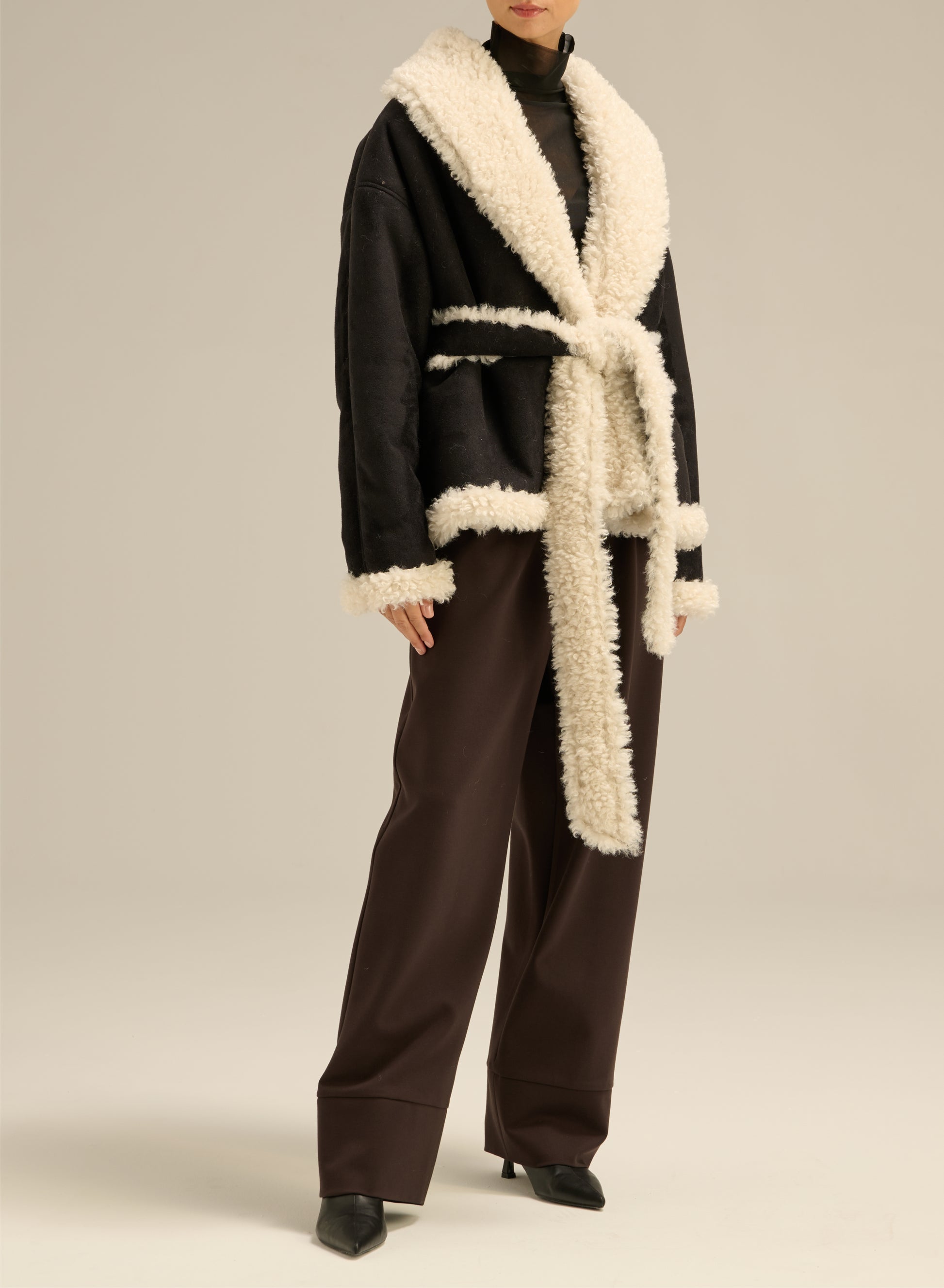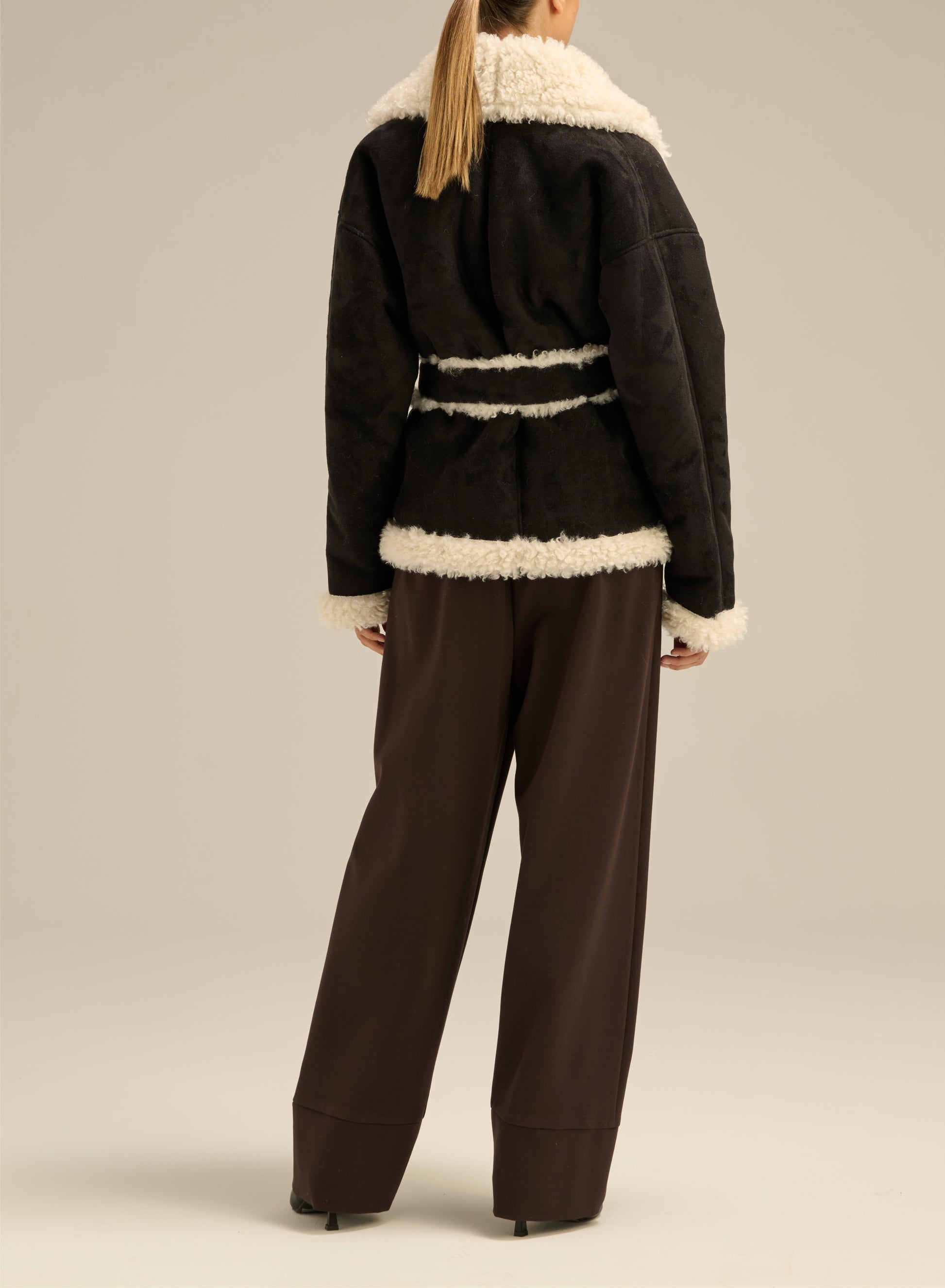 Куртка квадратного покрою довжини міді з екологічної овчини. Має ремінець і довгі клапани. Можна носити на обидві сторони.