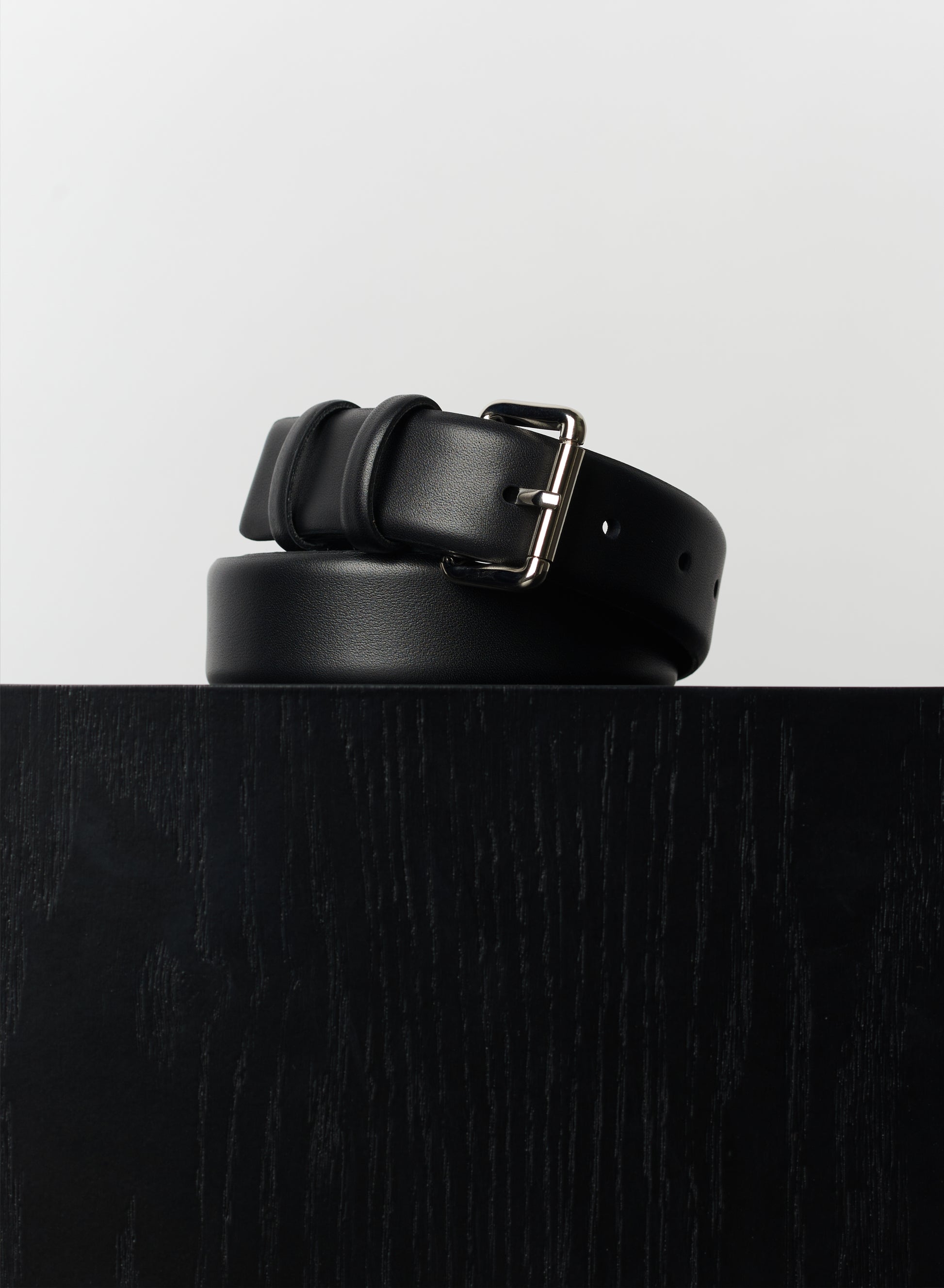 Класичний ремінь з натуральної гладкої шкіри насиченого чорного відтінку. Має квадратну пряжку сріблястого кольору.