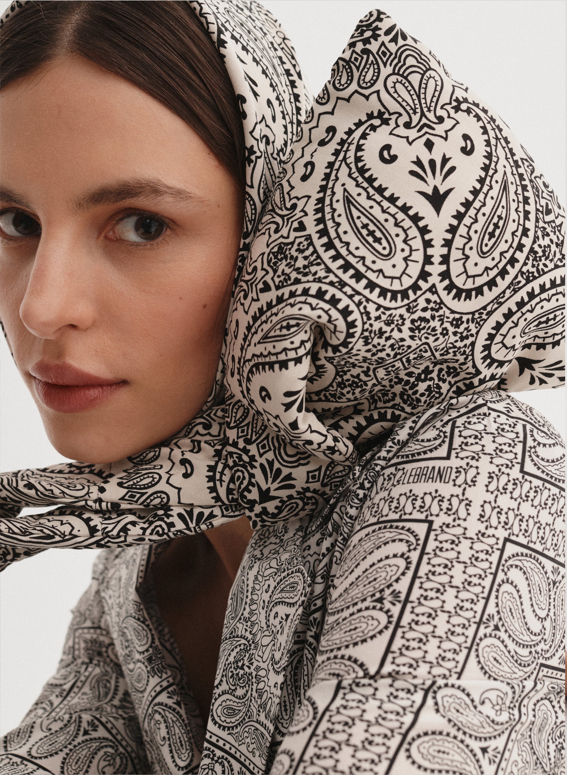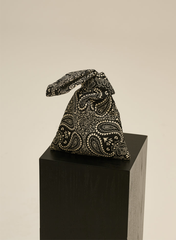 Легка міні-сумка з вирізом-мішечком, виготовлена з віскози з візерунком-банданою кольору екрю. Має поворотні вушка.
