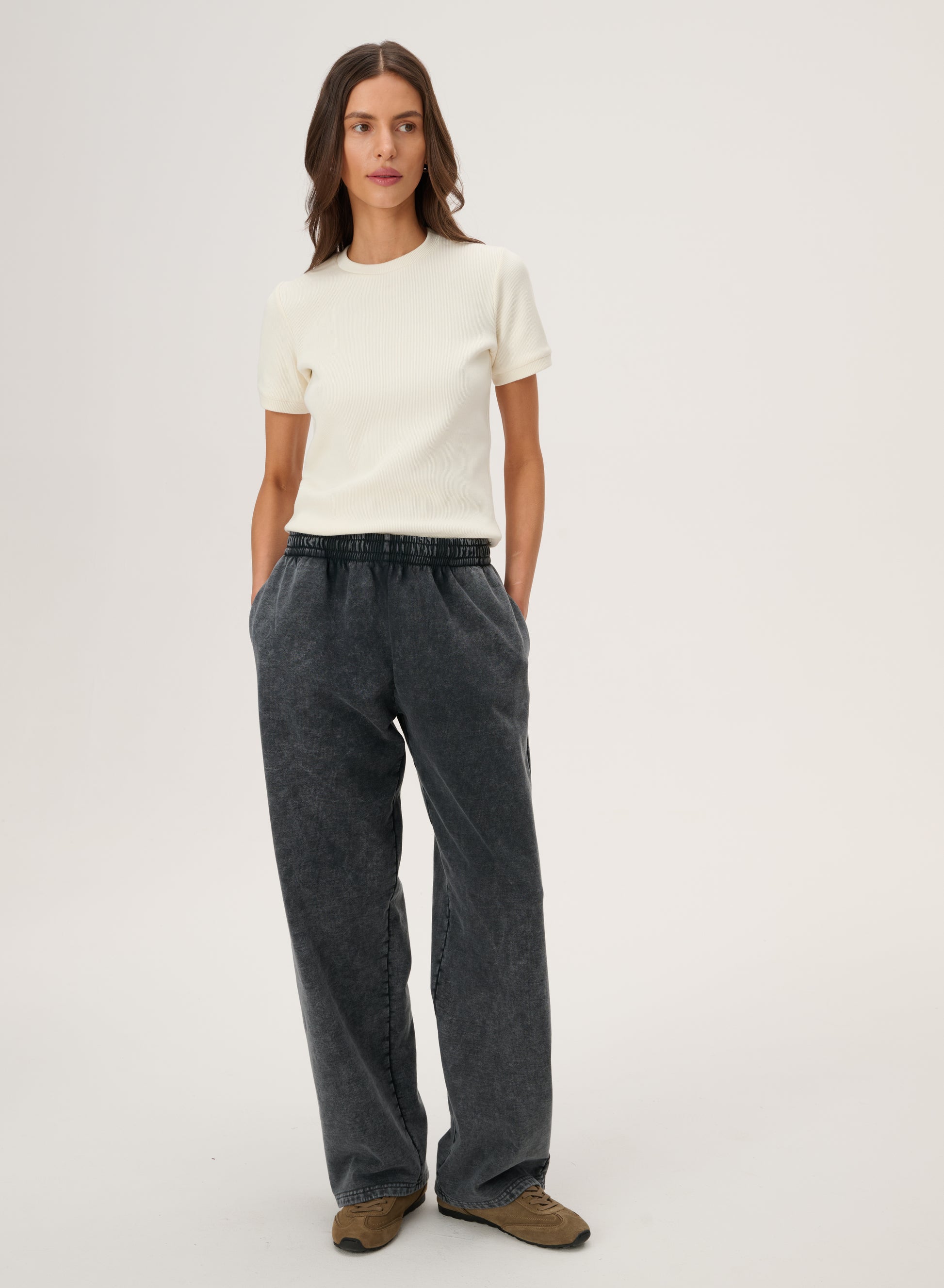 Spodnie o długich, szerokich nogawkach, wykonane z miękkiej dzianiny w kolorze czarnym. Posiadają regularny stan, delikatne zaszewki, elastyczną talię.