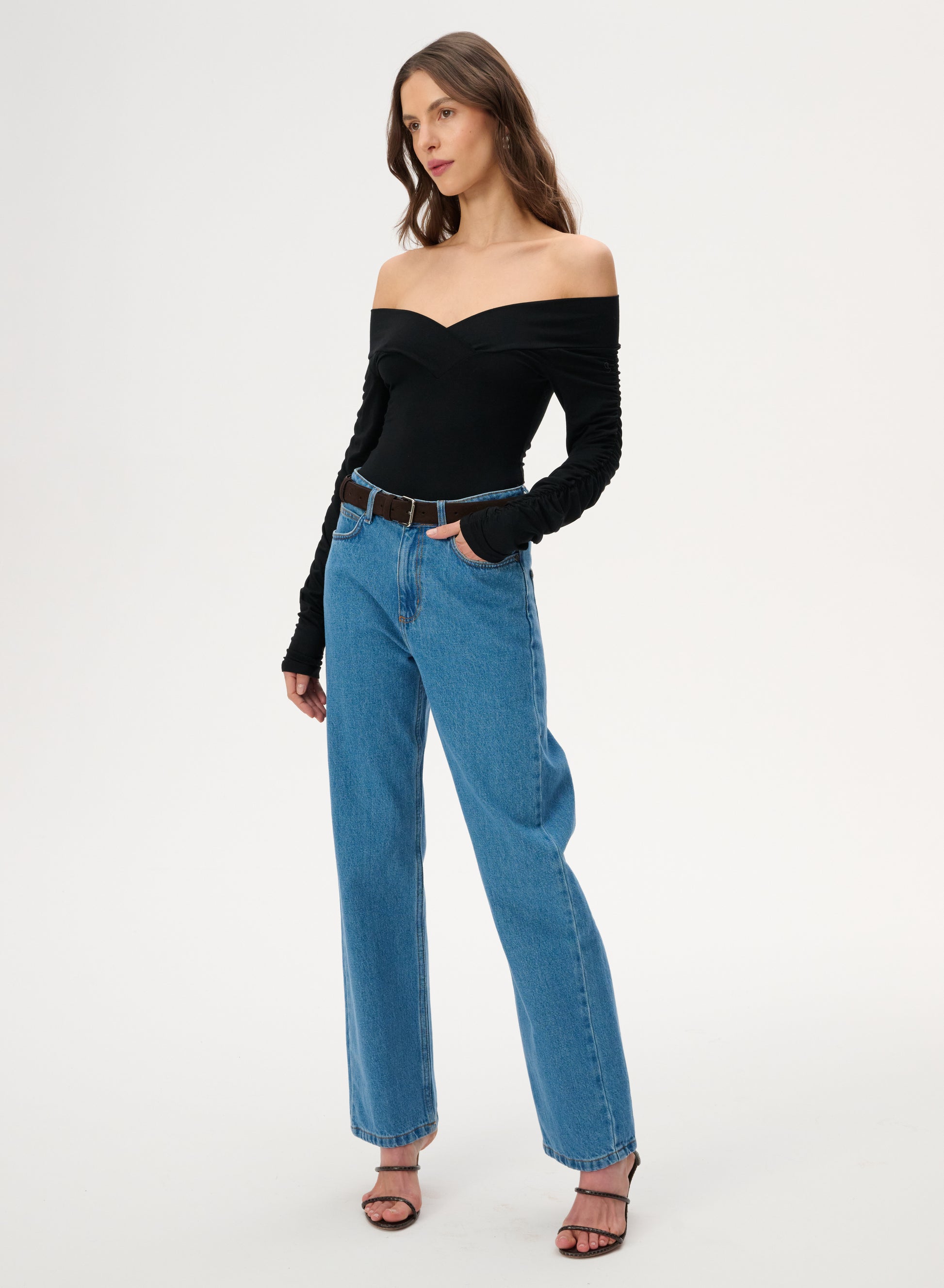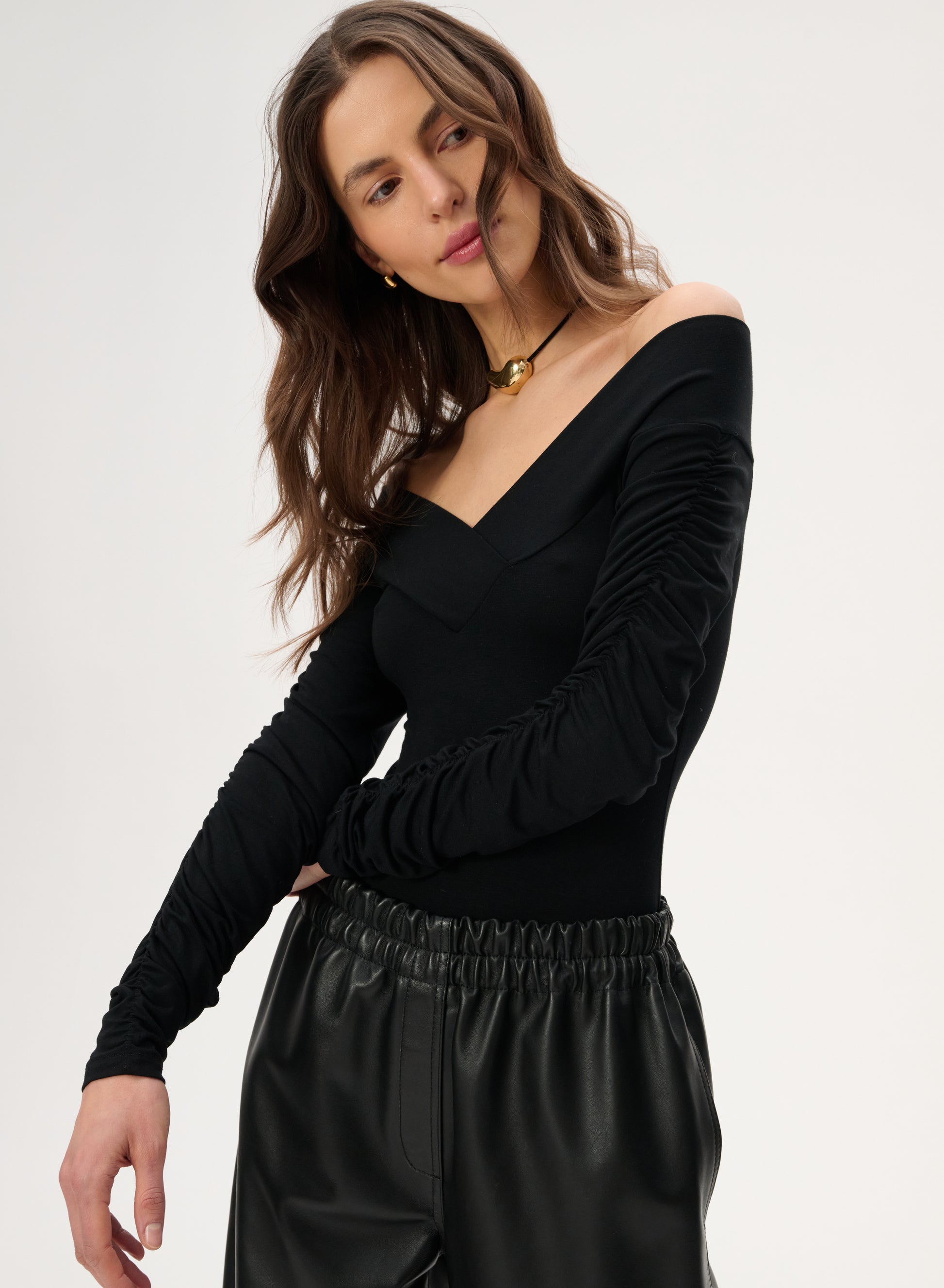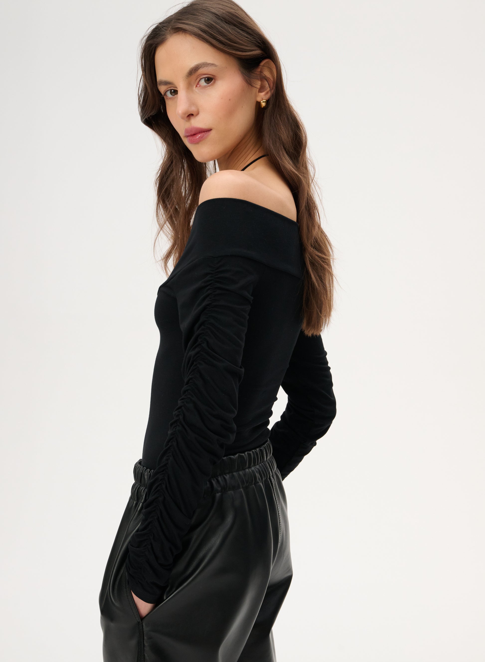Body z dekoltem off-shoulder, dugi rękawy z marszczeniami. Body wykonane z miłej wiskozy bambusowej w kolorze czarnym.