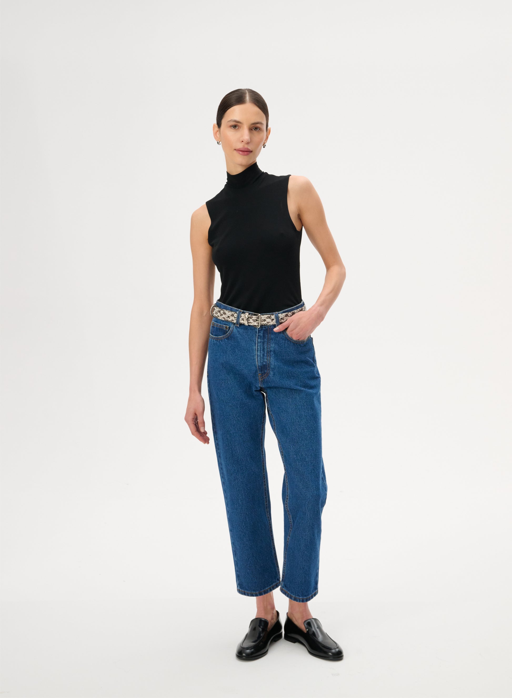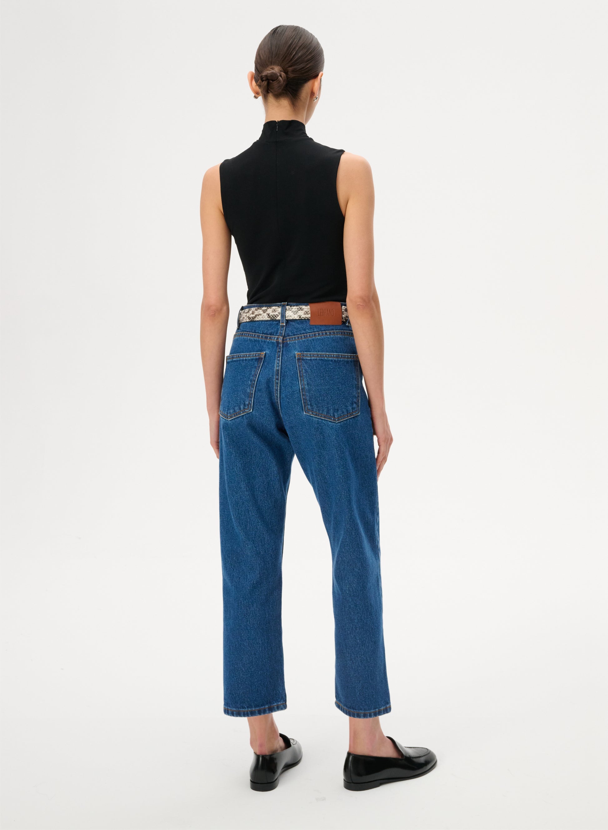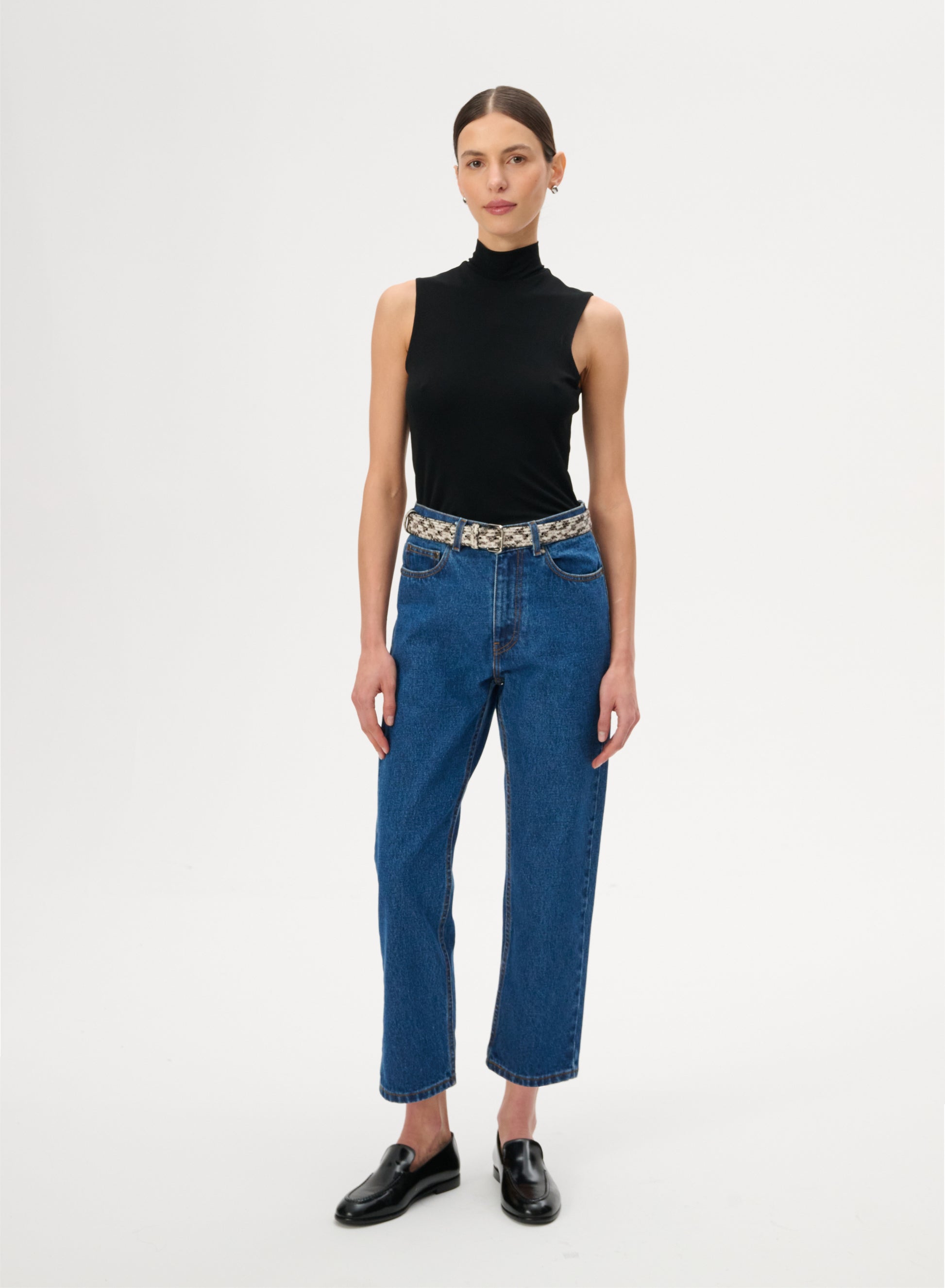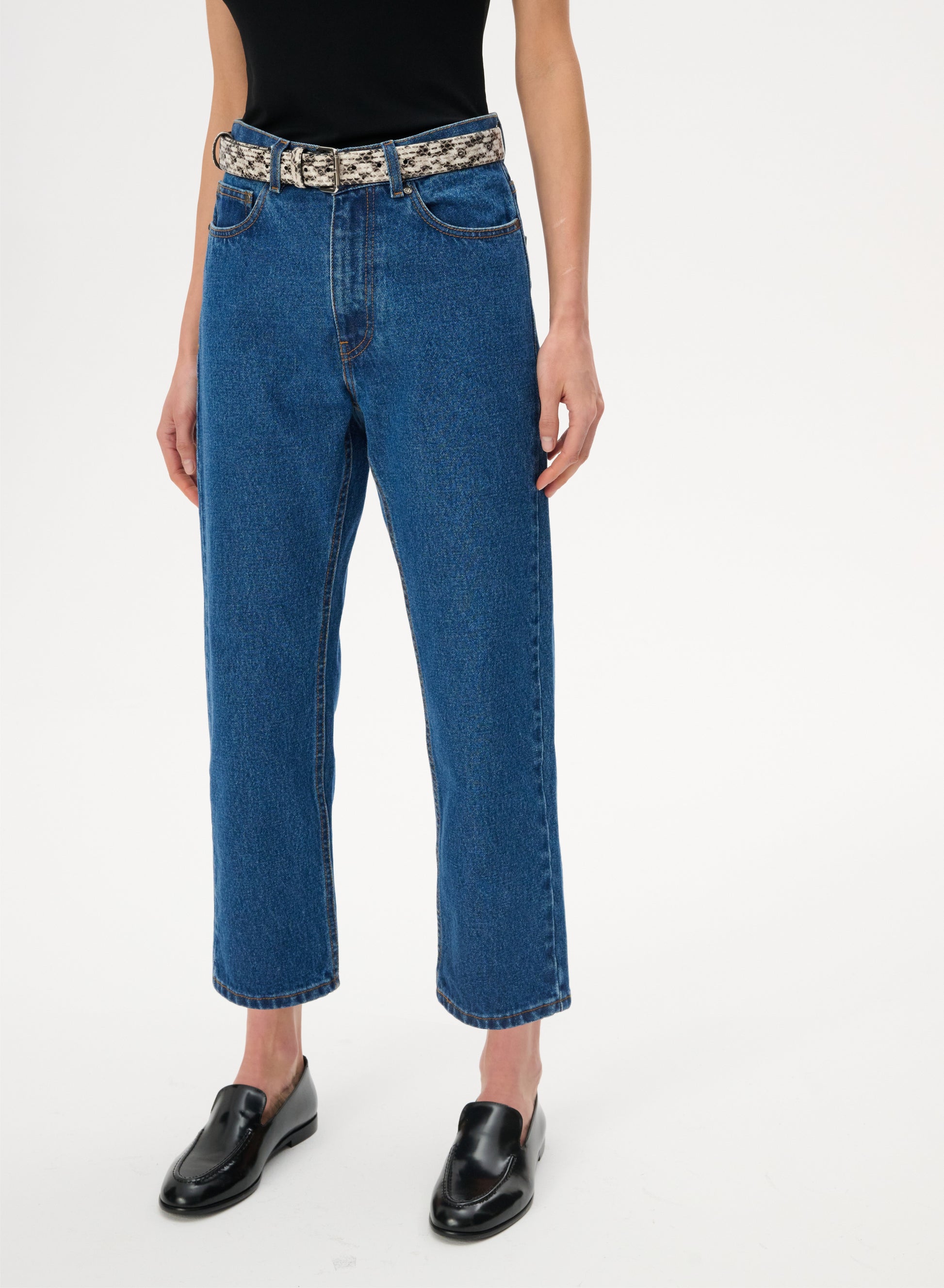 Джинси класичного крою із завищеною талією та звуженими штанинами, що сягають трохи вище щиколотки. Виготовлений з 100% нееластичної бавовни синього кольору. Вони мають застібку на гудзик і блискавку, шкіряну нашивку з тисненим логотипом на тильній стороні та п’ять накладних кишень.