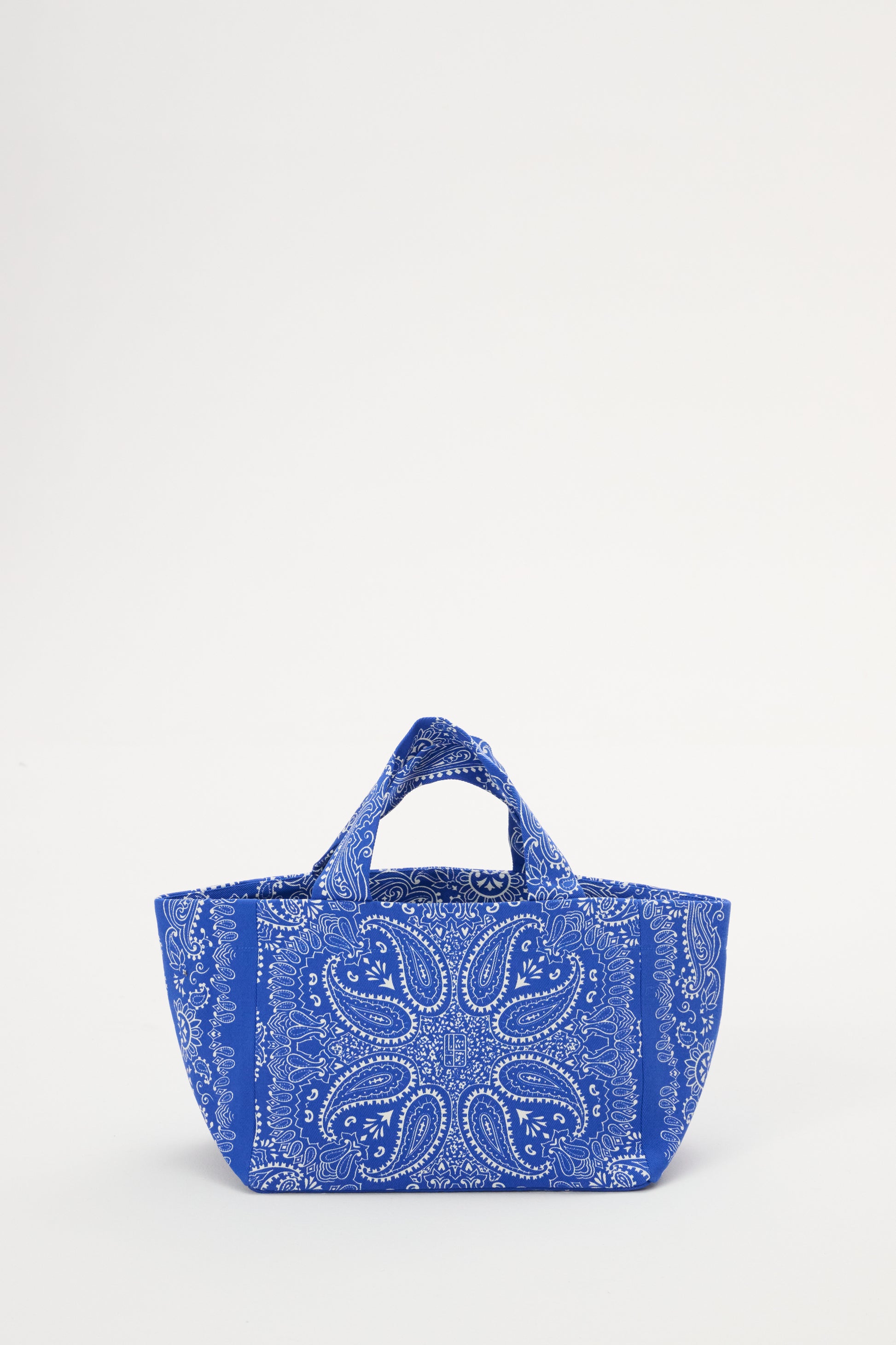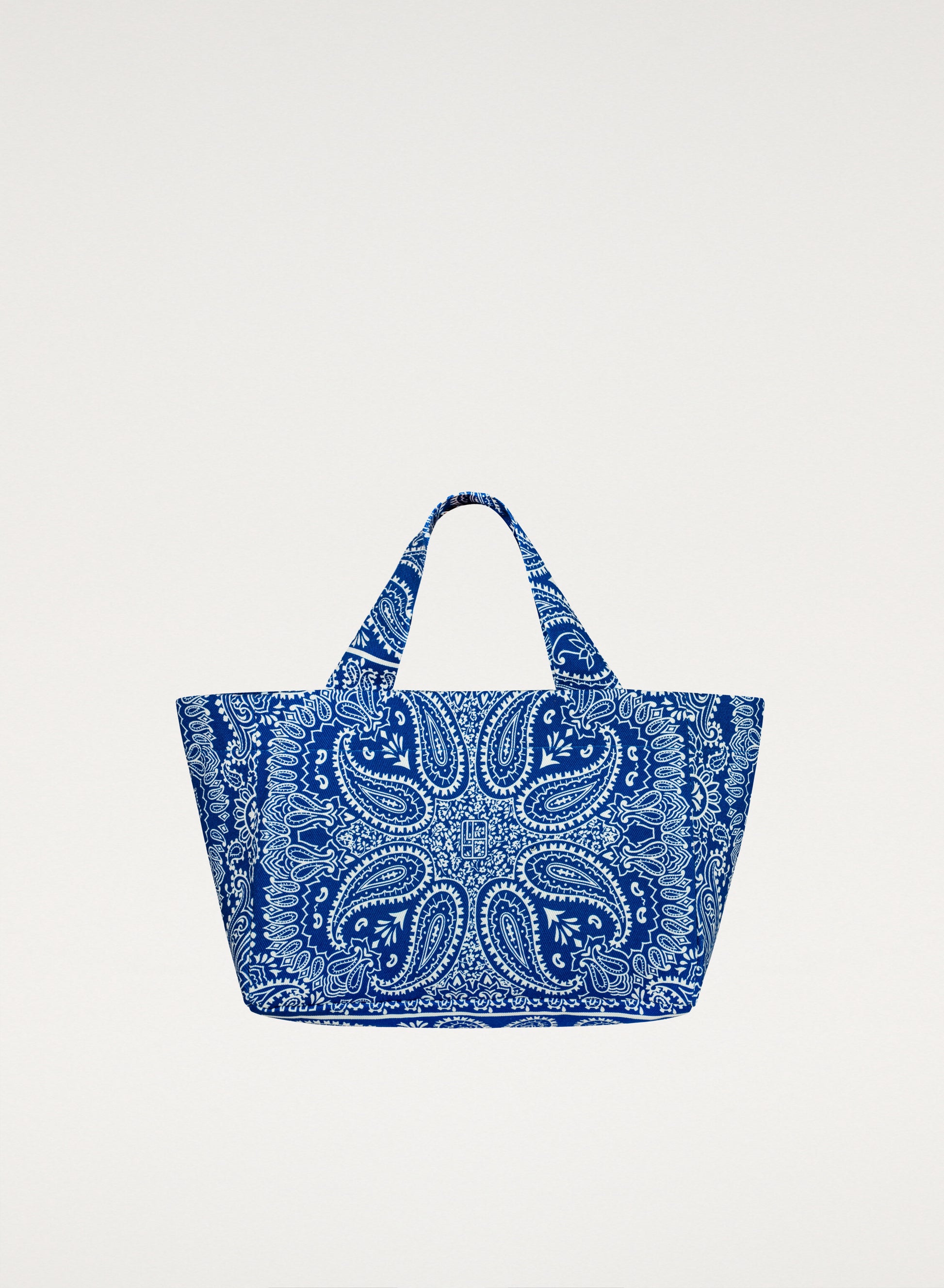 Ця невелика міні-сумка-шопер виготовлена з щільного бавовняного полотна з принтом бандани волошково-бежевого кольору. Вона не має застібки та має одну внутрішню кишеню.