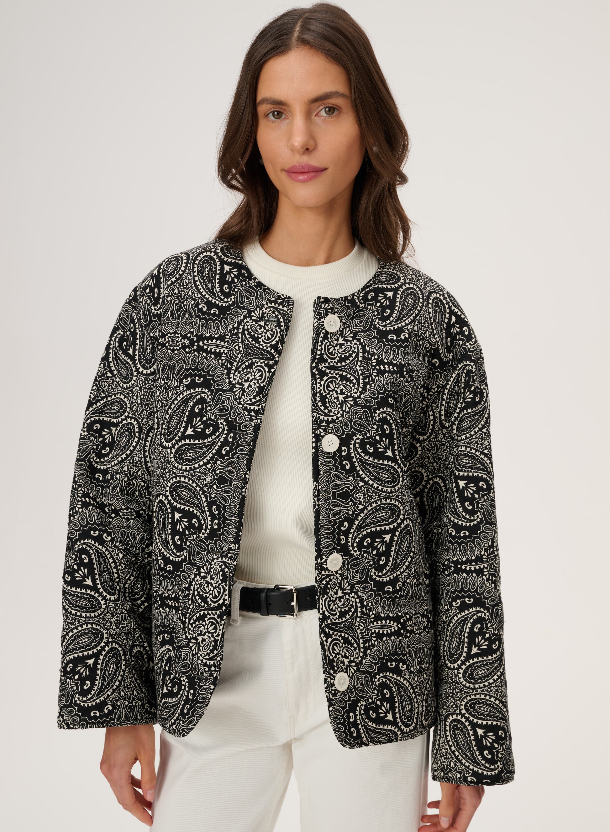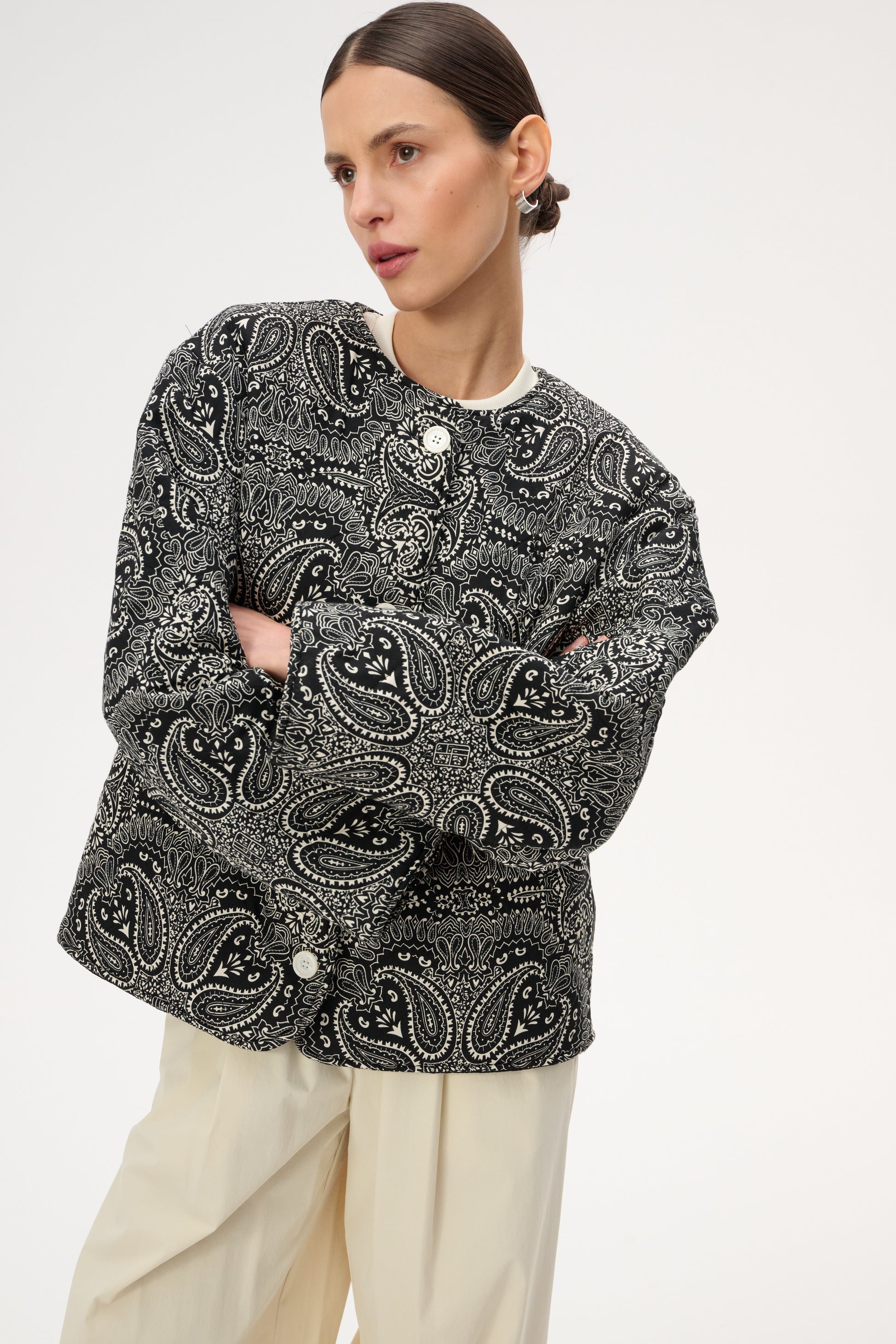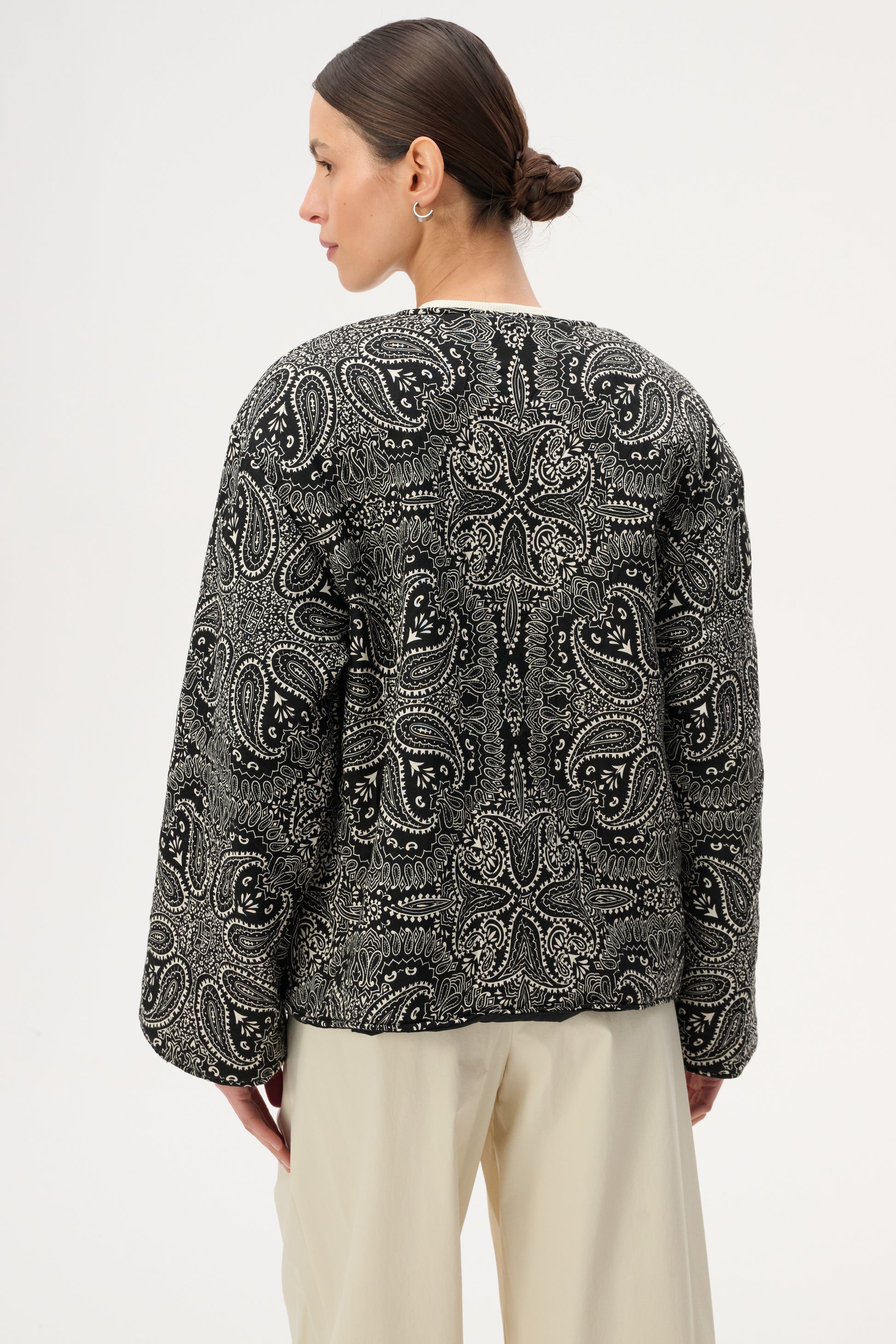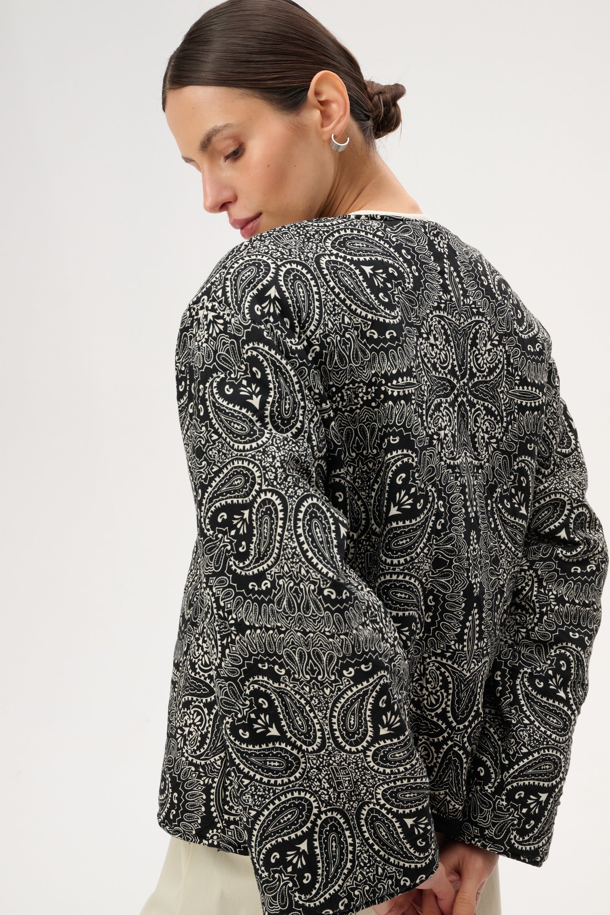 Коротка пухка куртка з щільної бавовни з набивним чорно-білим візерунком бандана. Має довгі рукави з манжетами, застібку на гудзик, передні кишені на блискавці з клапанами та бічні накладні кишені. У зв'язку з трудомісткістю процесу виготовлення, доступна під замовлення. Термін доставки приблизно 7 днів.