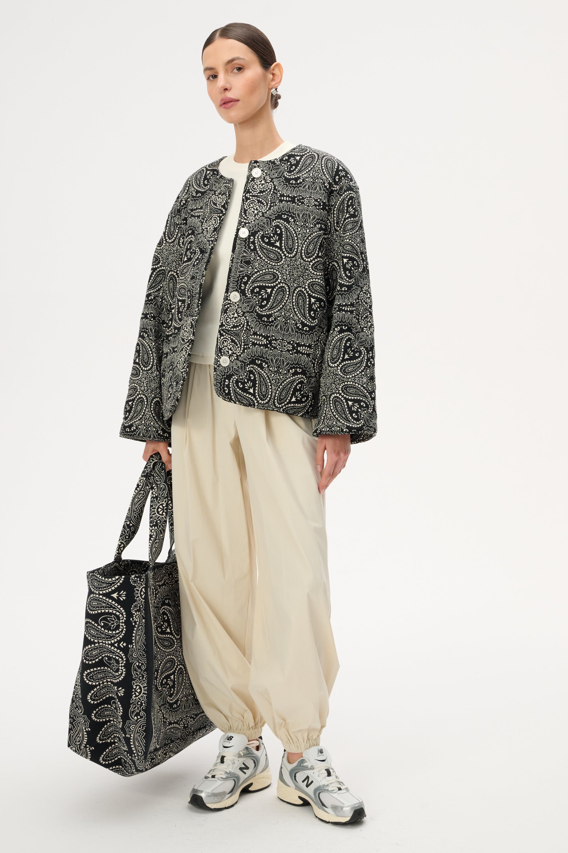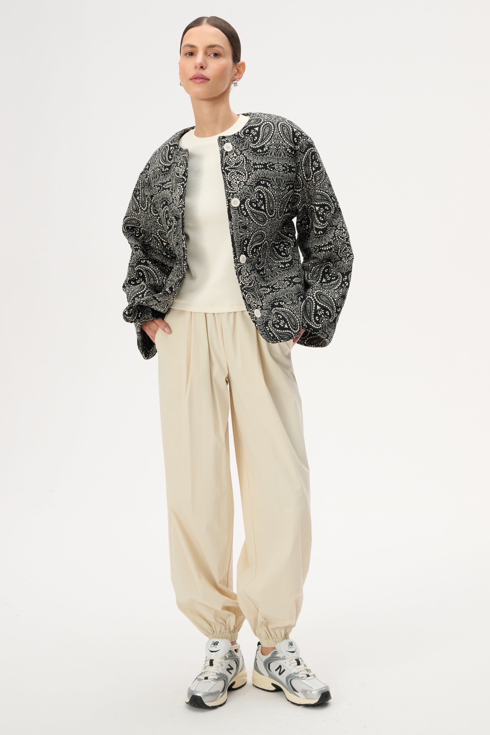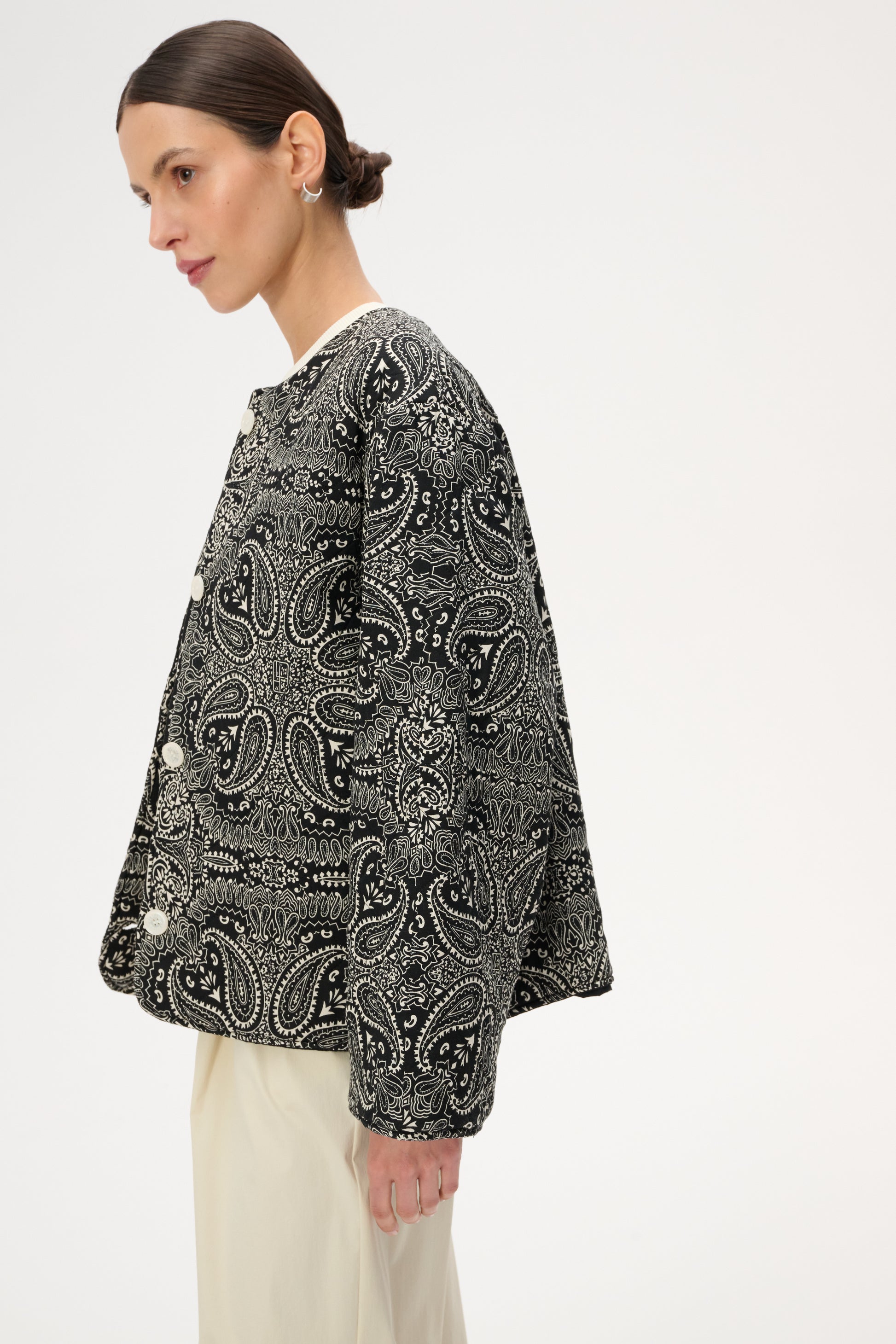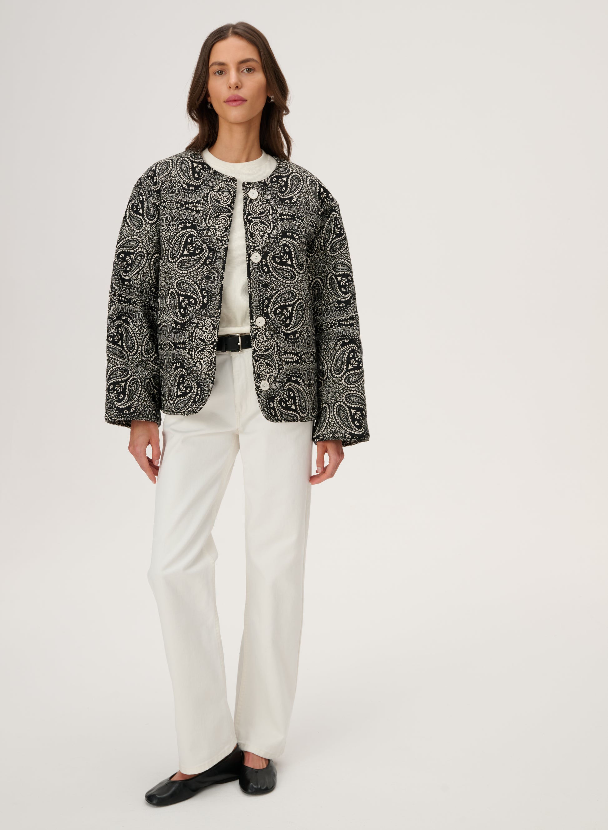 Коротка пухка куртка з щільної бавовни з набивним чорно-білим візерунком бандана. Має довгі рукави з манжетами, застібку на гудзик, передні кишені на блискавці з клапанами та бічні накладні кишені. У зв'язку з трудомісткістю процесу виготовлення, доступна під замовлення. Термін доставки приблизно 7 днів.