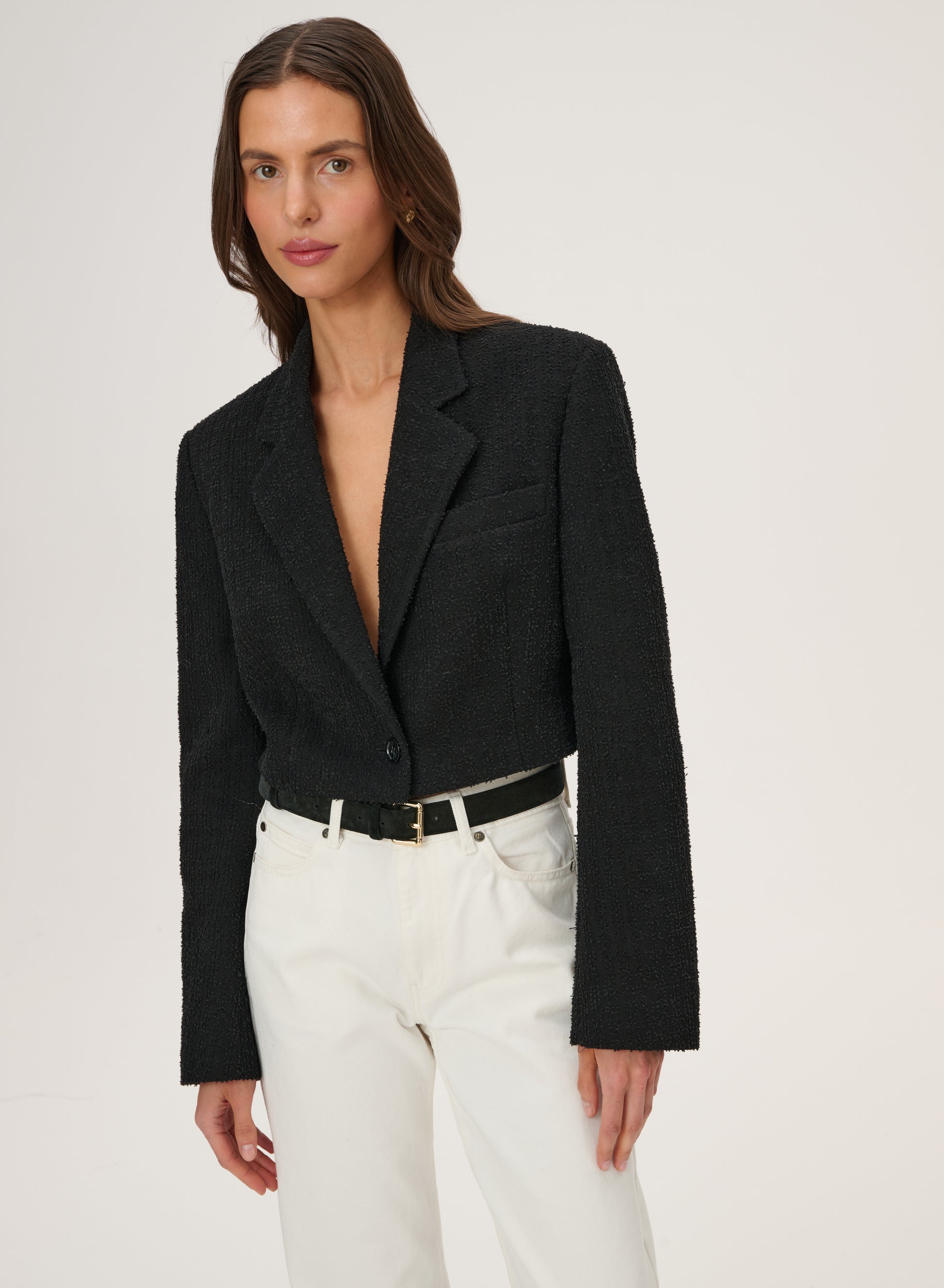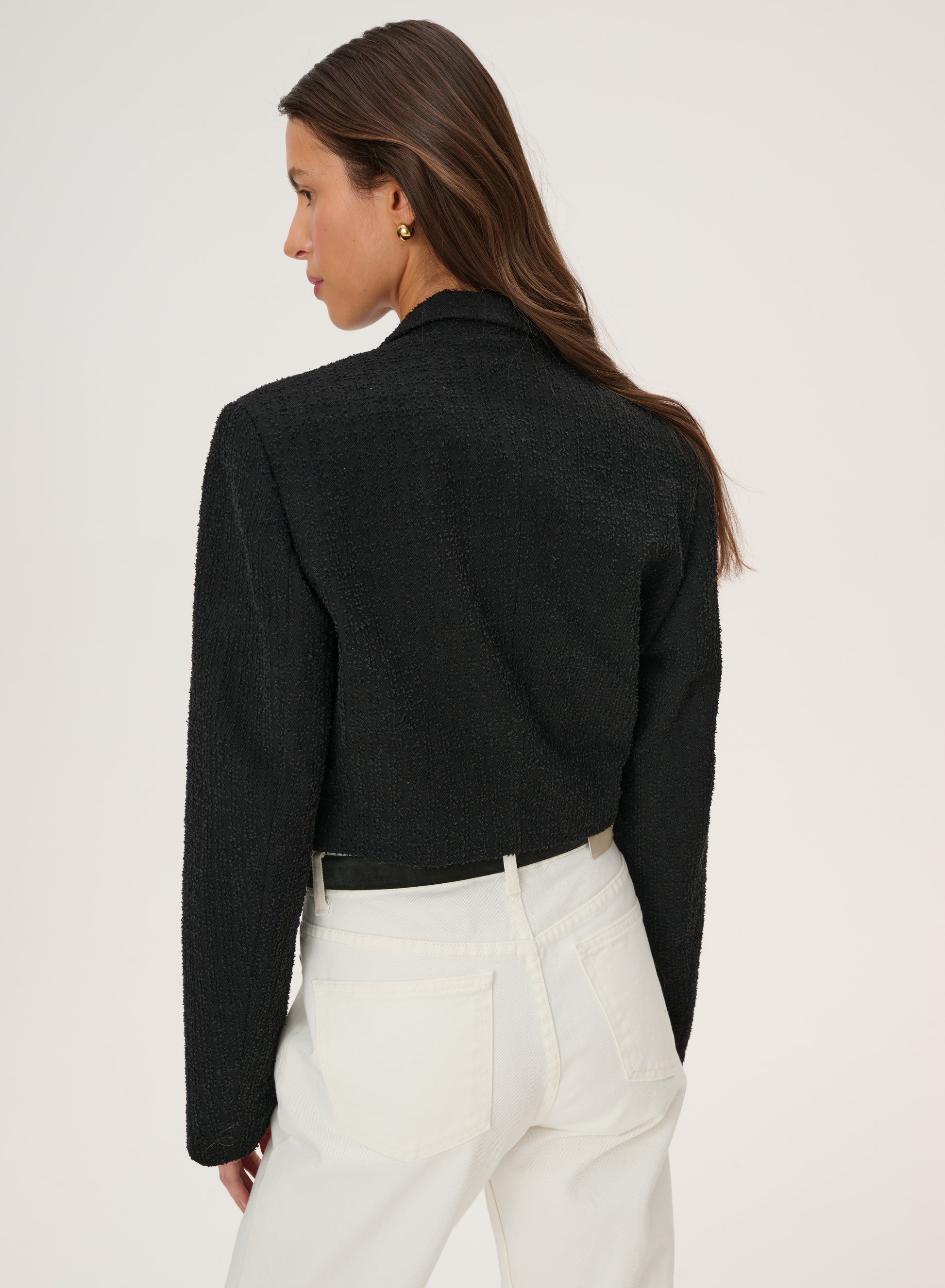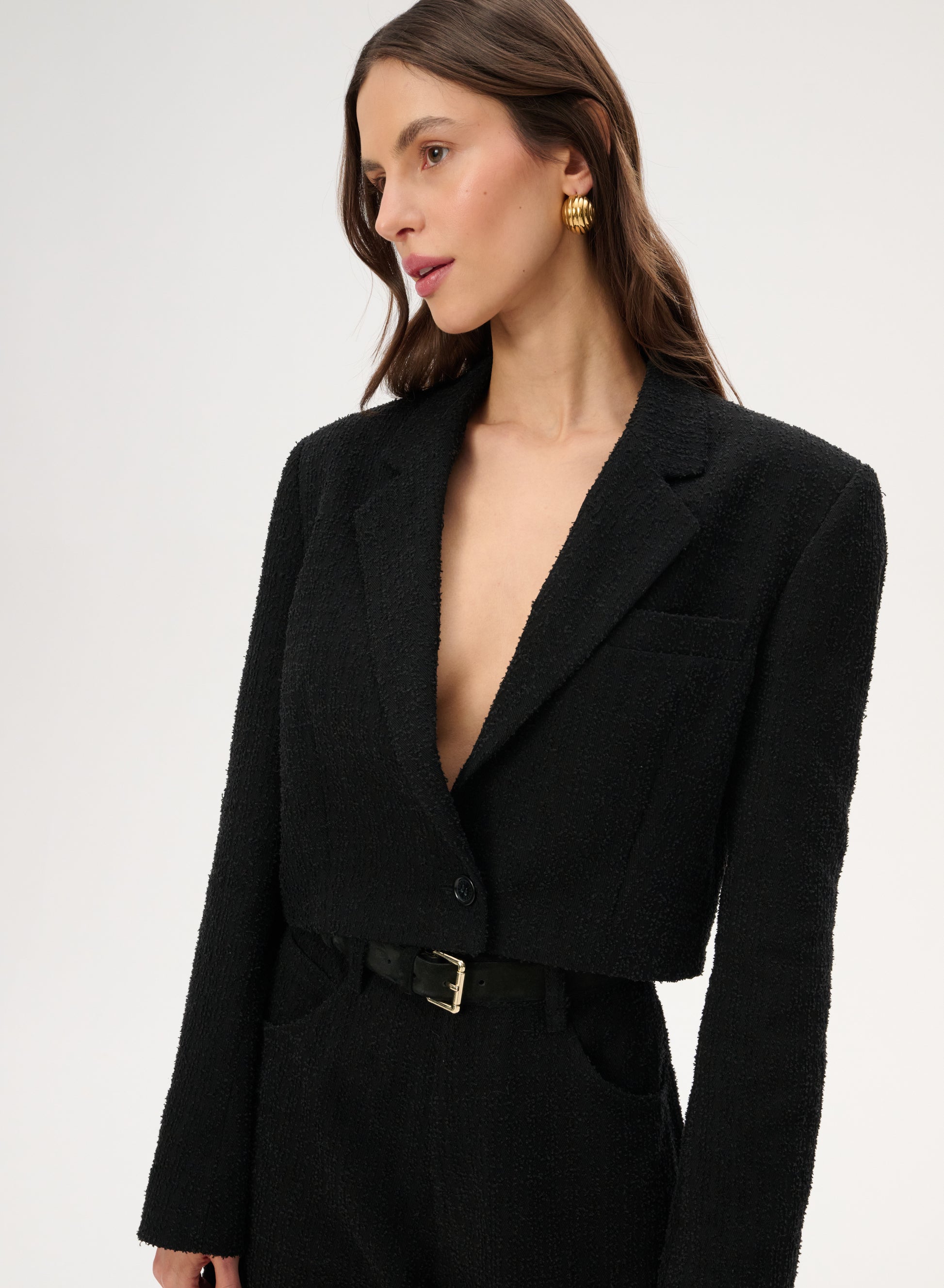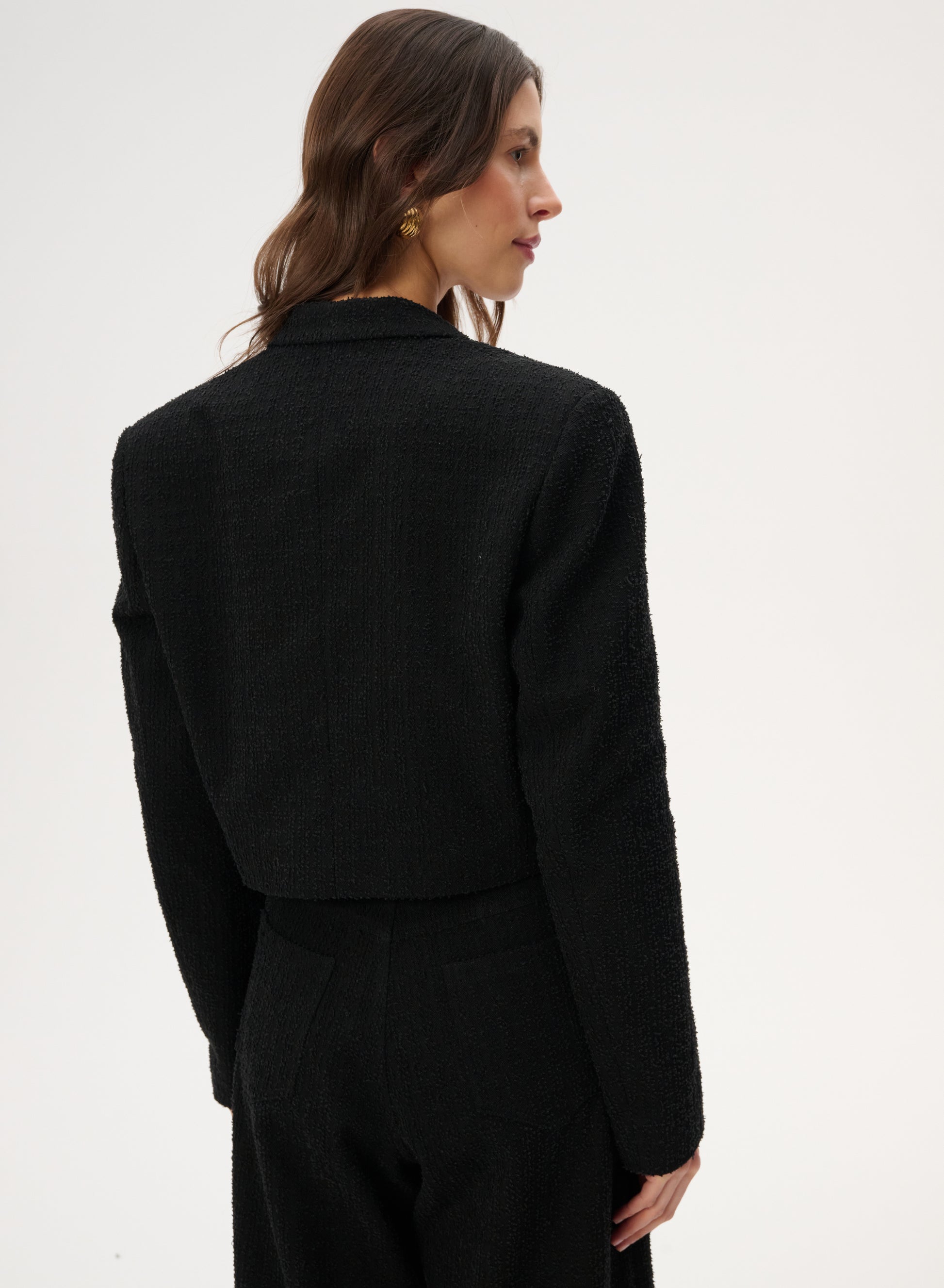 Krótka marynarka sięgająca talii wykonana z bawełny w kolorze czarnym. Posiada klasyczny kołnierz i zapięcie na pojedynczy guzik.