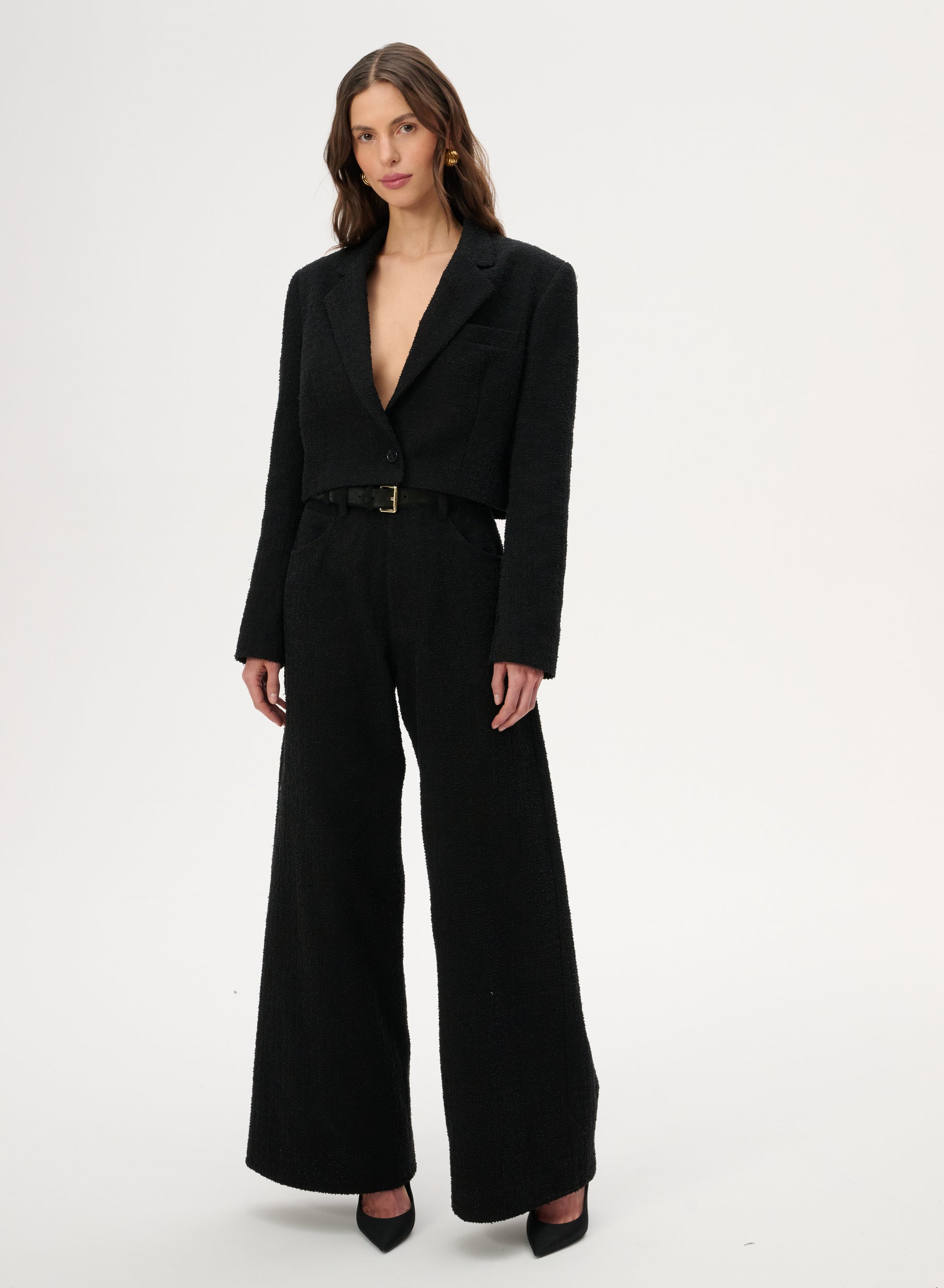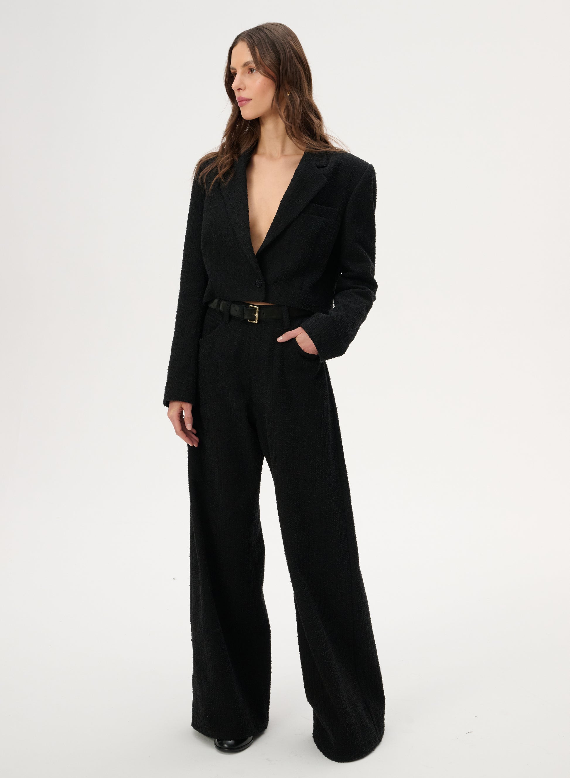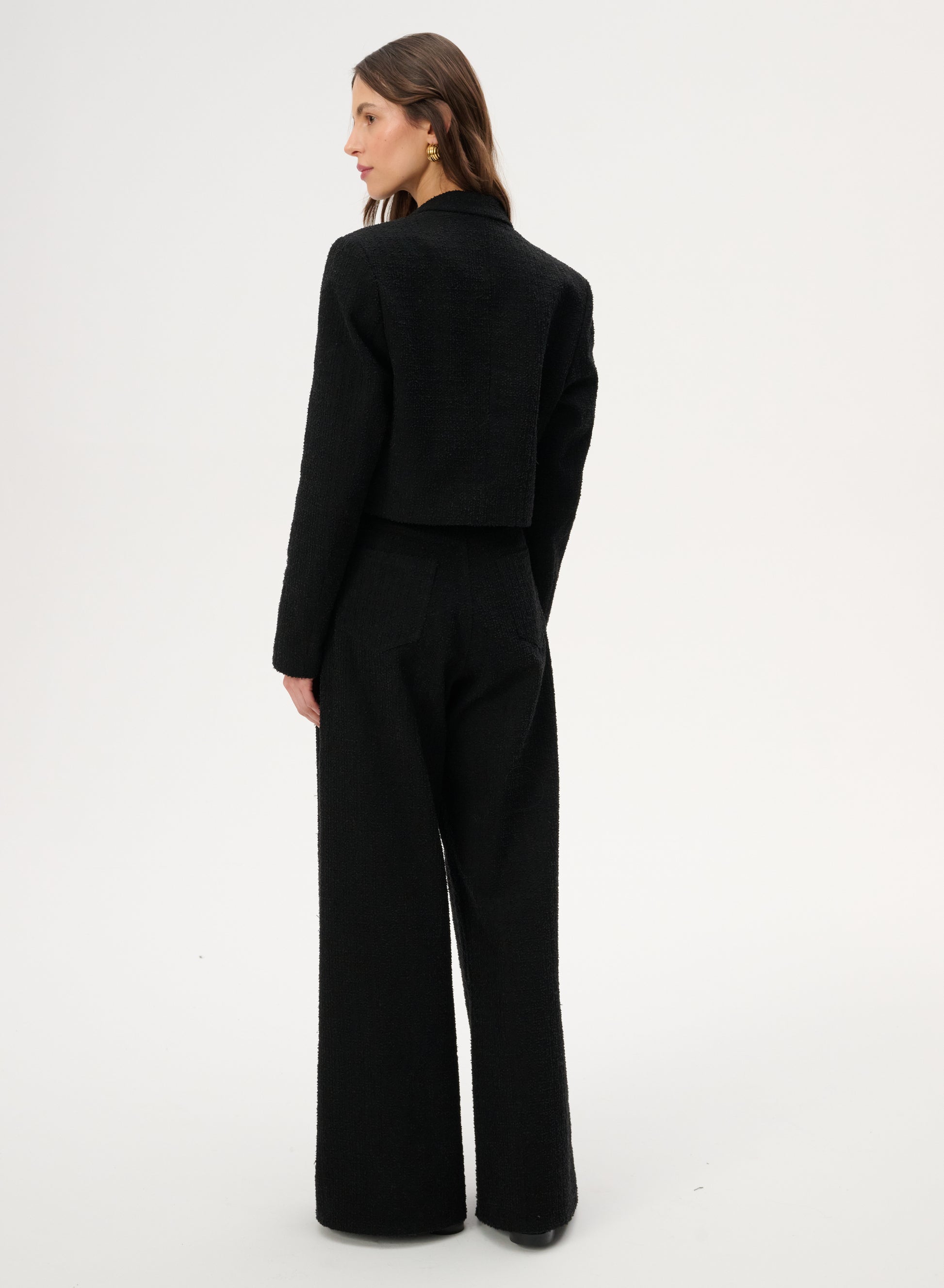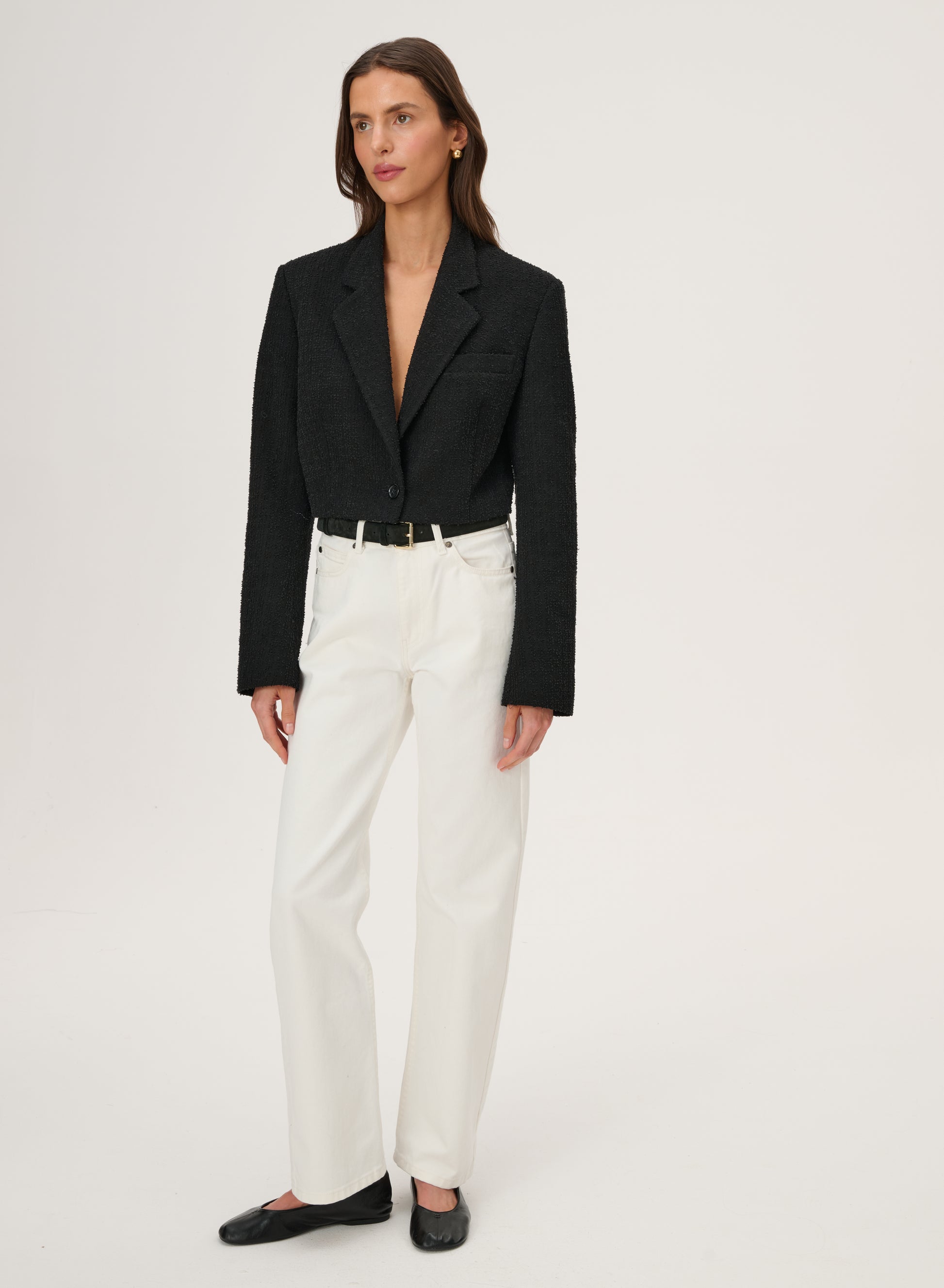 Krótka marynarka sięgająca talii wykonana z bawełny w kolorze czarnym. Posiada klasyczny kołnierz i zapięcie na pojedynczy guzik.