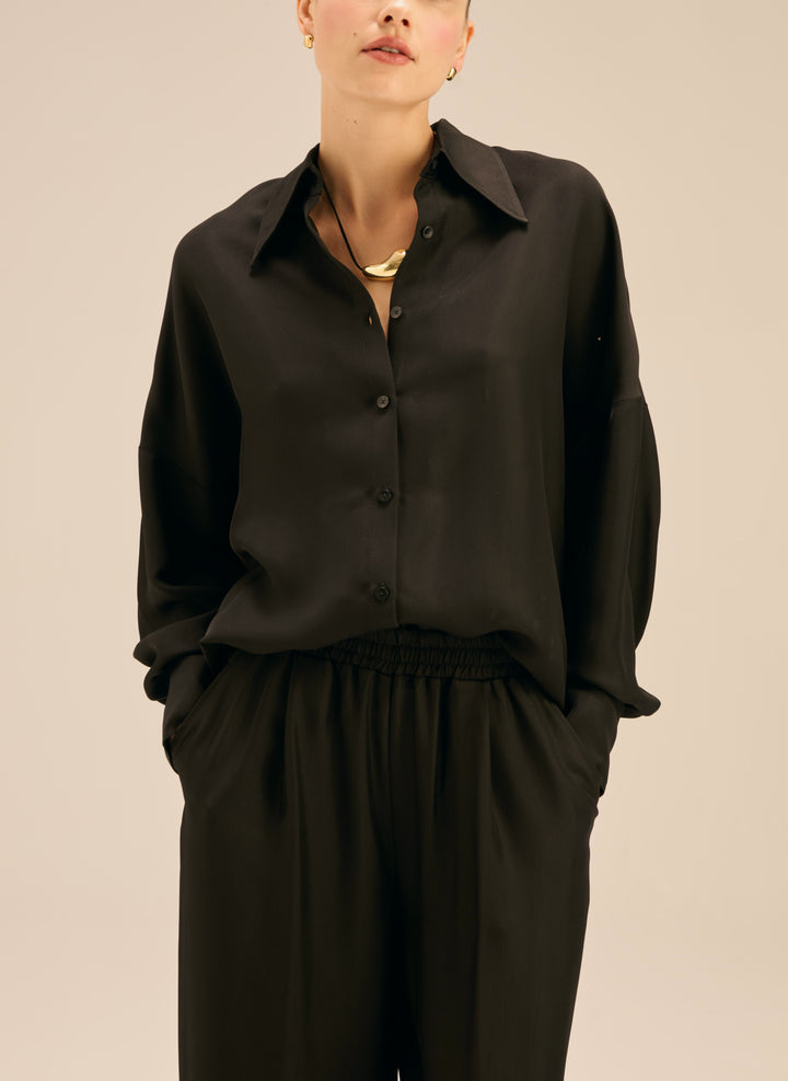 Spodnie o długich, szerokich nogawkach, wykonane z delikatnej, satynowej tkaniny w kolorze czarnym. Posiadają regularny stan, delikatne zaszewki, elastyczną talią.